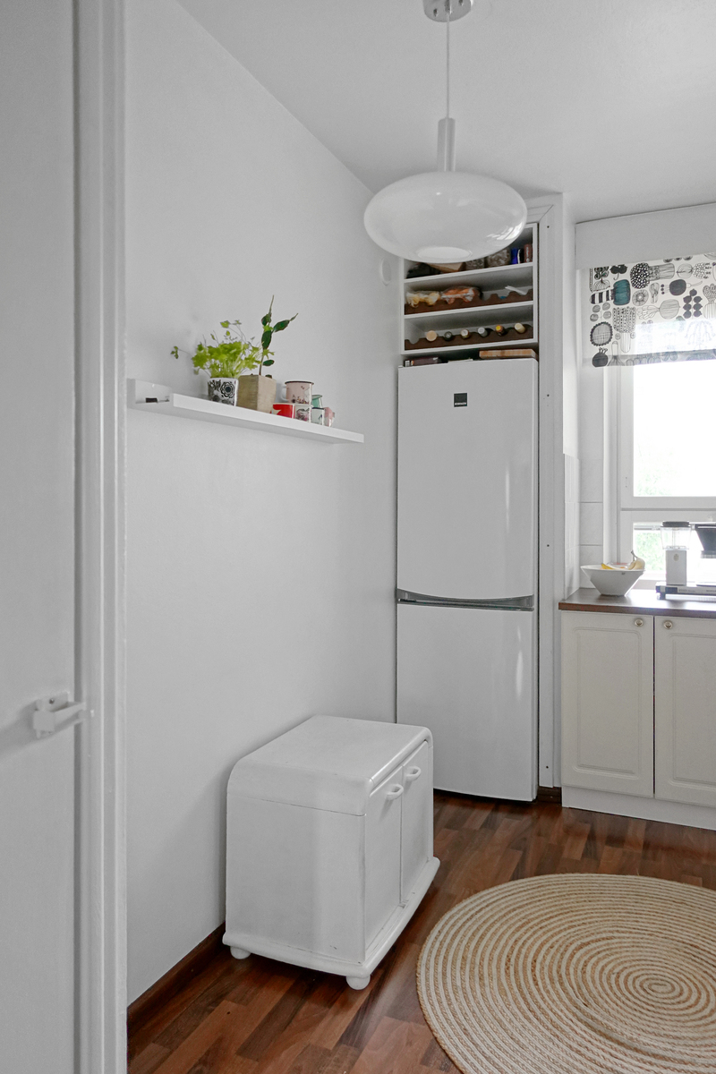 Laminaattilattia, maalatut seinät ja katto. Jääkaappi/pakastin, liesikupu, liesituuletin, astianpesukone, sähköliesi.