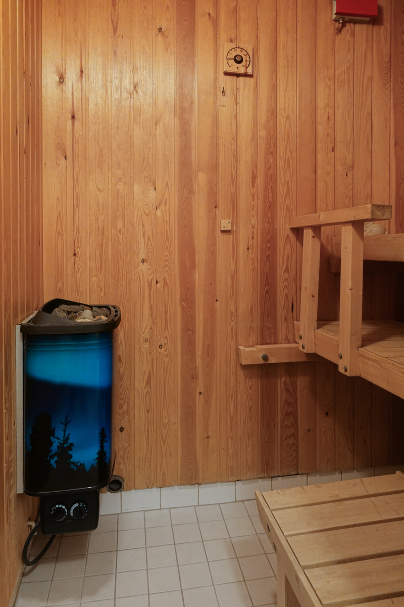 Laatoitettu lattia, paneeliseinät ja -katto. Kiuas uusittu 90-luvulla. |
