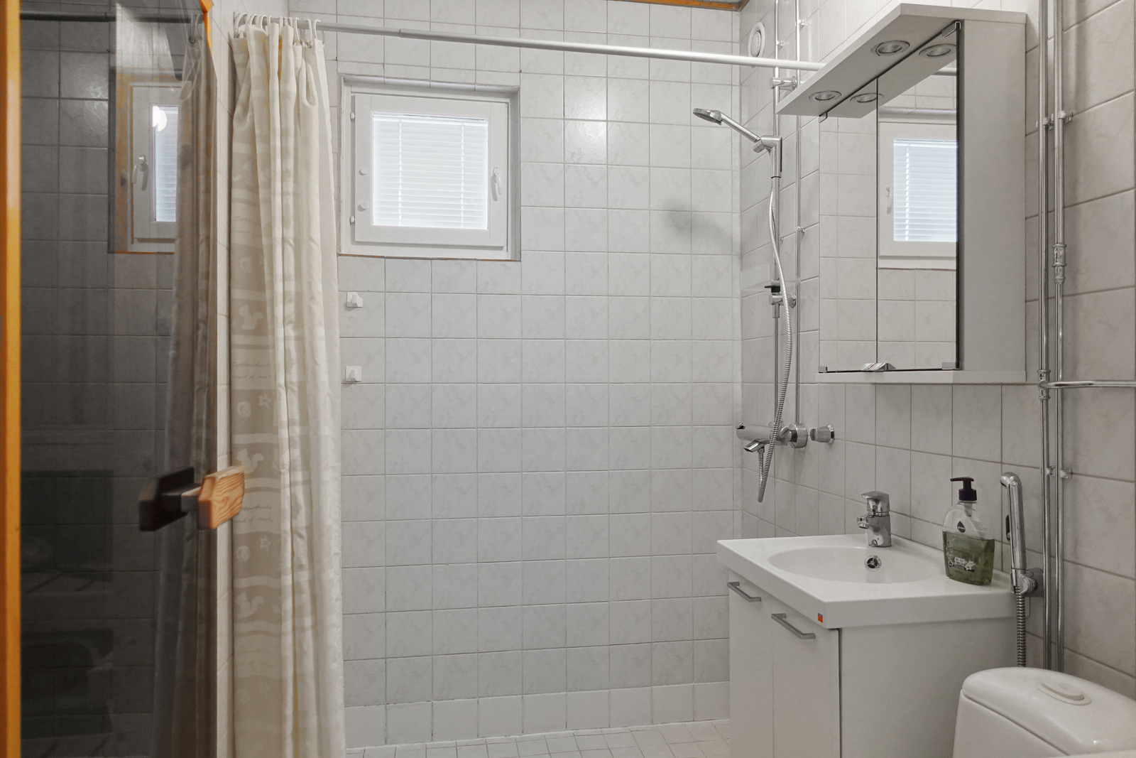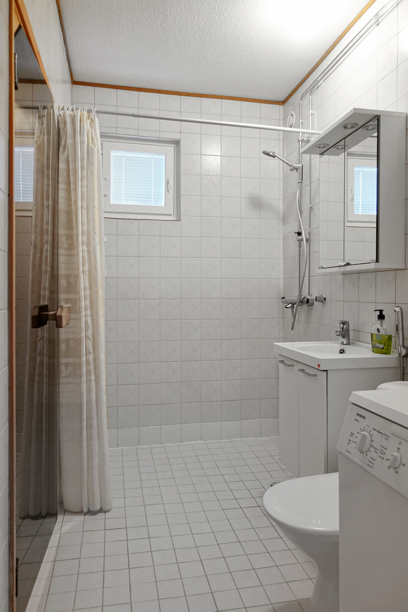 Laatoitettu lattia ja seinät. Pesukoneliitäntä, allaskaappi, peilikaappi. Kylpyhuone uusittu 80-90-luvun seuduilla. |