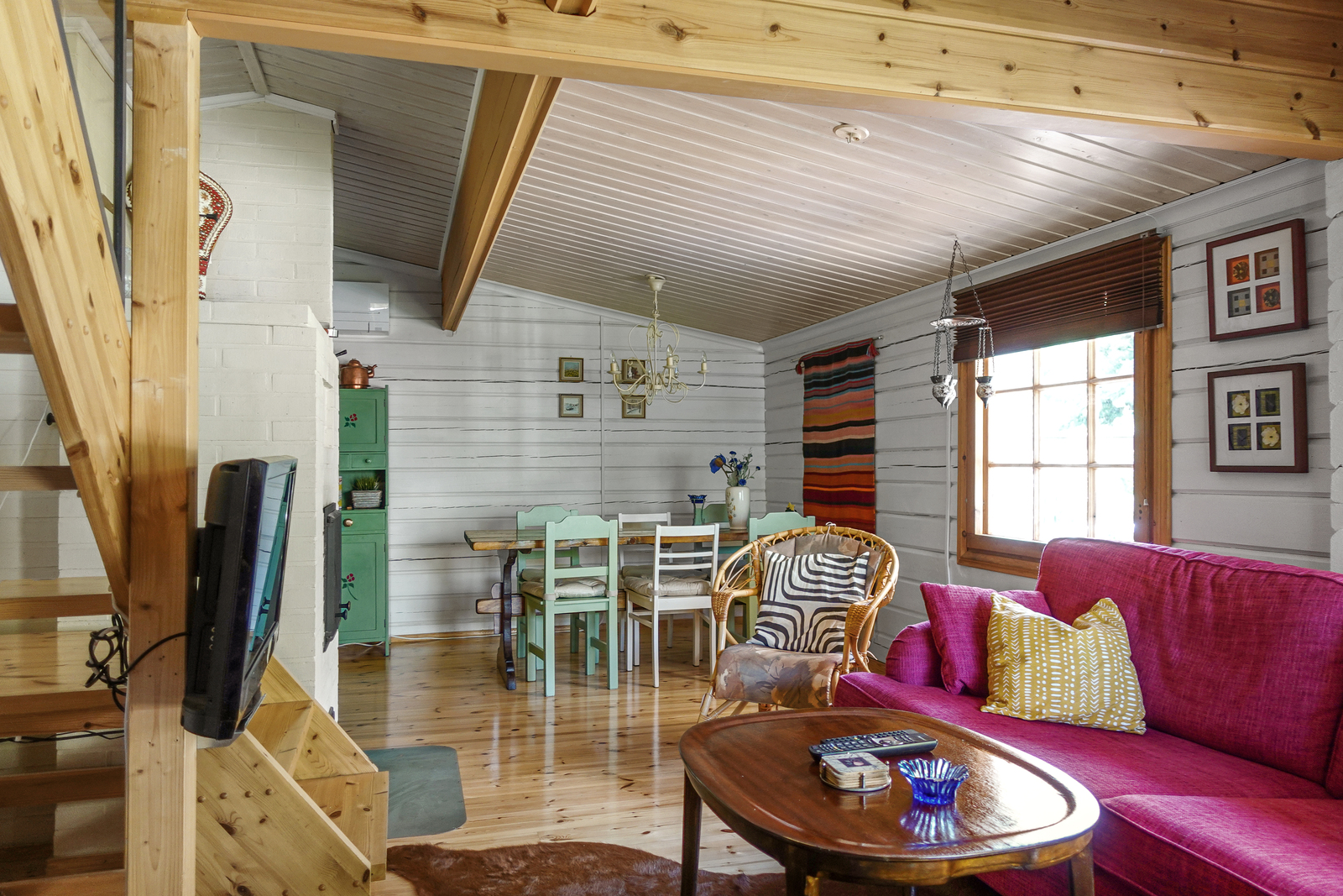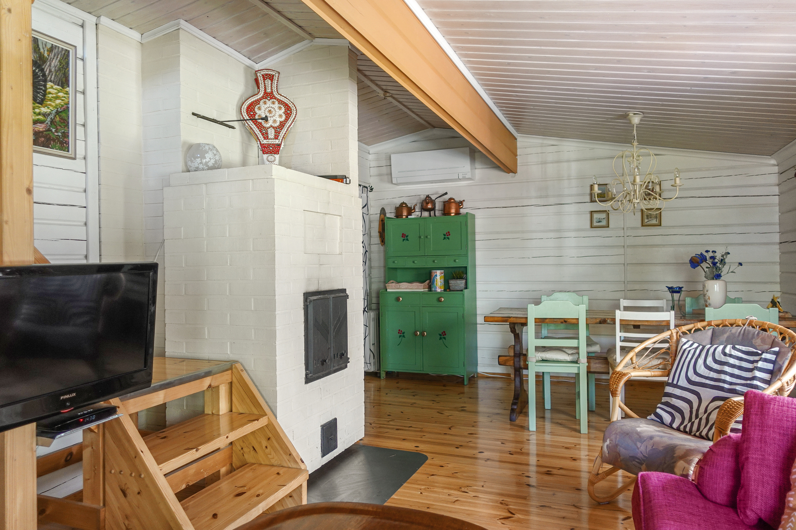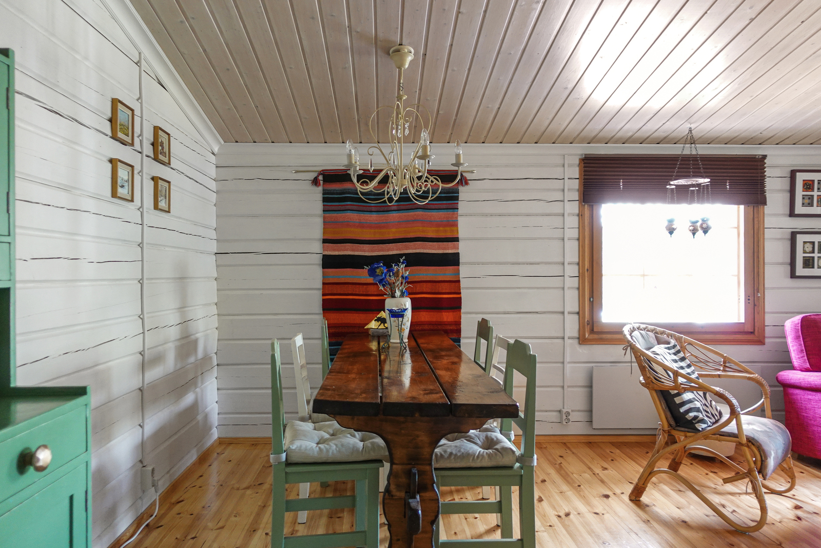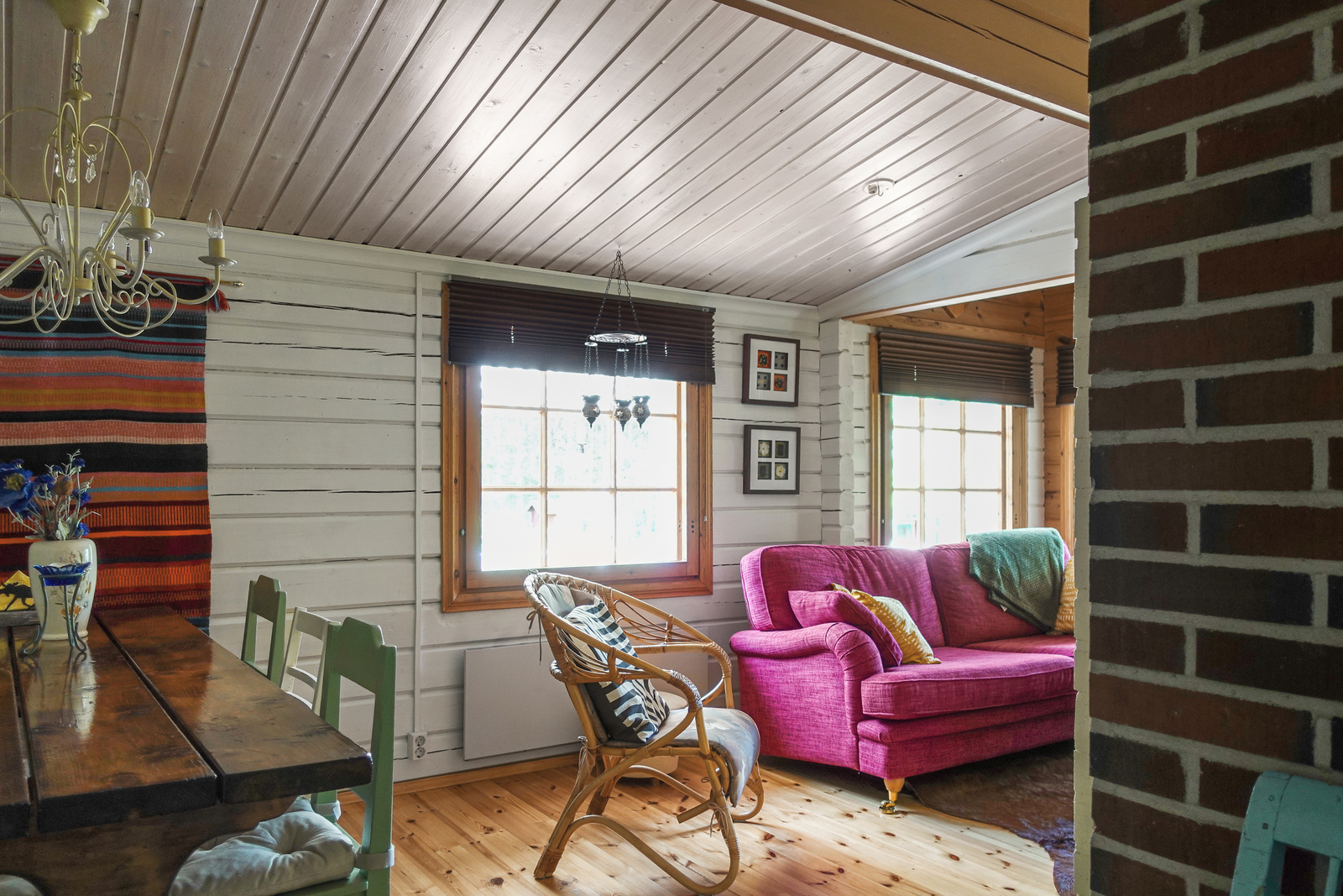 Olohuoneen kuvaus | Lautalattia, hirsiseinät/hirsipaneeli, maalattu paneelikatto, varaavatakka, ilmalämpöpumppu, |