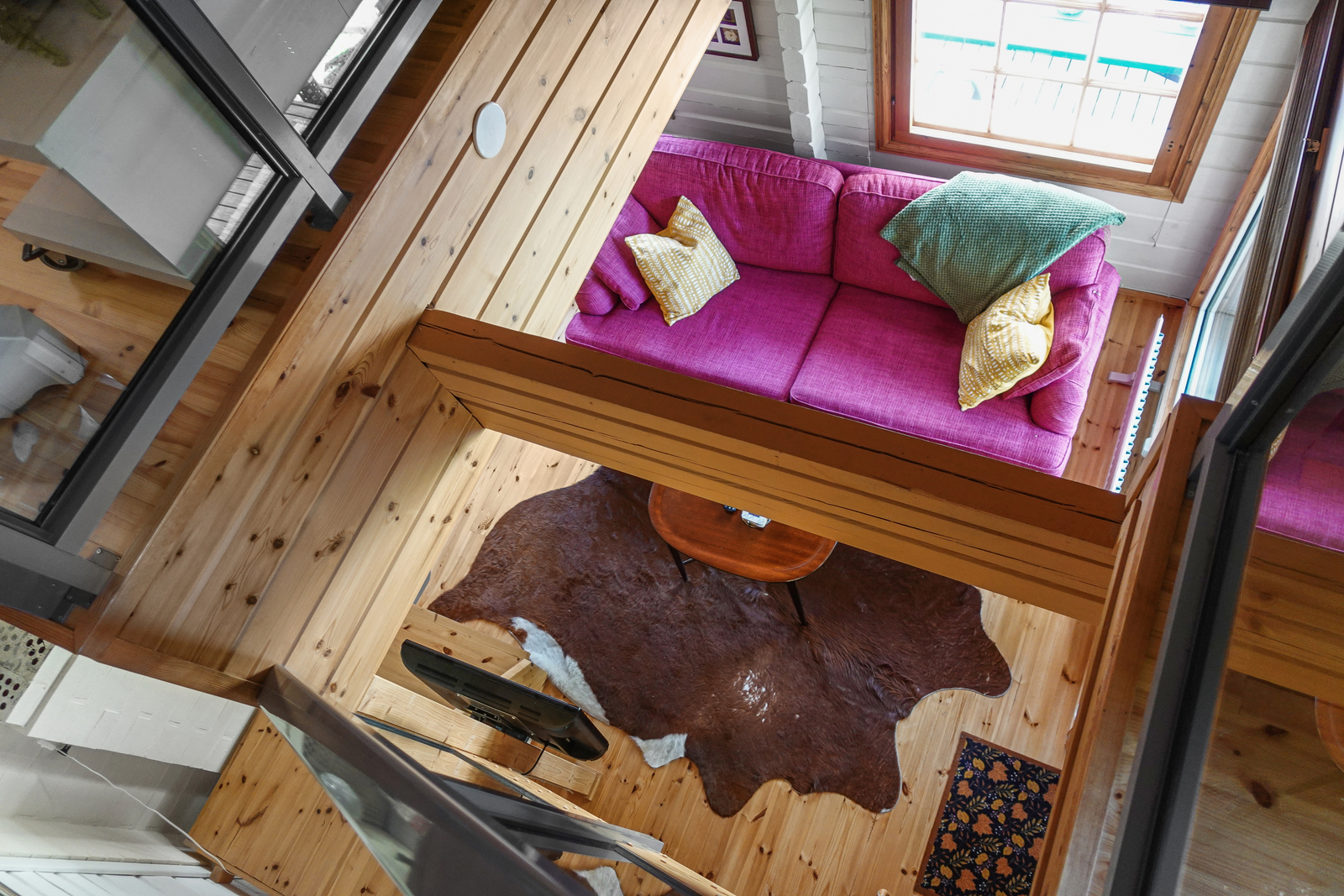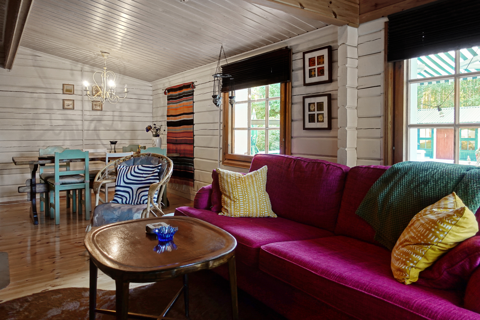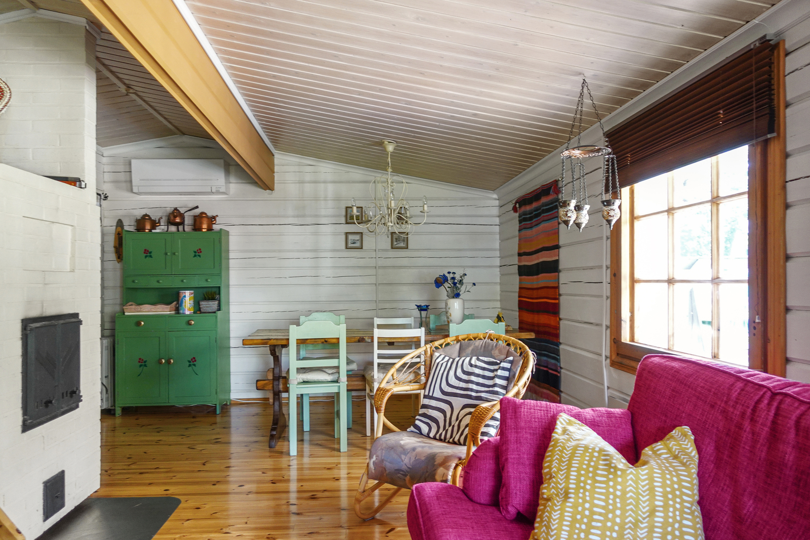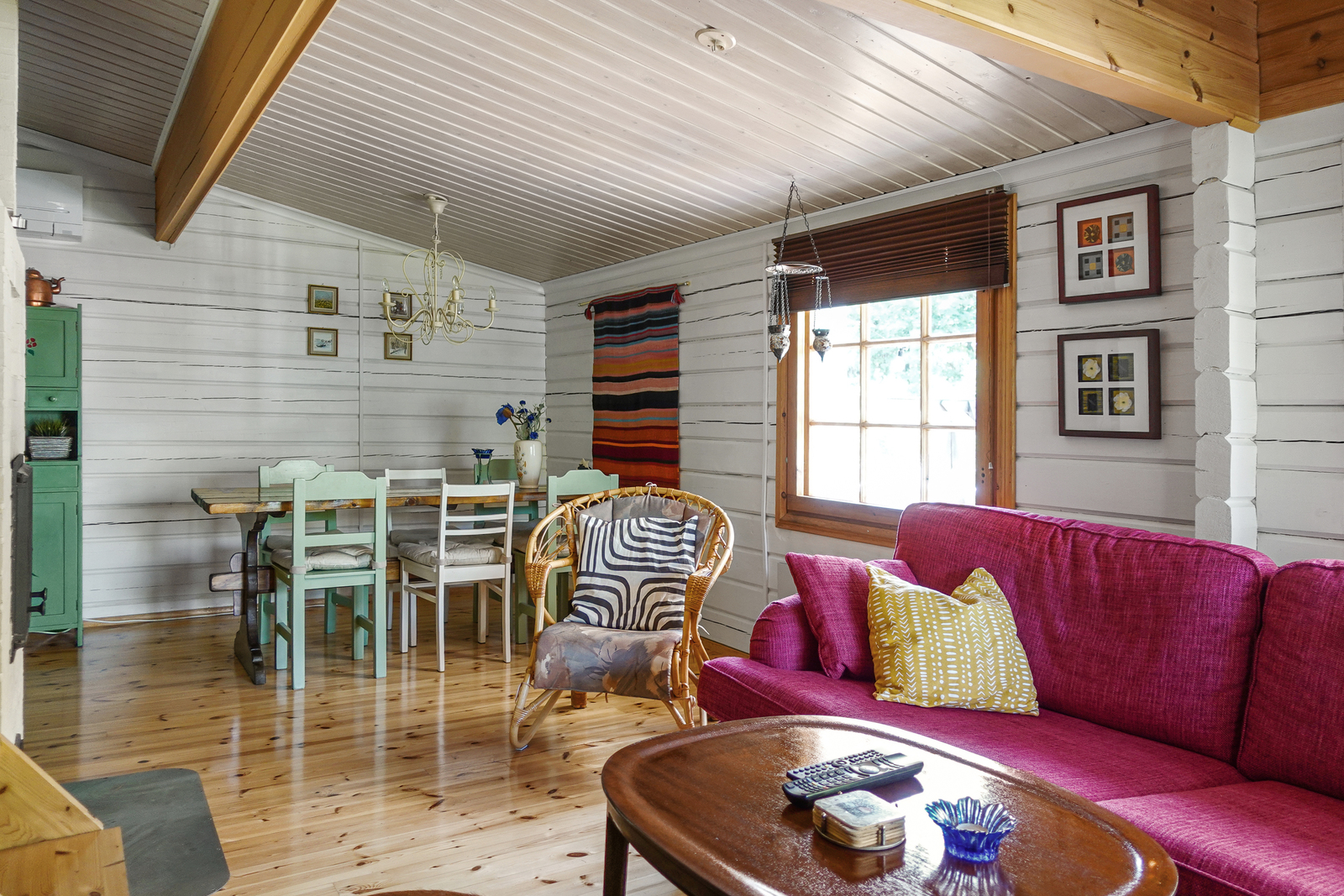 Olohuoneen kuvaus | Lautalattia, hirsiseinät/hirsipaneeli, maalattu paneelikatto, varaavatakka, ilmalämpöpumppu, |