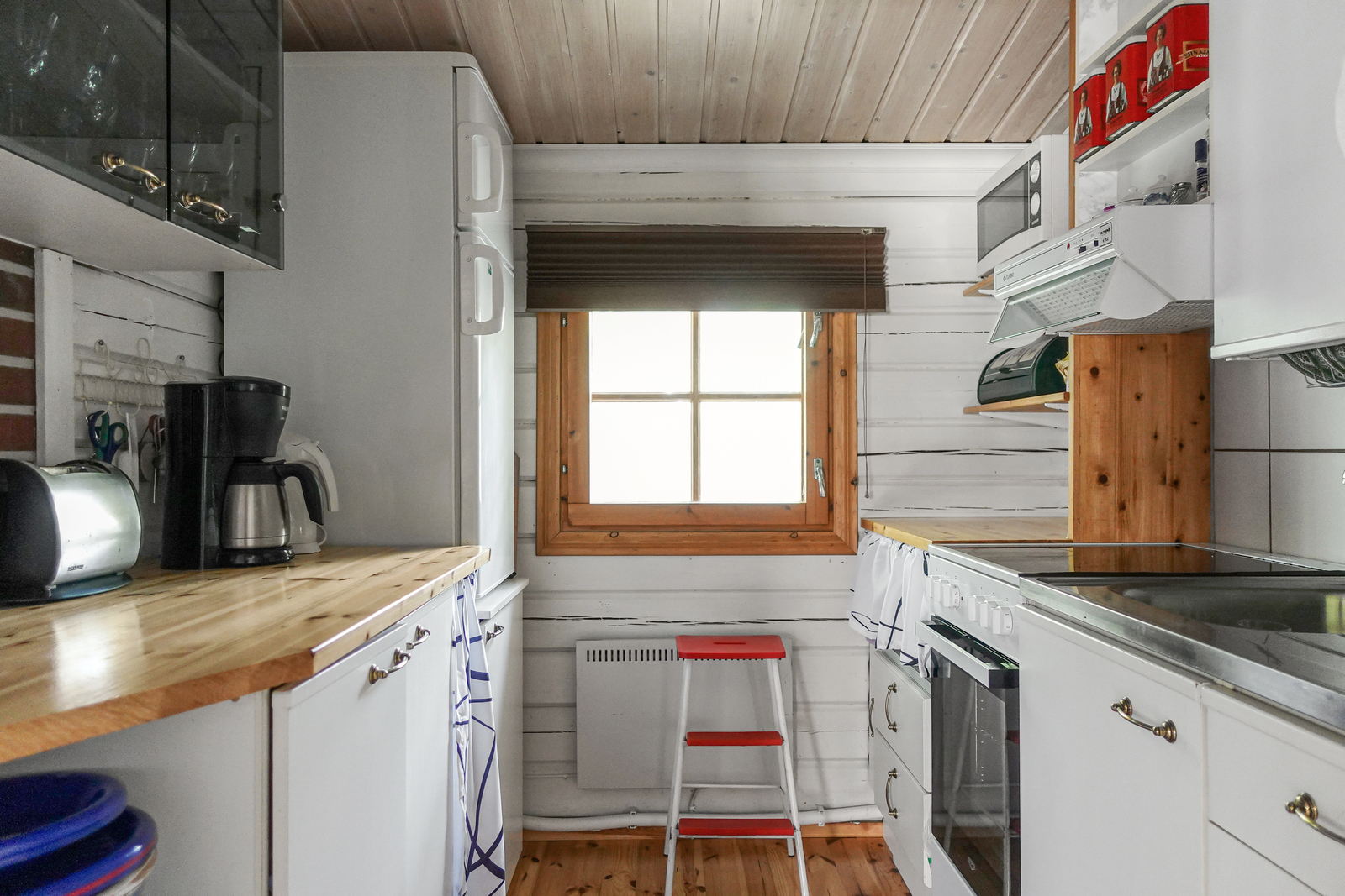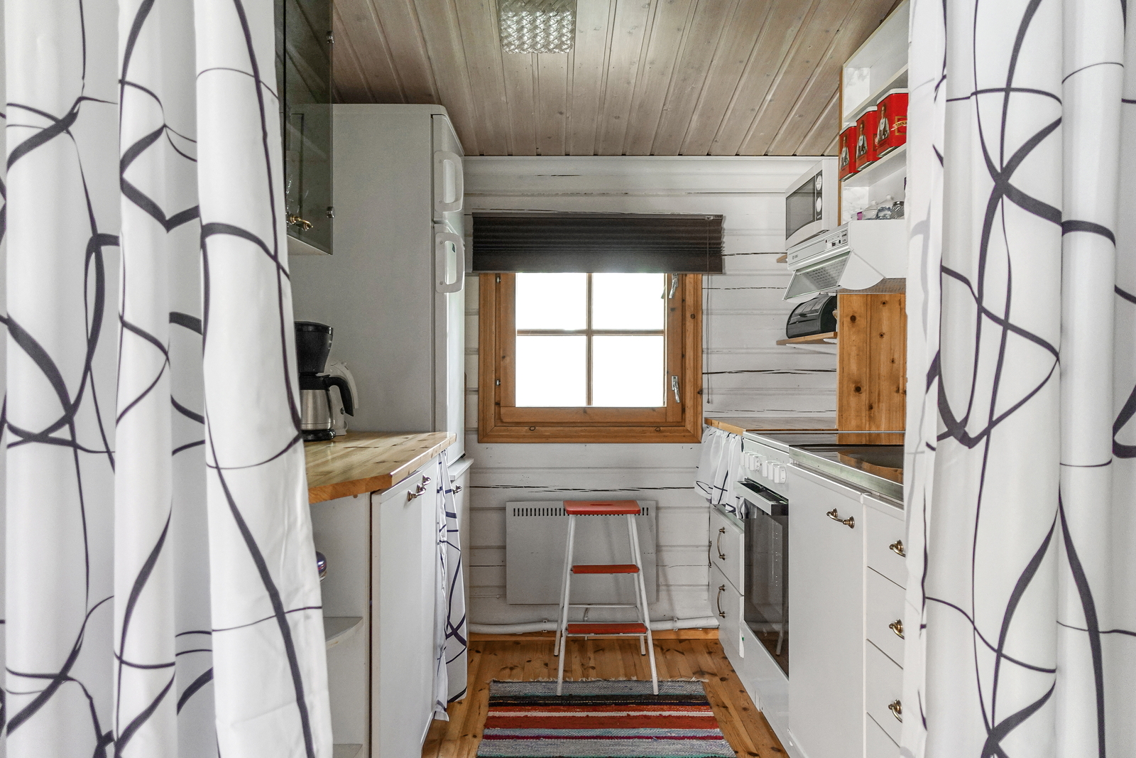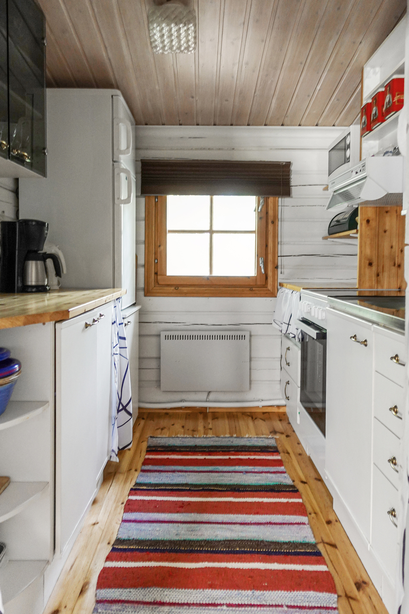 Keittiön kuvaus | Lautalattia, hirsiseinät, paneelikatto, jenkkikaappi, keraaminen liesi, tiskipöytä, kaapistot |
