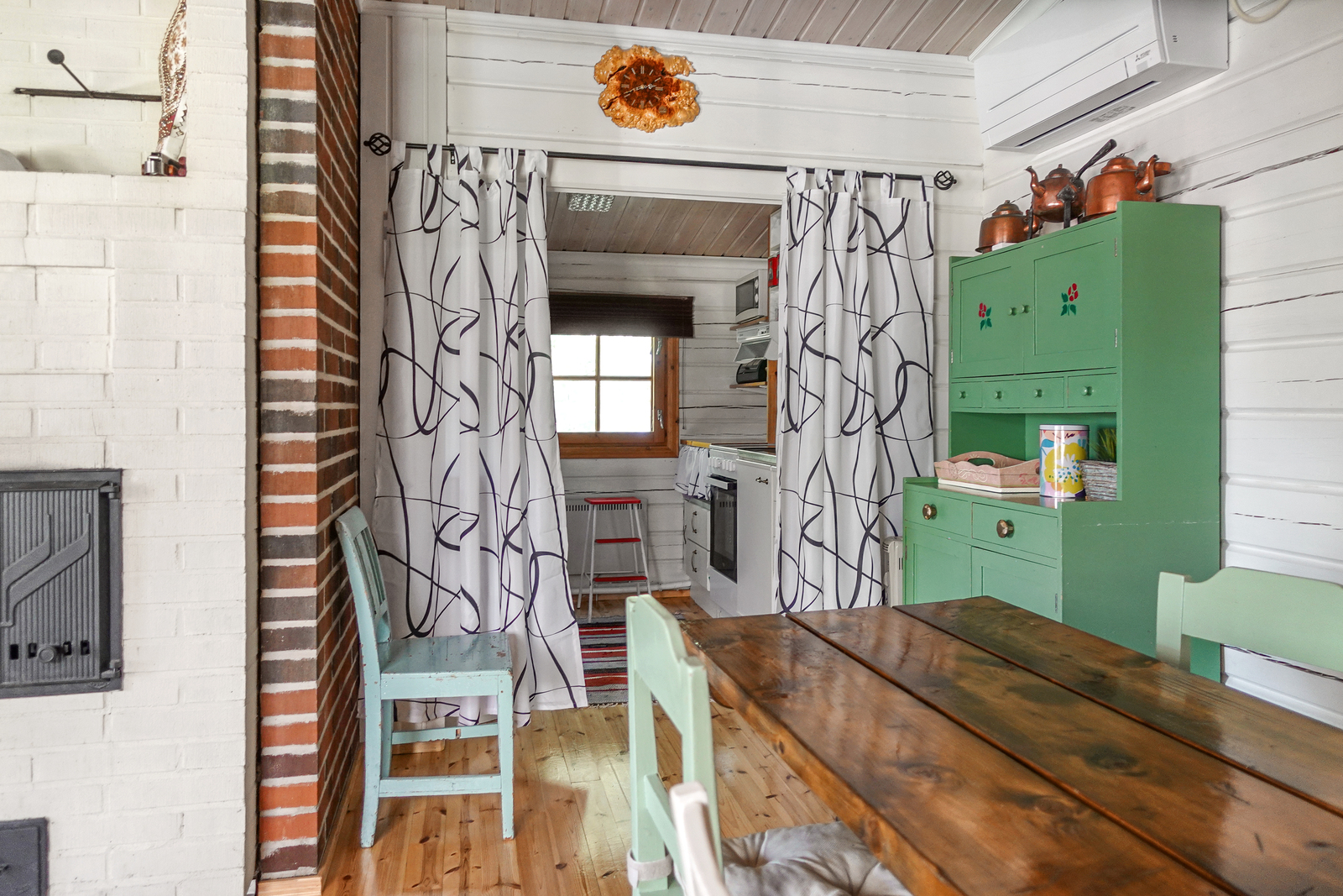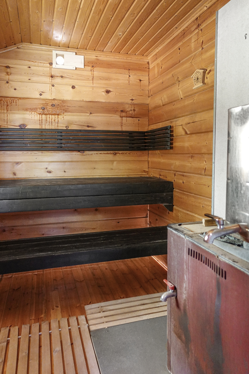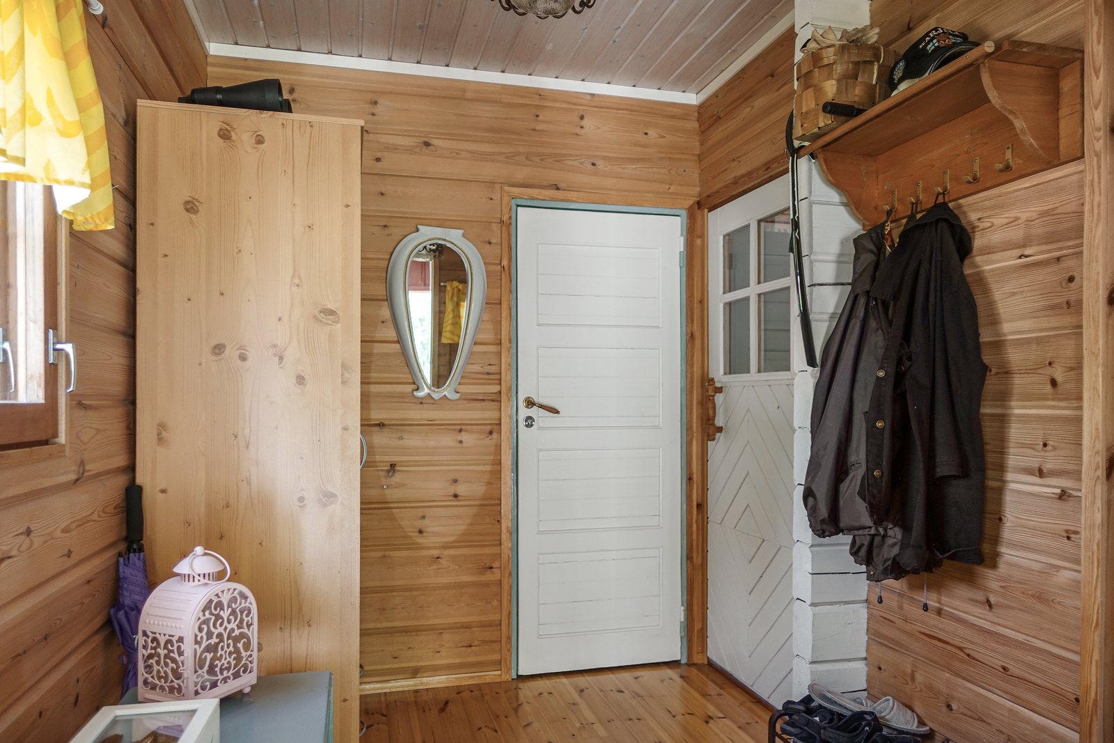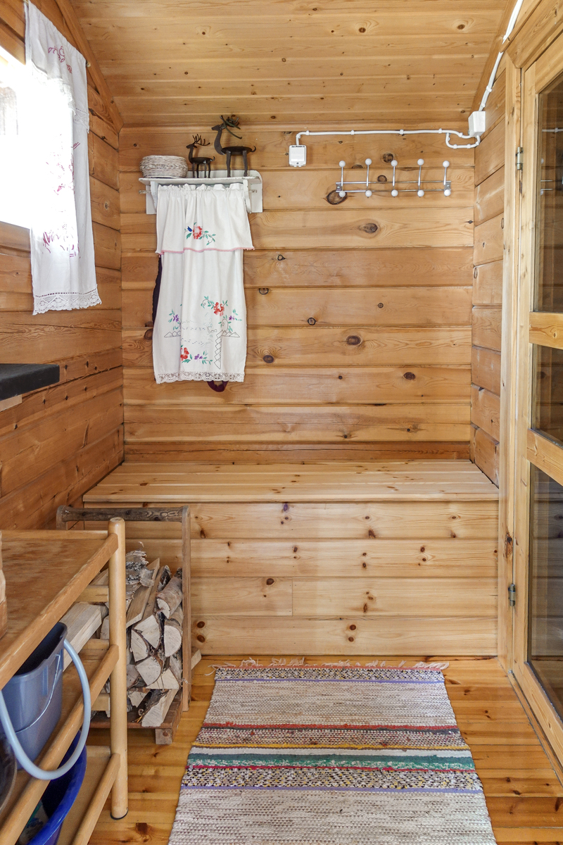 Lisätietoja | Pukuhuone: lautalattia, hirsiseinät, paneelikatto. Eteinen: hirsiseinät, maalattu paneelikatto, lautalattia, naulakko. |