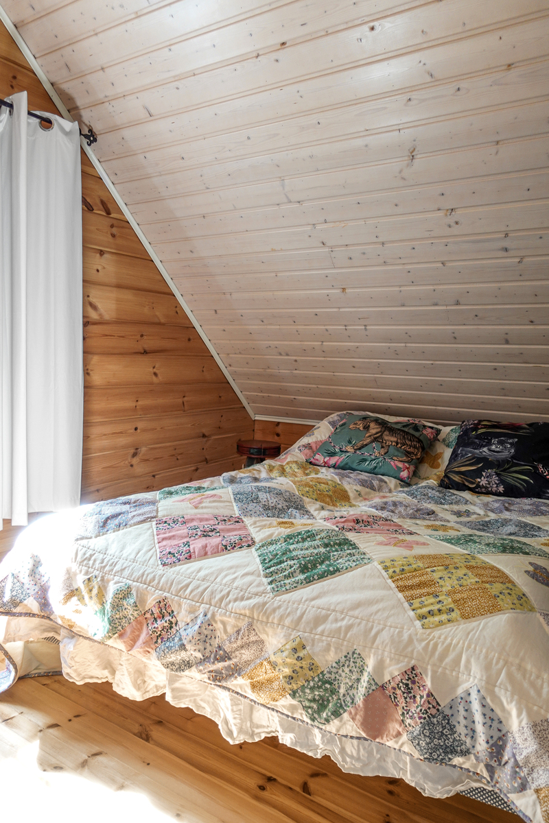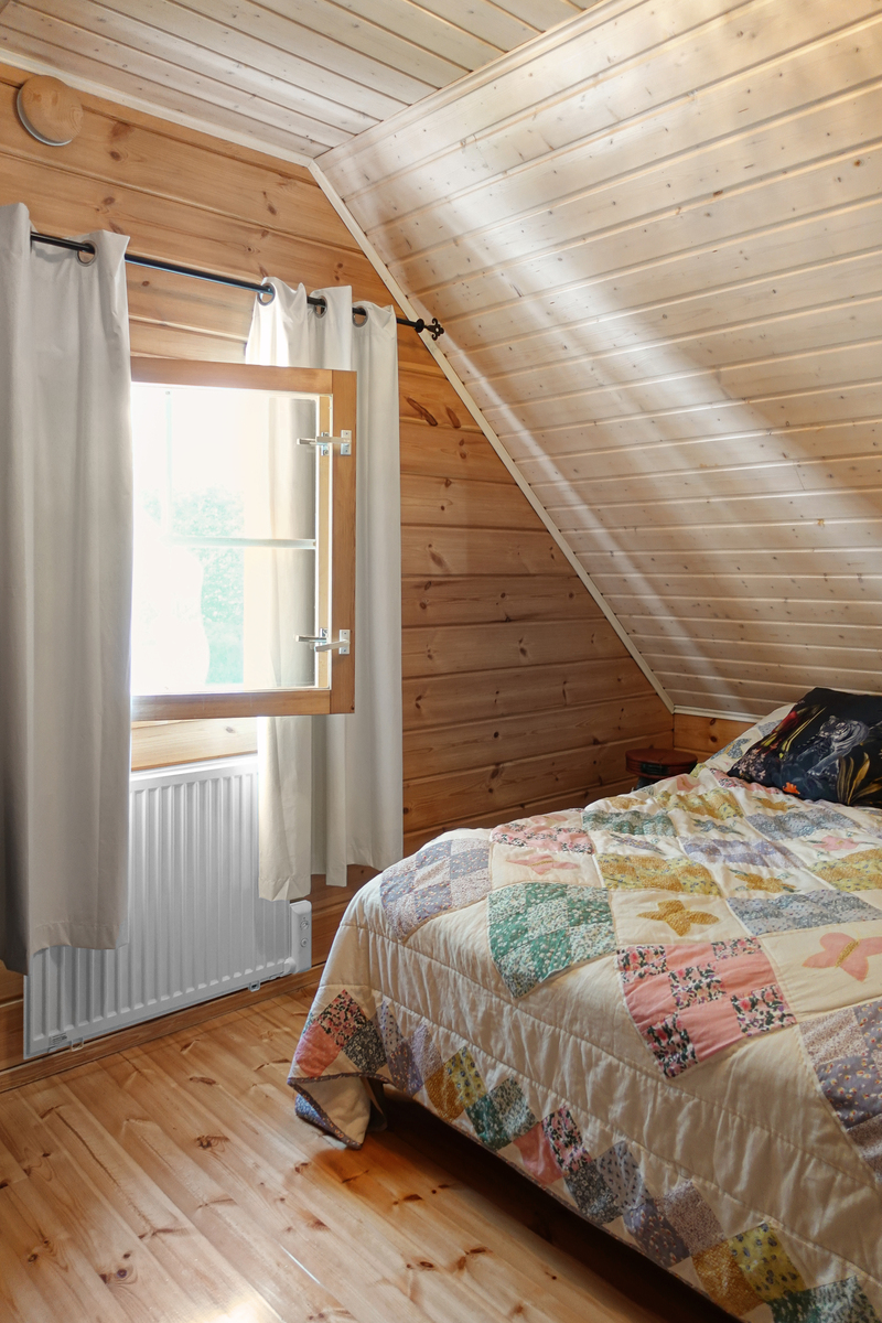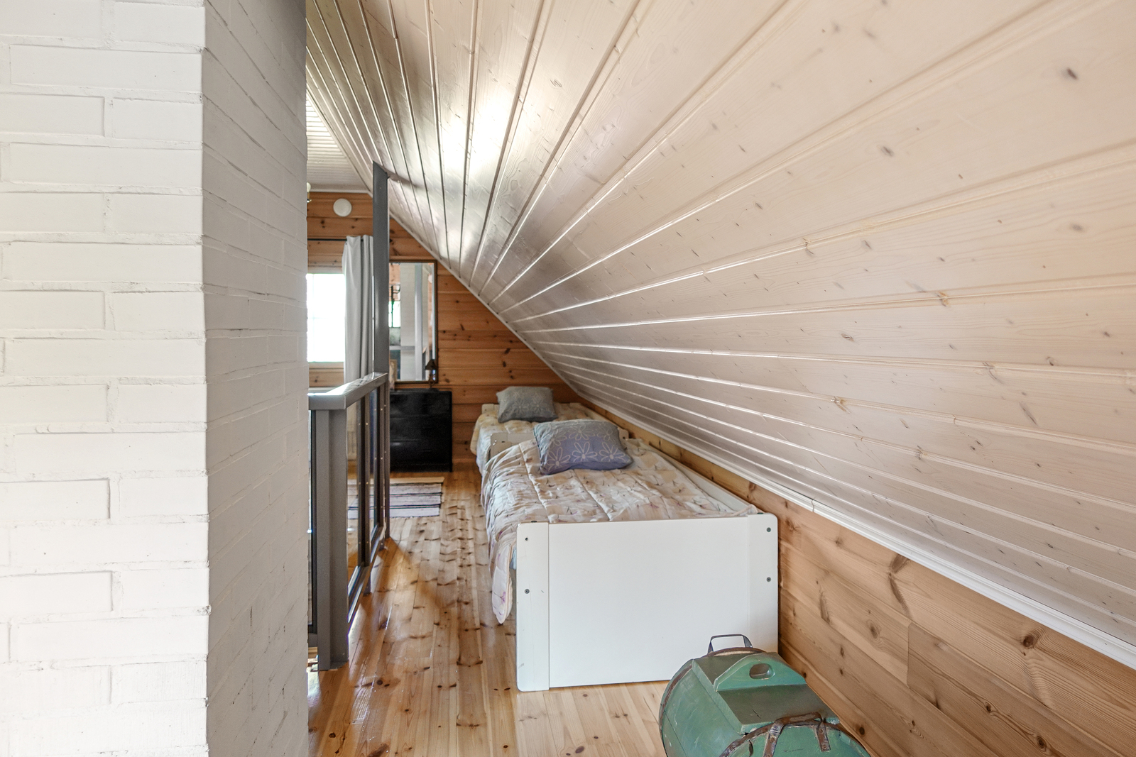 Makuuhuoneiden kuvaus | Makuutilat yläkerrassa: lautalattia, hirsiseinät / hirsipaneeli, maalattu paneelikatto |