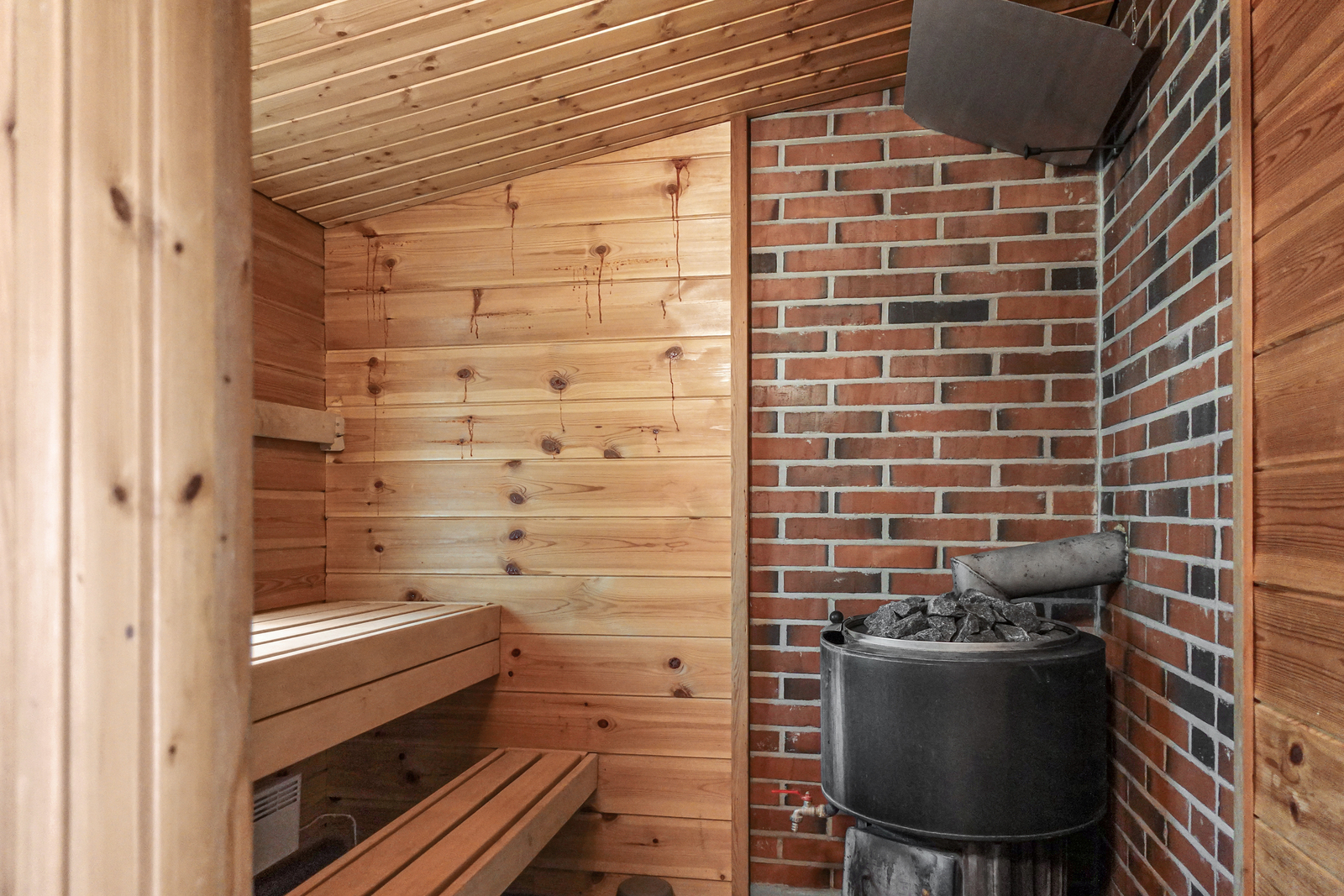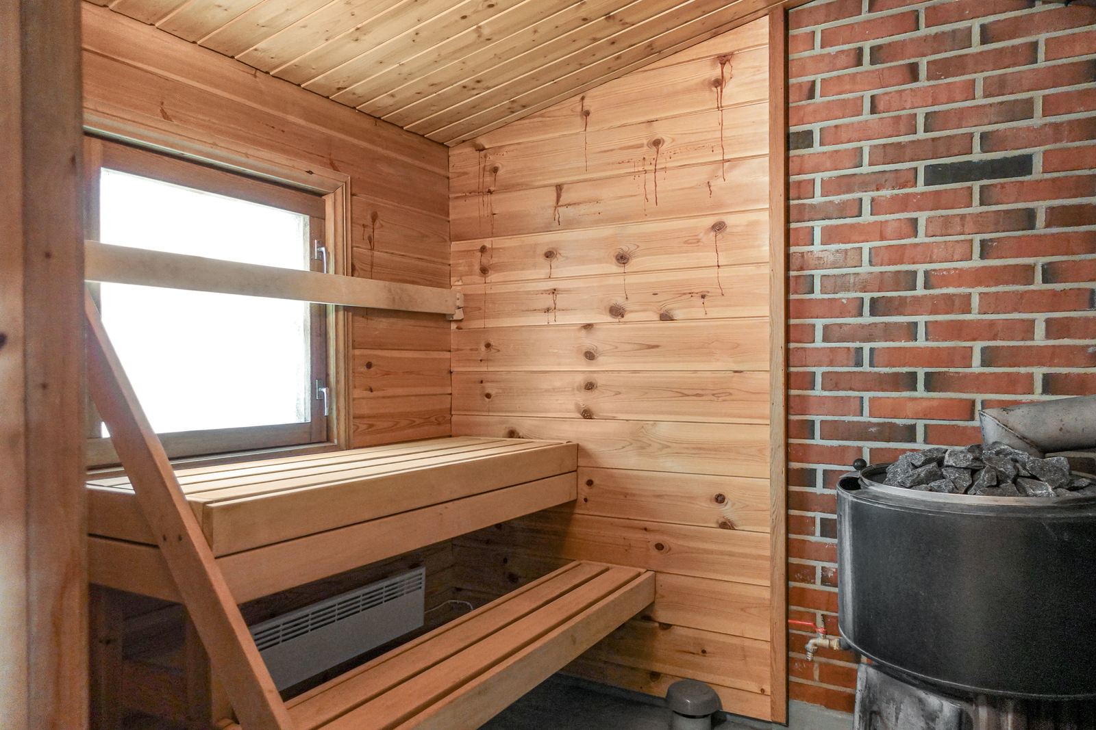 Sauna | Lattia lasikuitupinnalla, seinät tiili/hirsi, paneelikatto. |