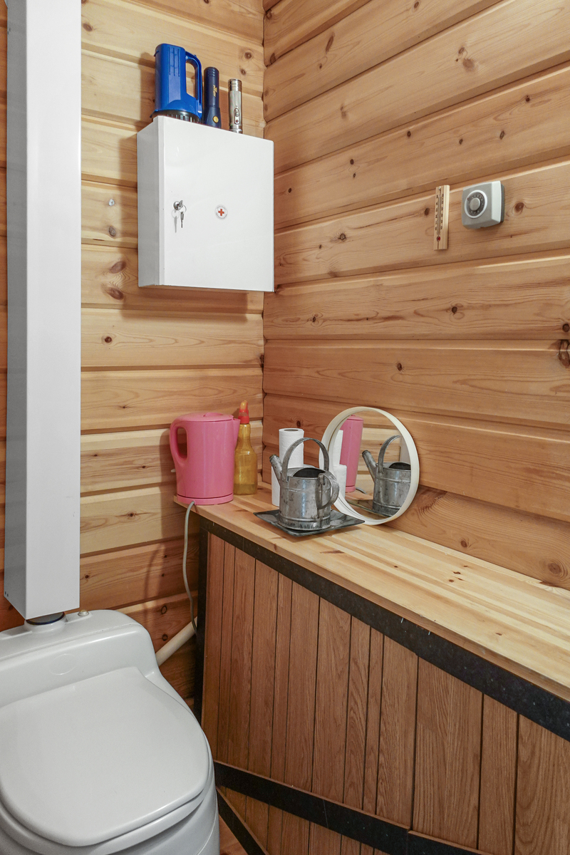 WC | Separet 9000 wc: Hirsiseinät, paneelikatto, lautalattia, wc-istuin, pesuallas, peili, kaapisto. |