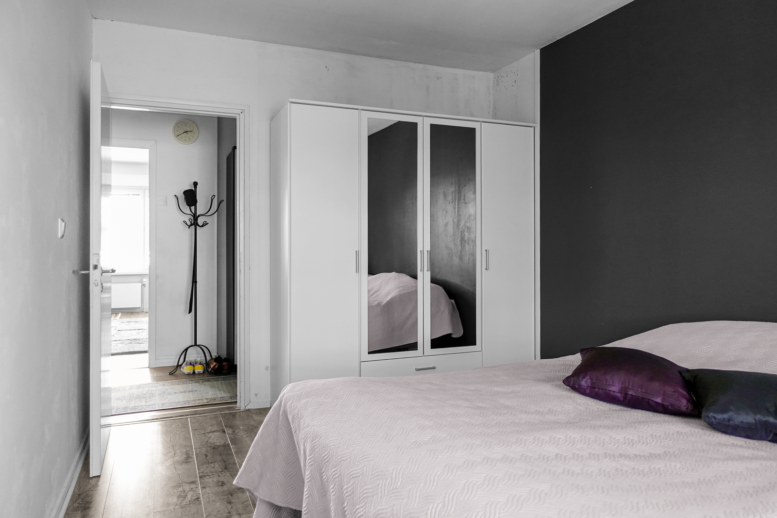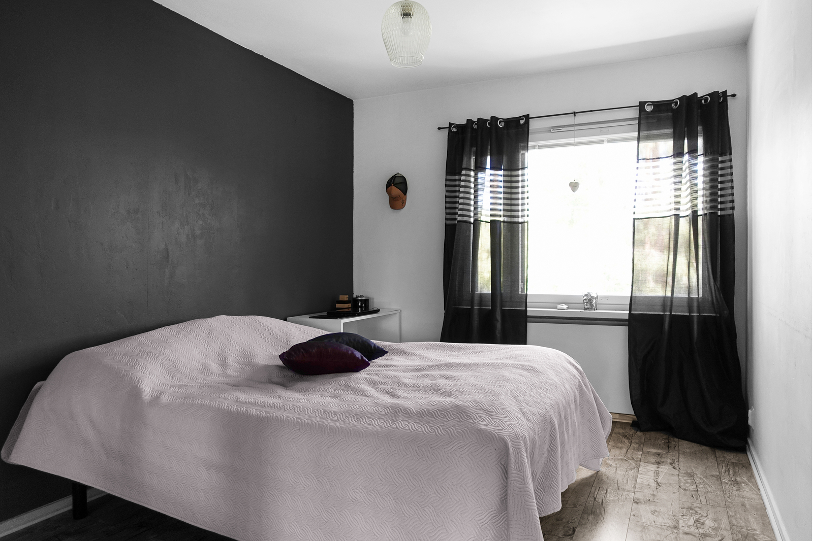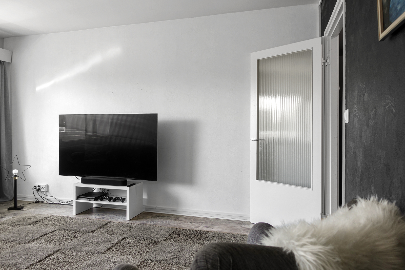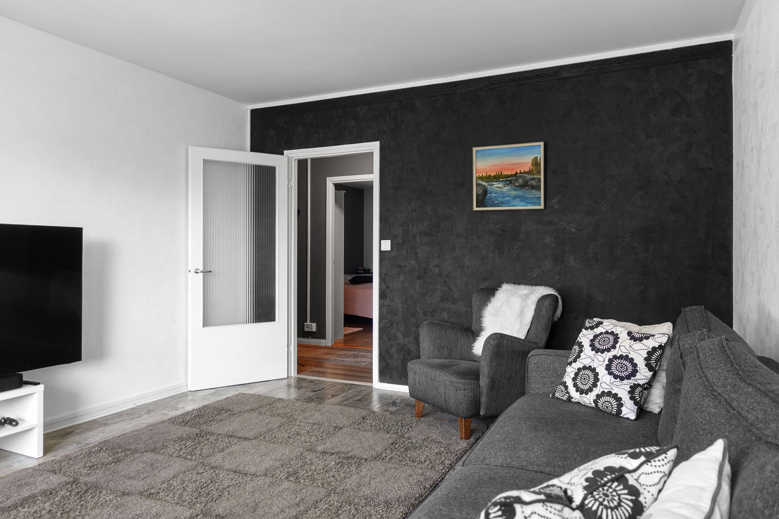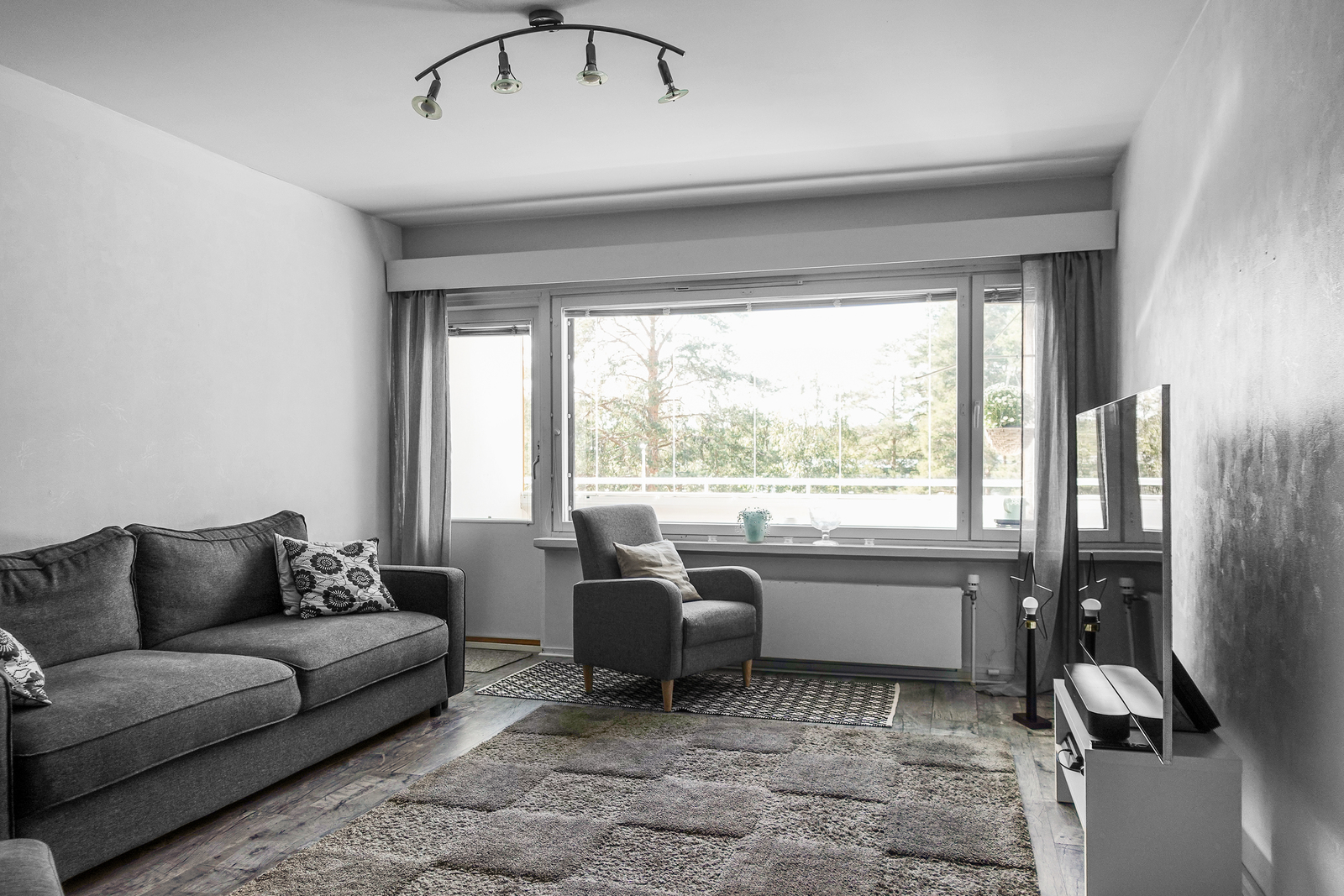 Laminaattilattia, maalatut seinät ja katto. Olohuoneesta käynti parvekkeelle. |