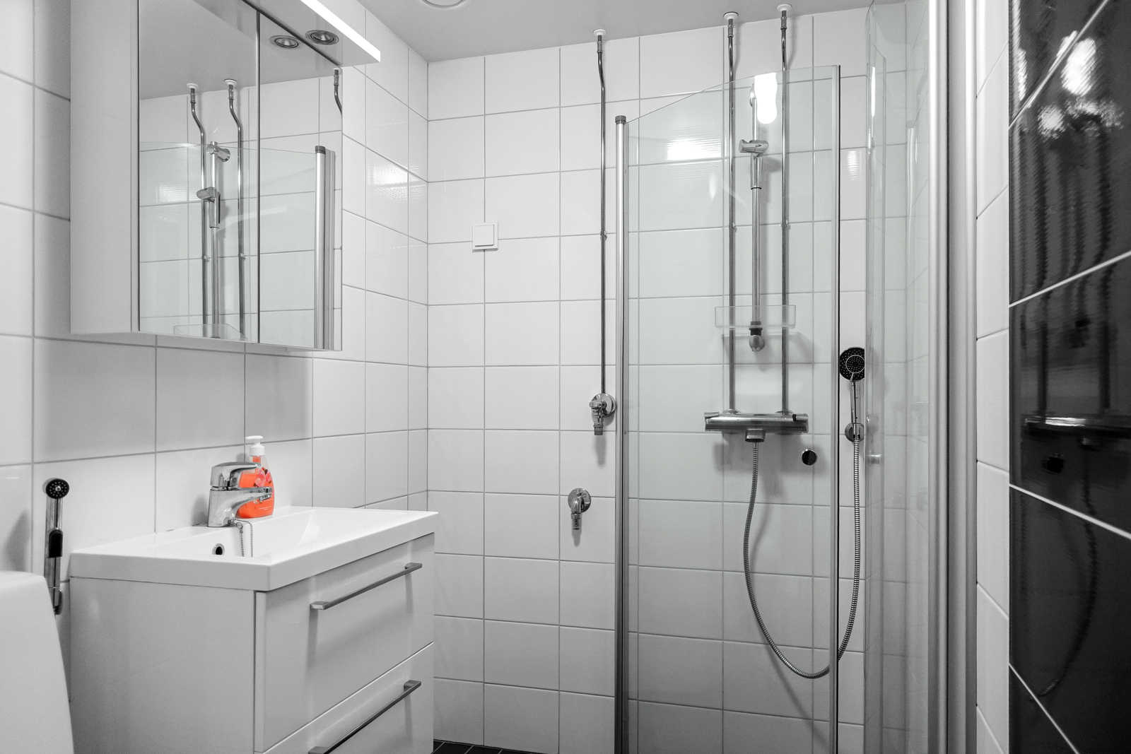 Laatoitettu lattia ja seinät, pesukoneliitäntä, allaskaappi, peilikaappi. |