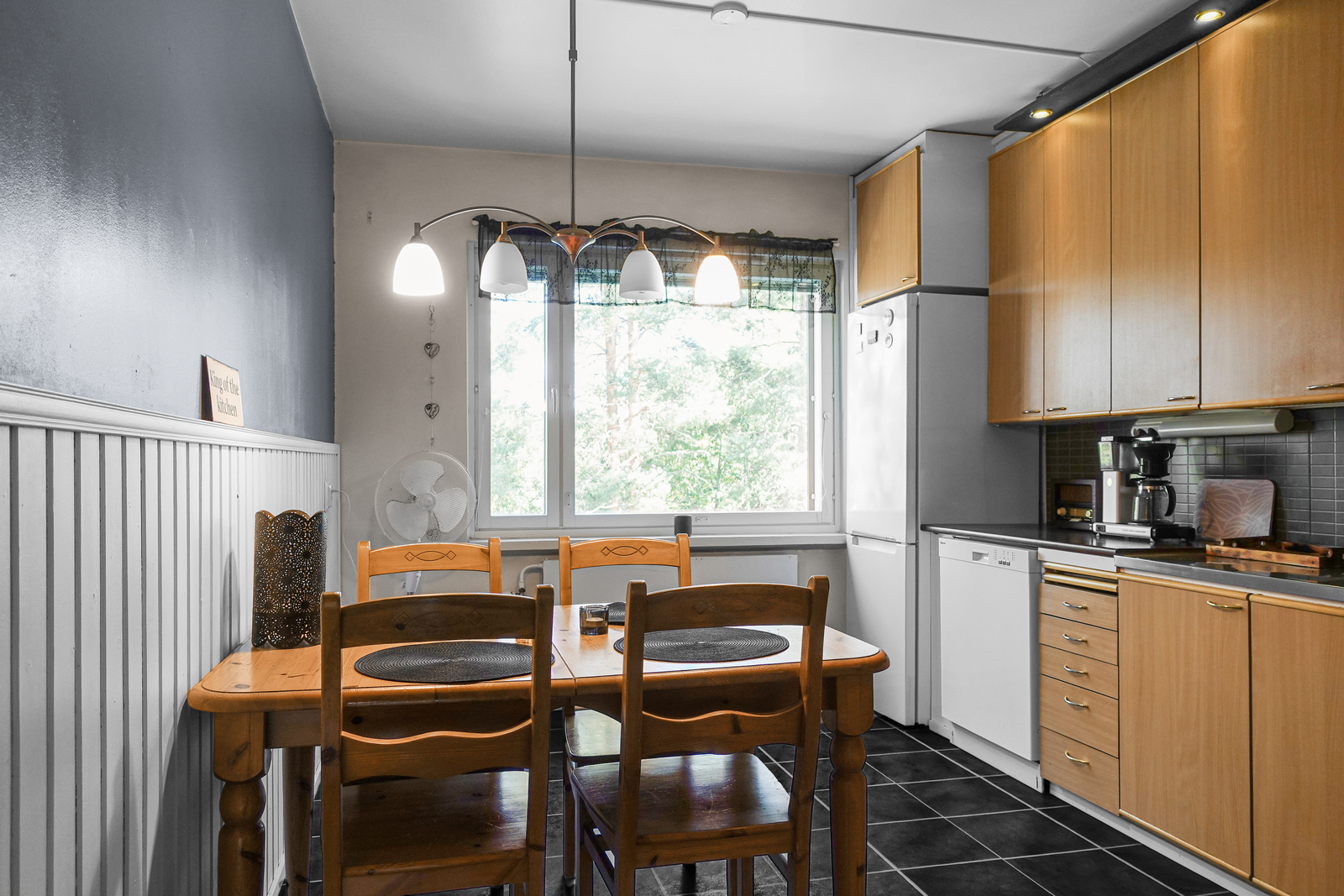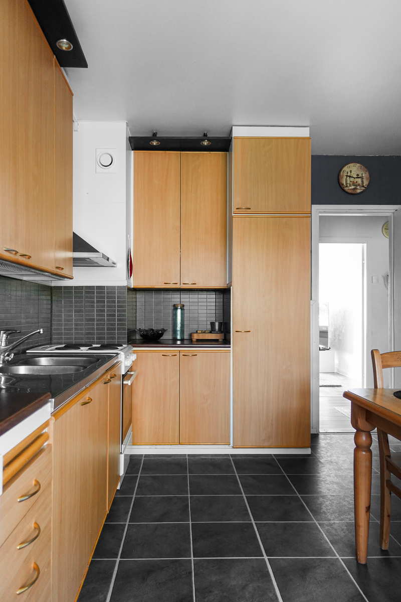 Jääkaappi/pakastin, astianpesukone, uuni, liesi, liesituuletin (ei omaa hormia). Laminaattilattia, maalatut seinät ja katto. |