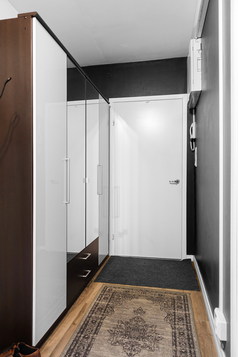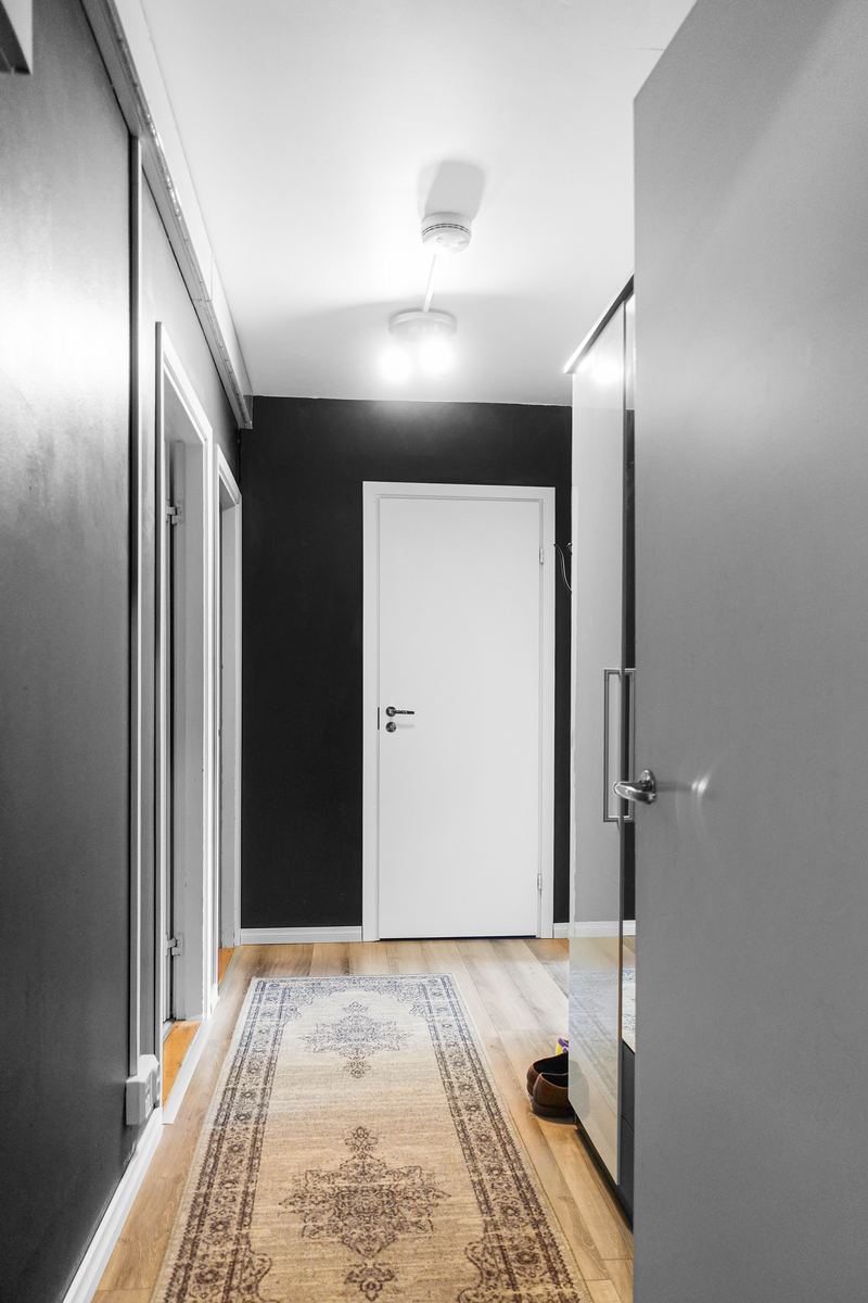 Eteisessä laminaattilattia, maalatut seinät ja katto sekä kaapisto. |
