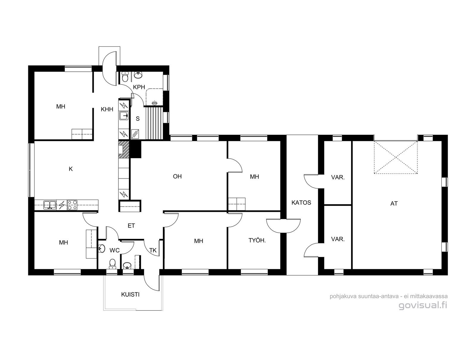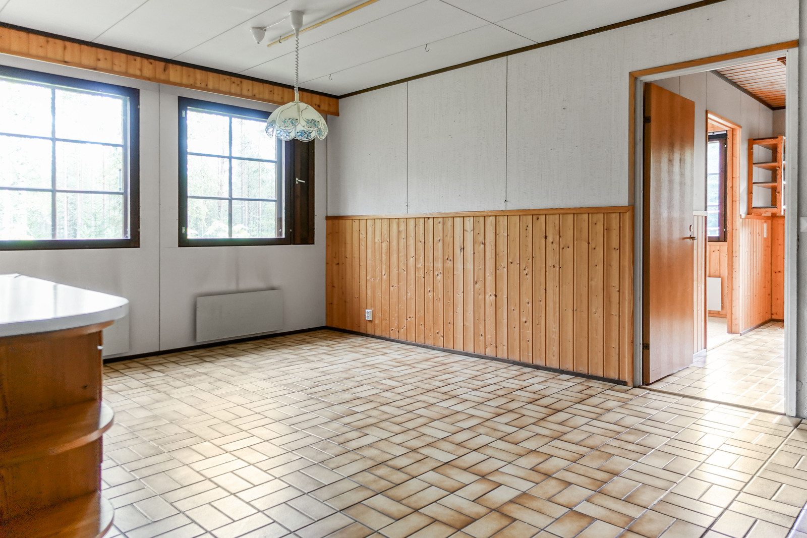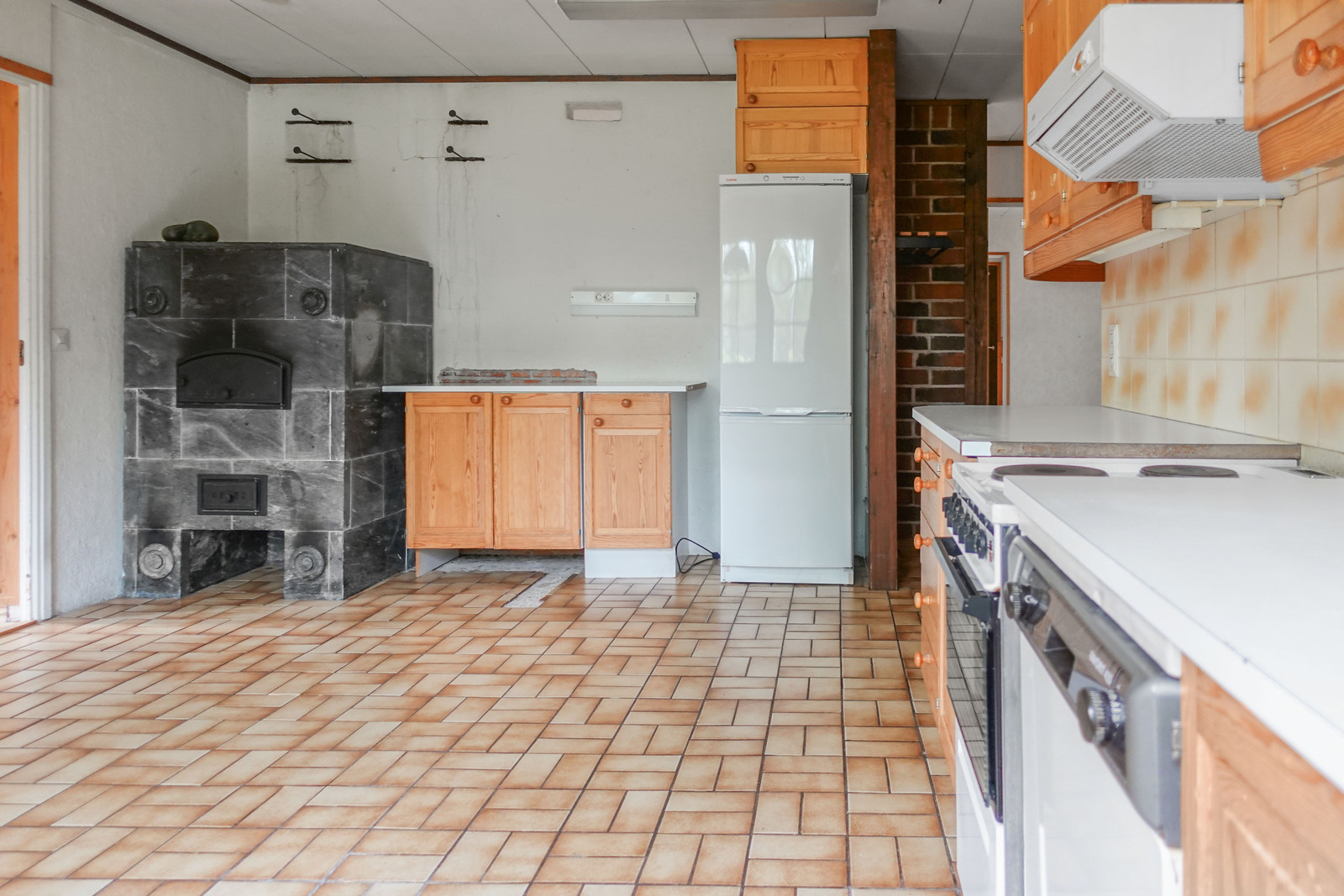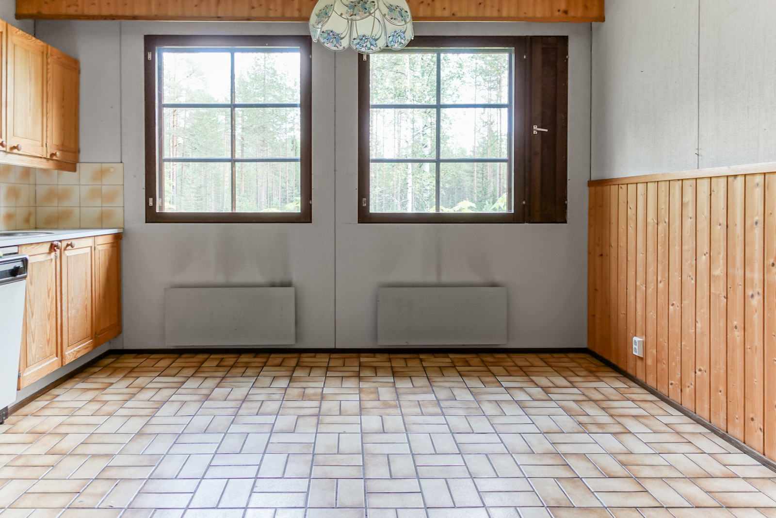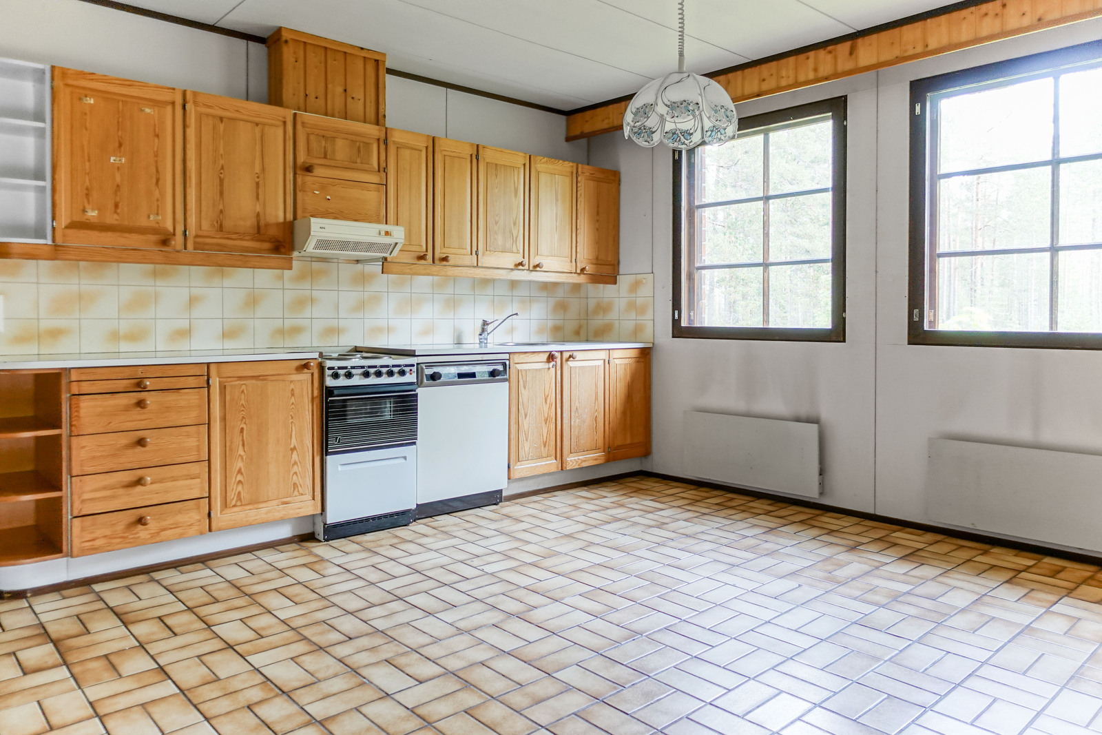 Jääkaappi/pakastin, kaapistot, sähköliesi, liesituuletin/hormi/suodatin, leivinuuni. Keittiössä laattalattiat, puolipaneloidut/tapetoidut seinät, levykatto. |
