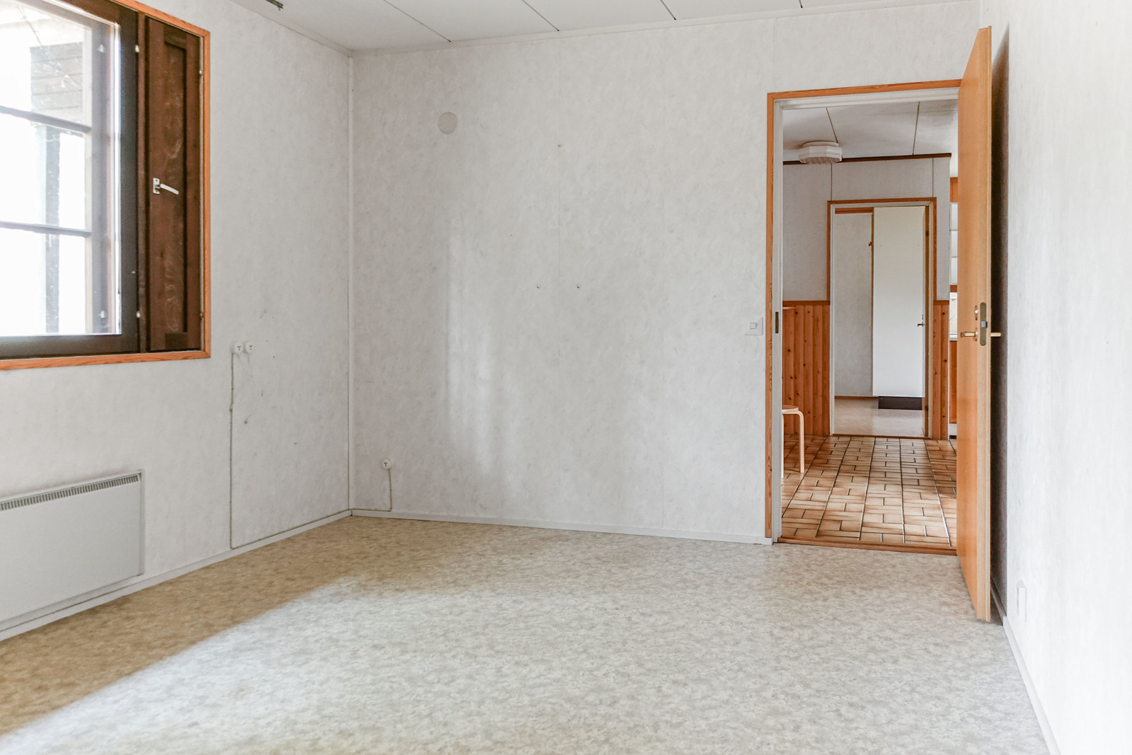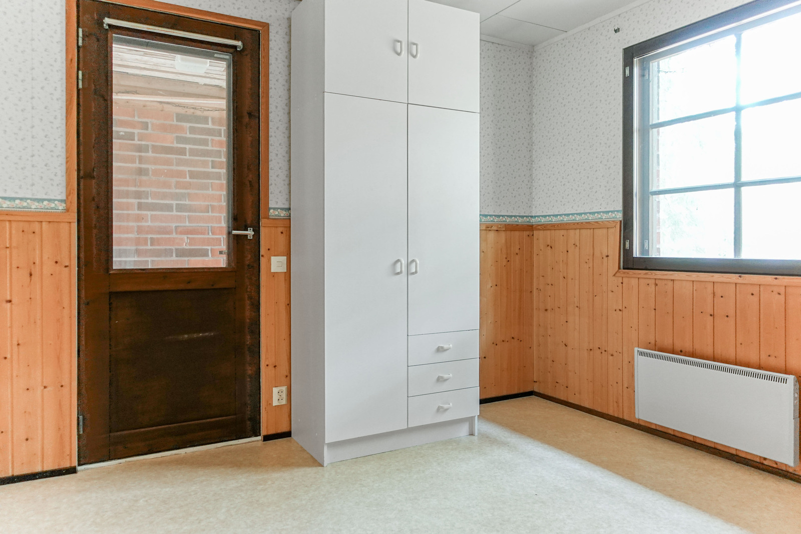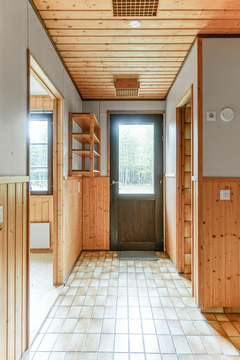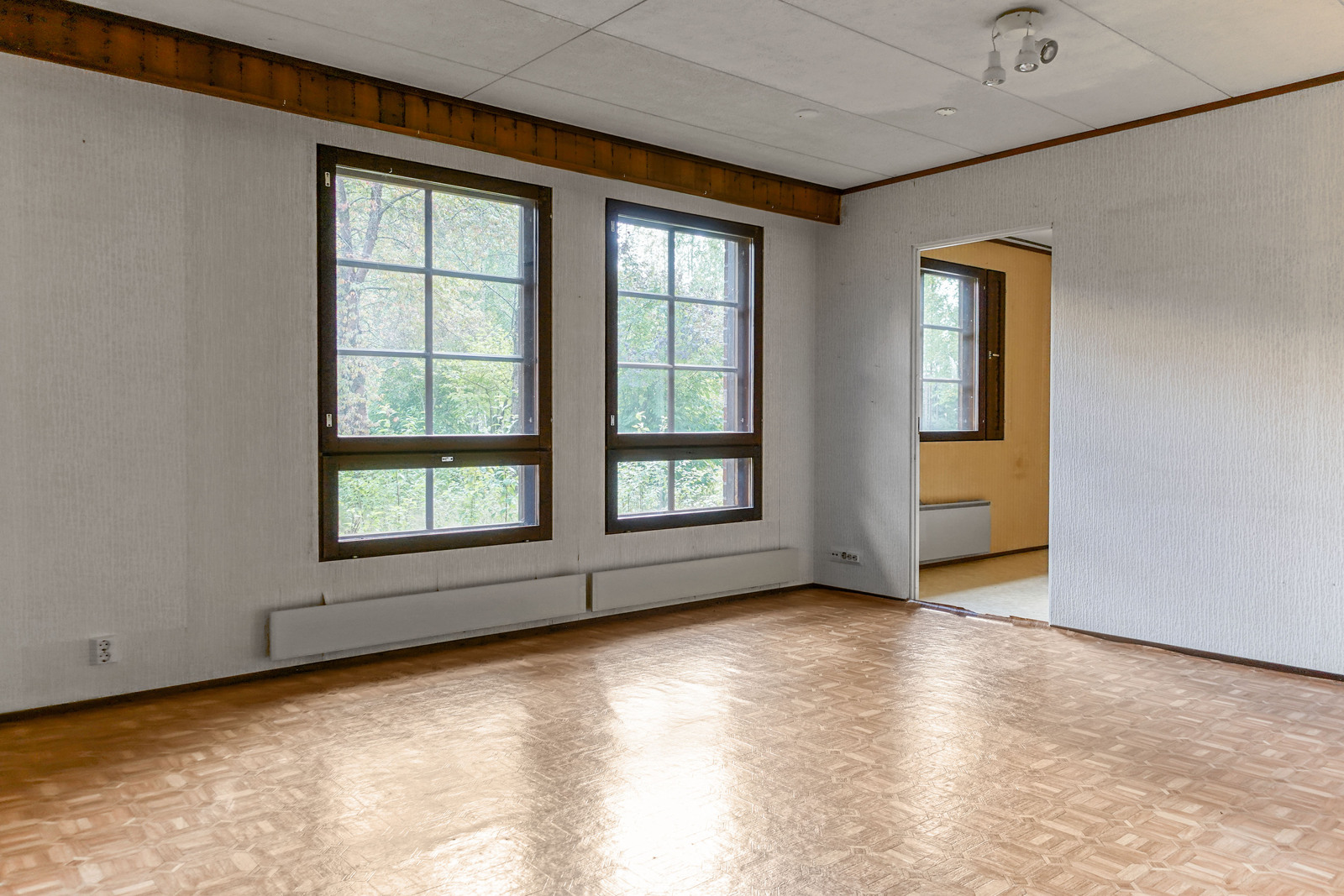 Huoneet 4-5: Muovimatto, puolipaneloidut/tapetoidut seinät, levykatto kahdessa huoneessa. |