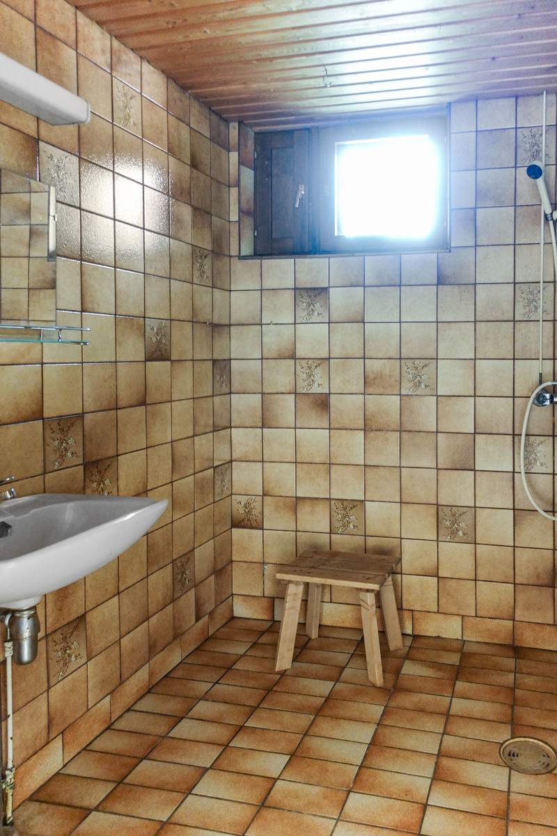 Suihku, käsiallas, peili, tuuletusikkuna. Laattalattiat, laatoitetut seinät, yksi seinä paneloitu, paneelikatto, lattialämmitys.