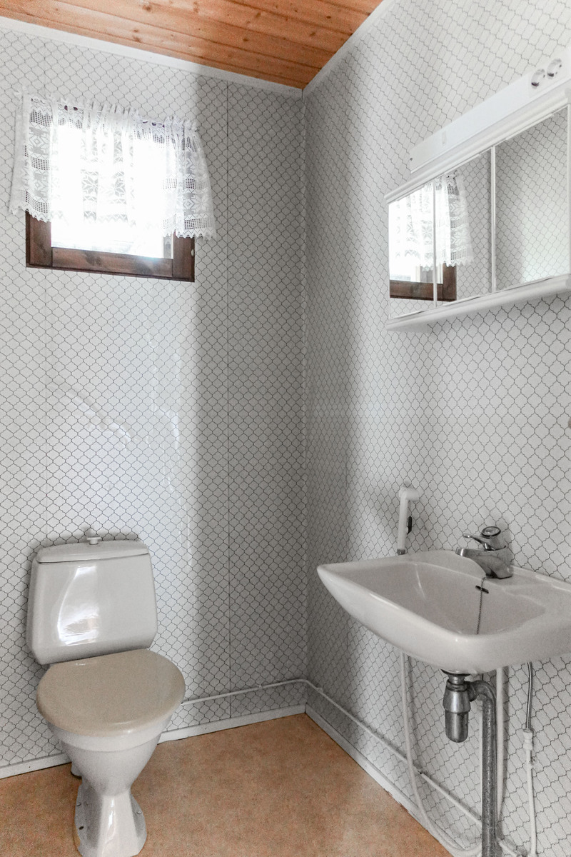 Erillinen wc, jossa peilikaappi, käsiallas, kiinteät valaisimet. Lattiassa on muovimatto ja seinät on tapetoitu. |