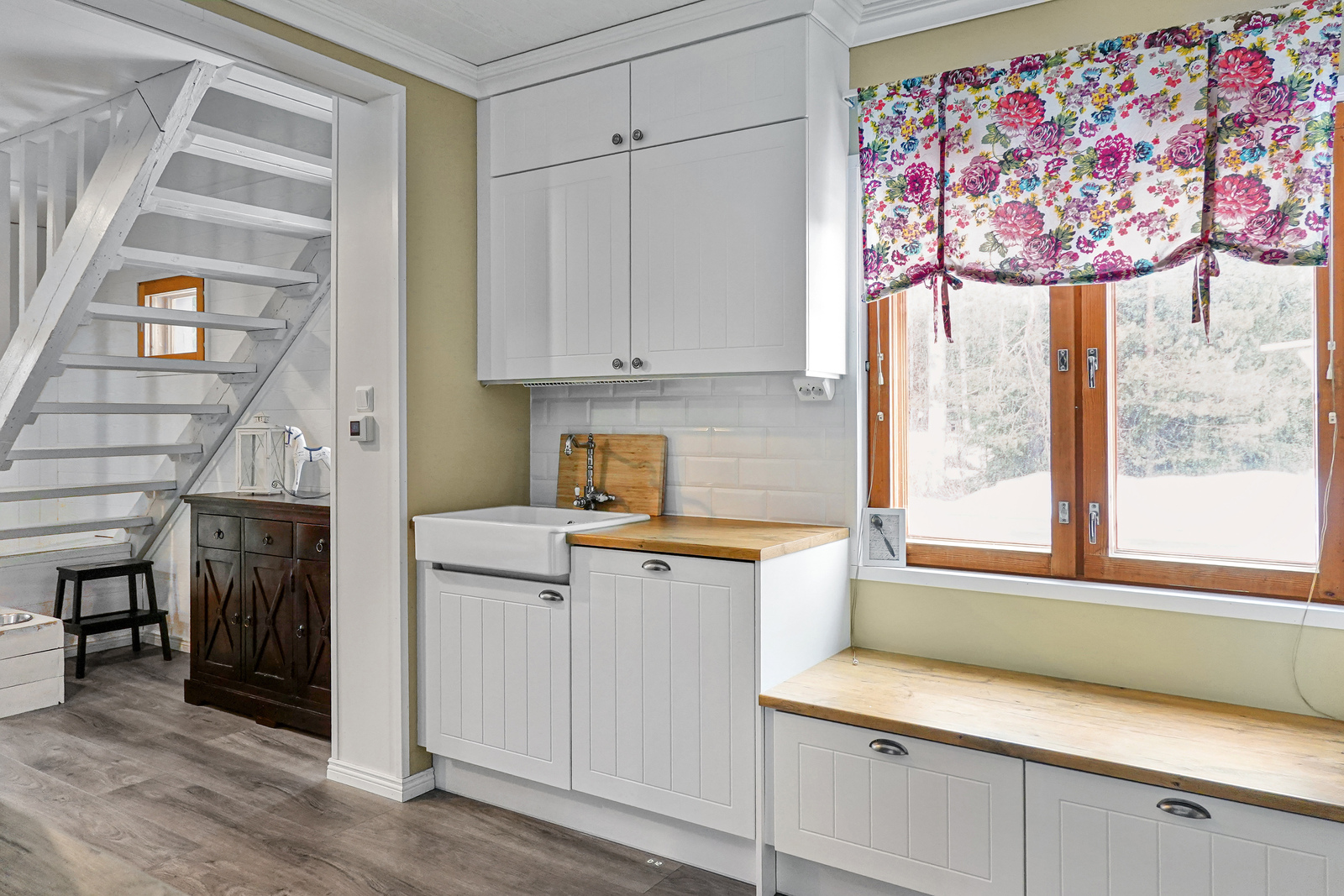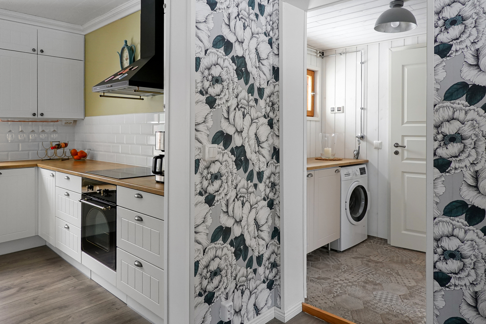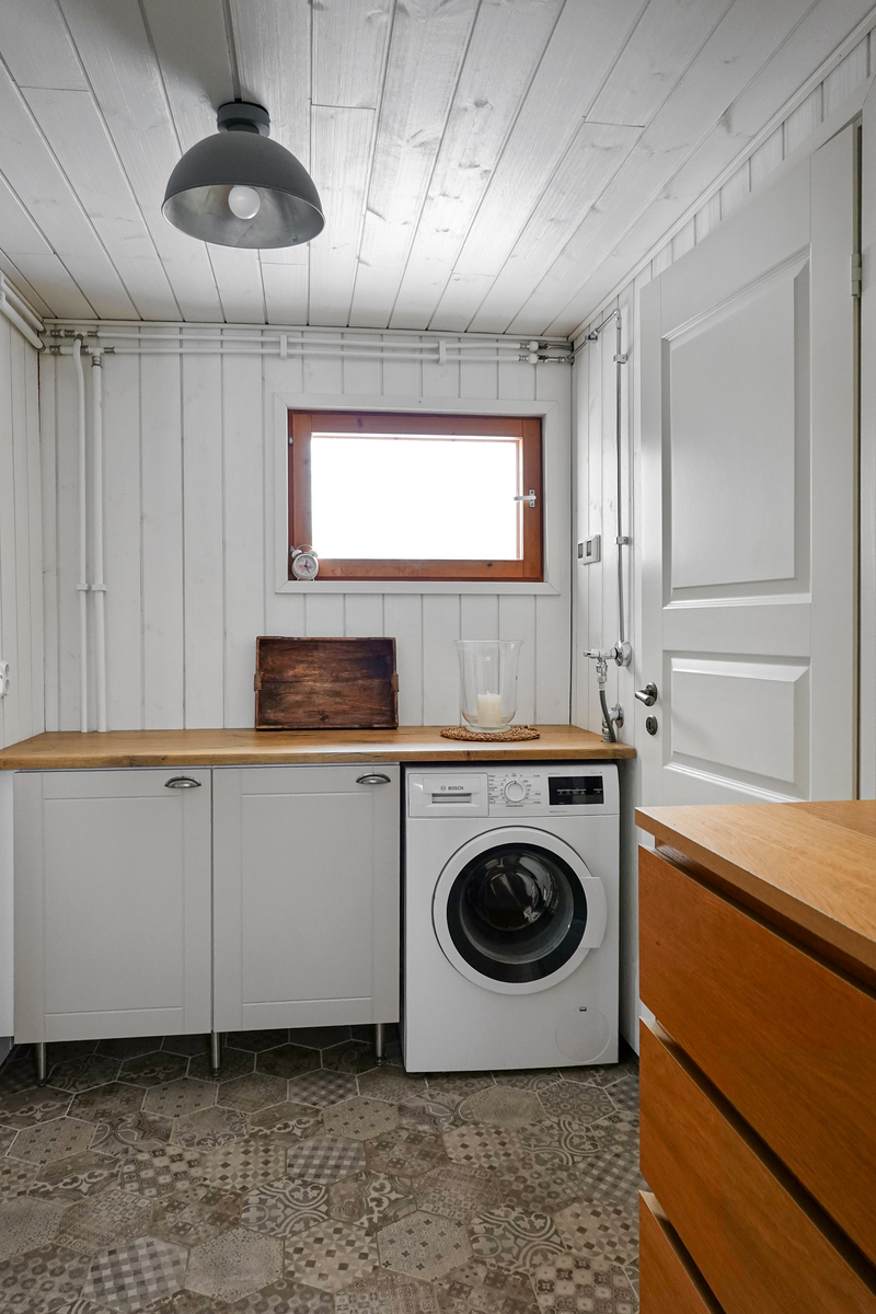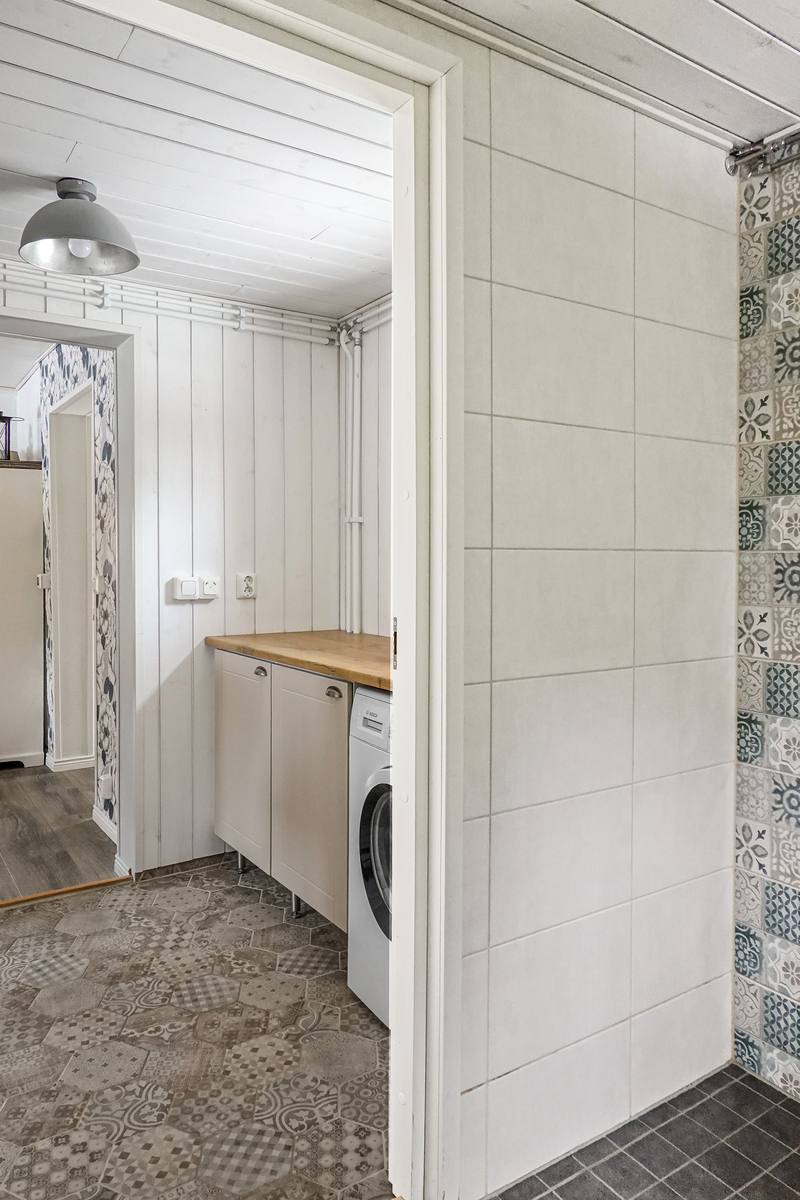 | Khh:n kuvaus | Laatoitettu lattia, paneeliseinät ja -katto. Sähköinen lattialämmitys, pesukoneliitäntä. |