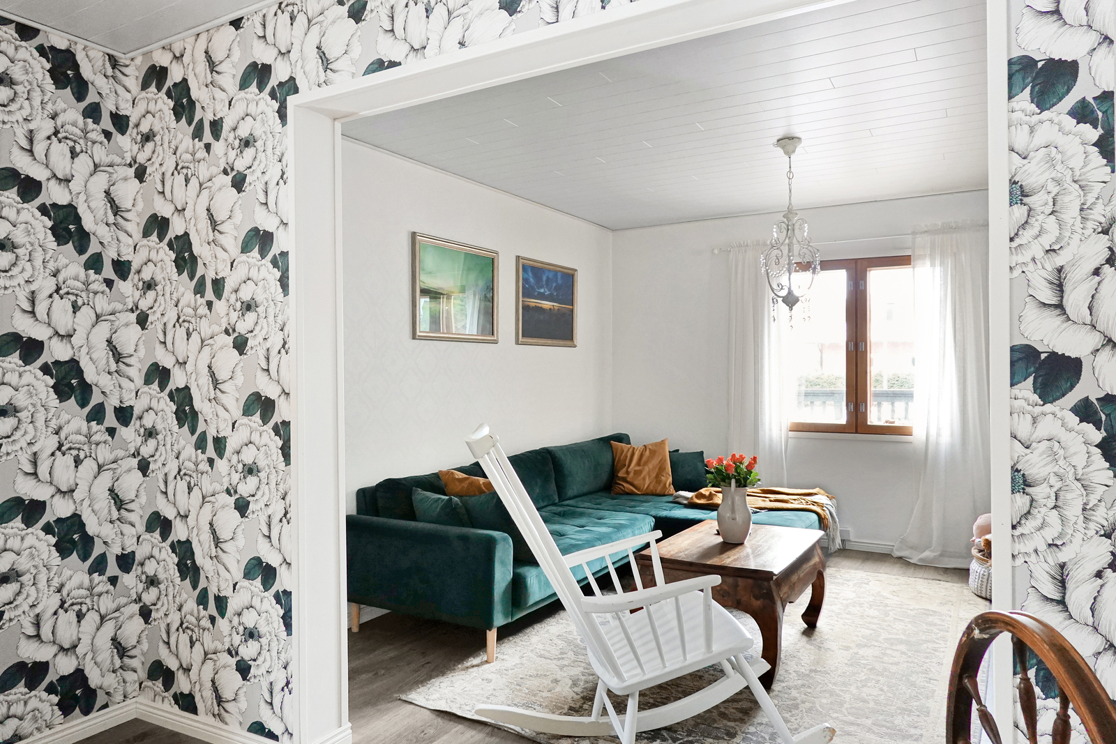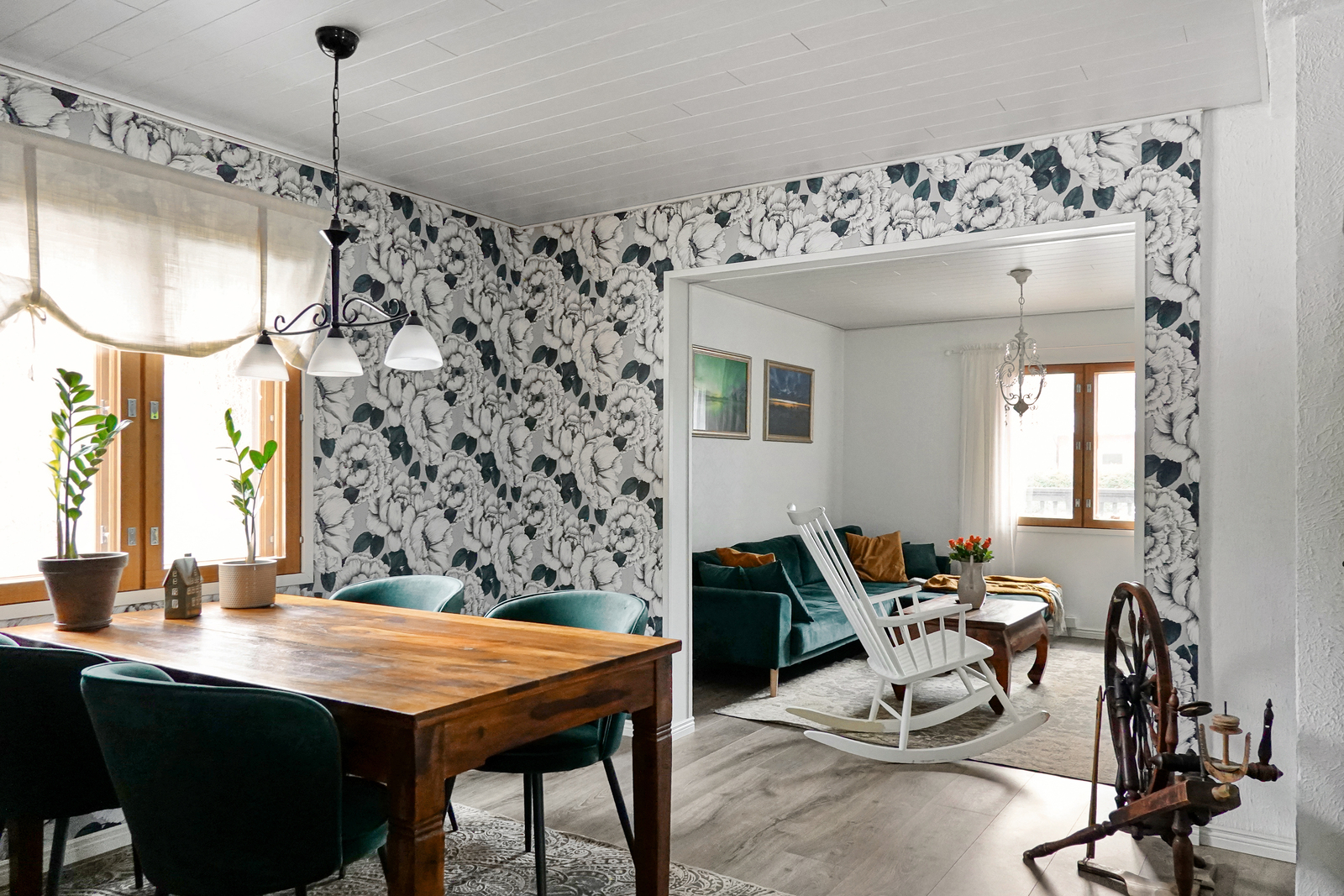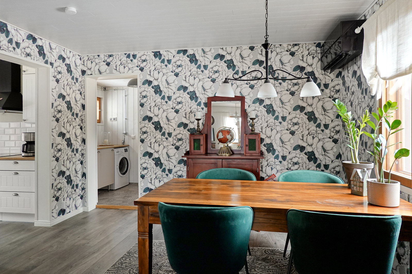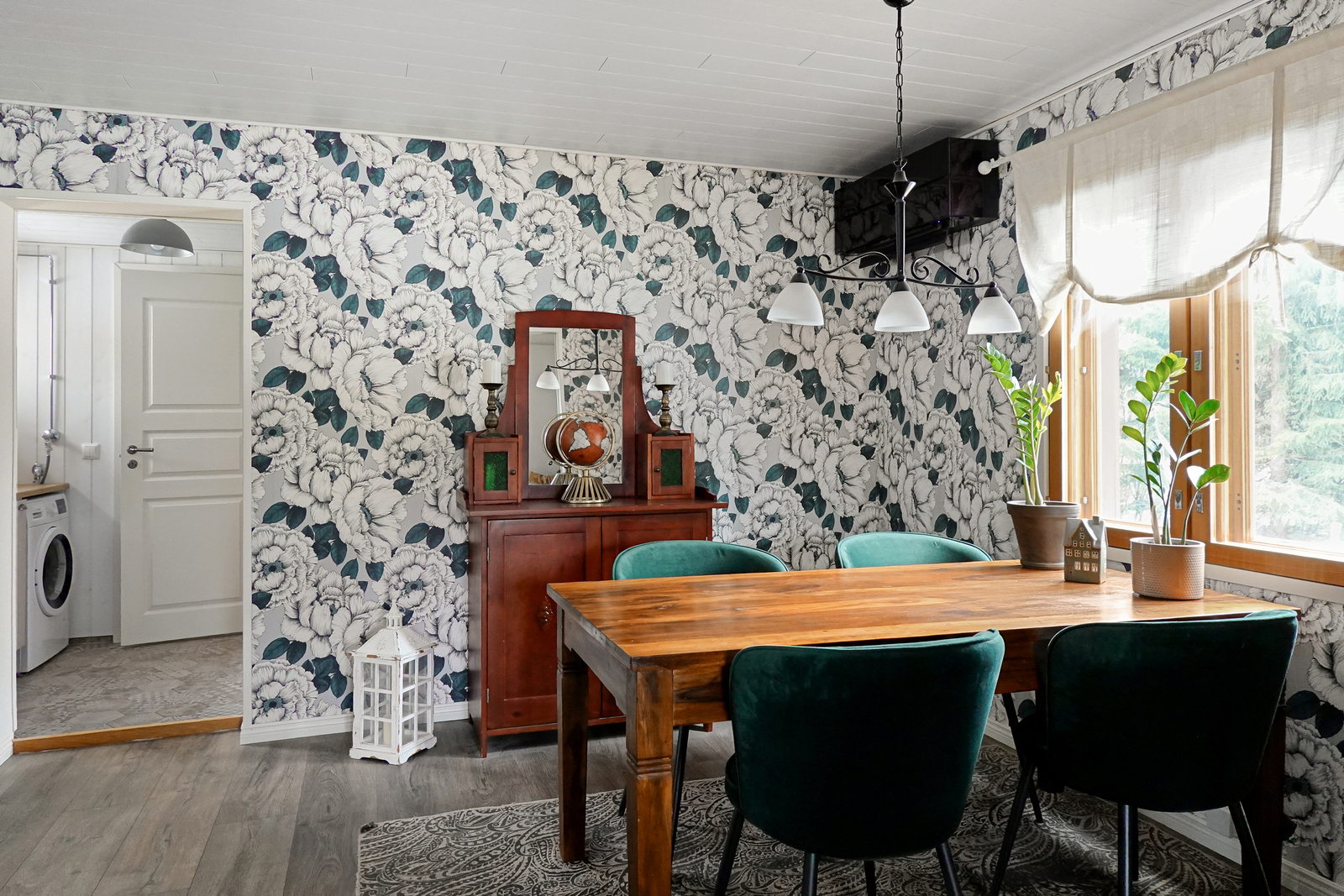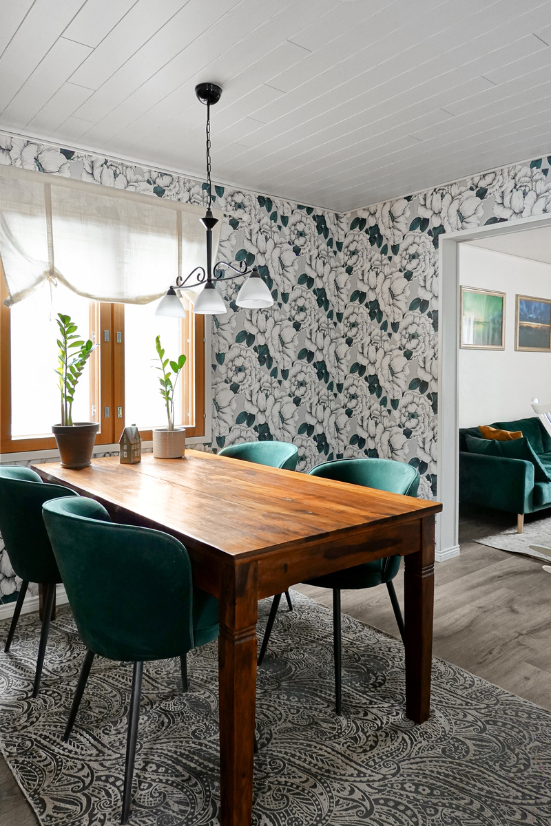 | Olohuoneen kuvaus | Laminaattilattia, tapettiseinät, paneelikatto. Pönttöuuni. |