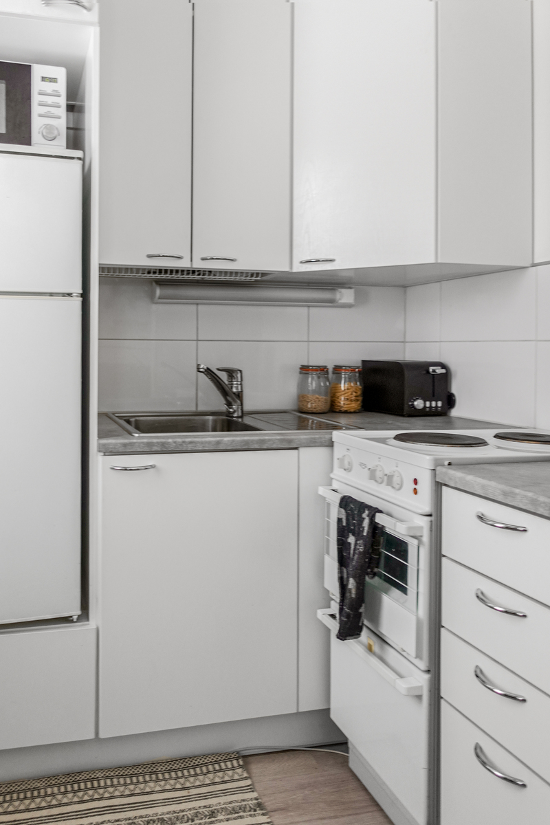 Keittiön kuvaus | Jääkaappi/pakastin, sähköliesi, lattia-/seinä- ja kattopinnoitteet: lattia laminaatti, seinät maalattu/laatta, kiinteät valaisimet. |