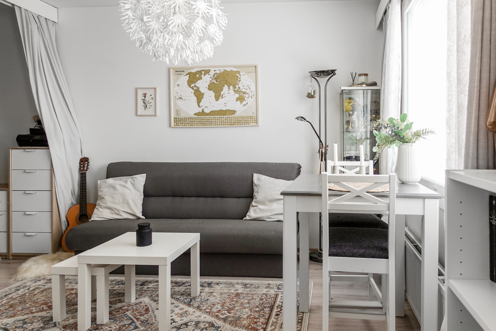 Olohuoneen kuvaus | Lattia laminaatti, seinät maalattu. |