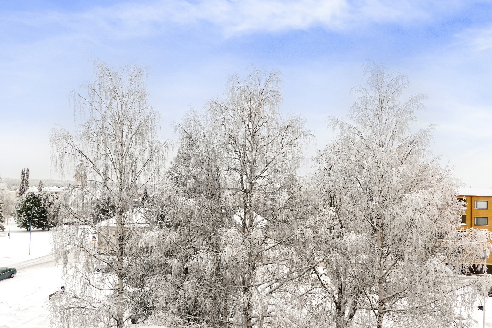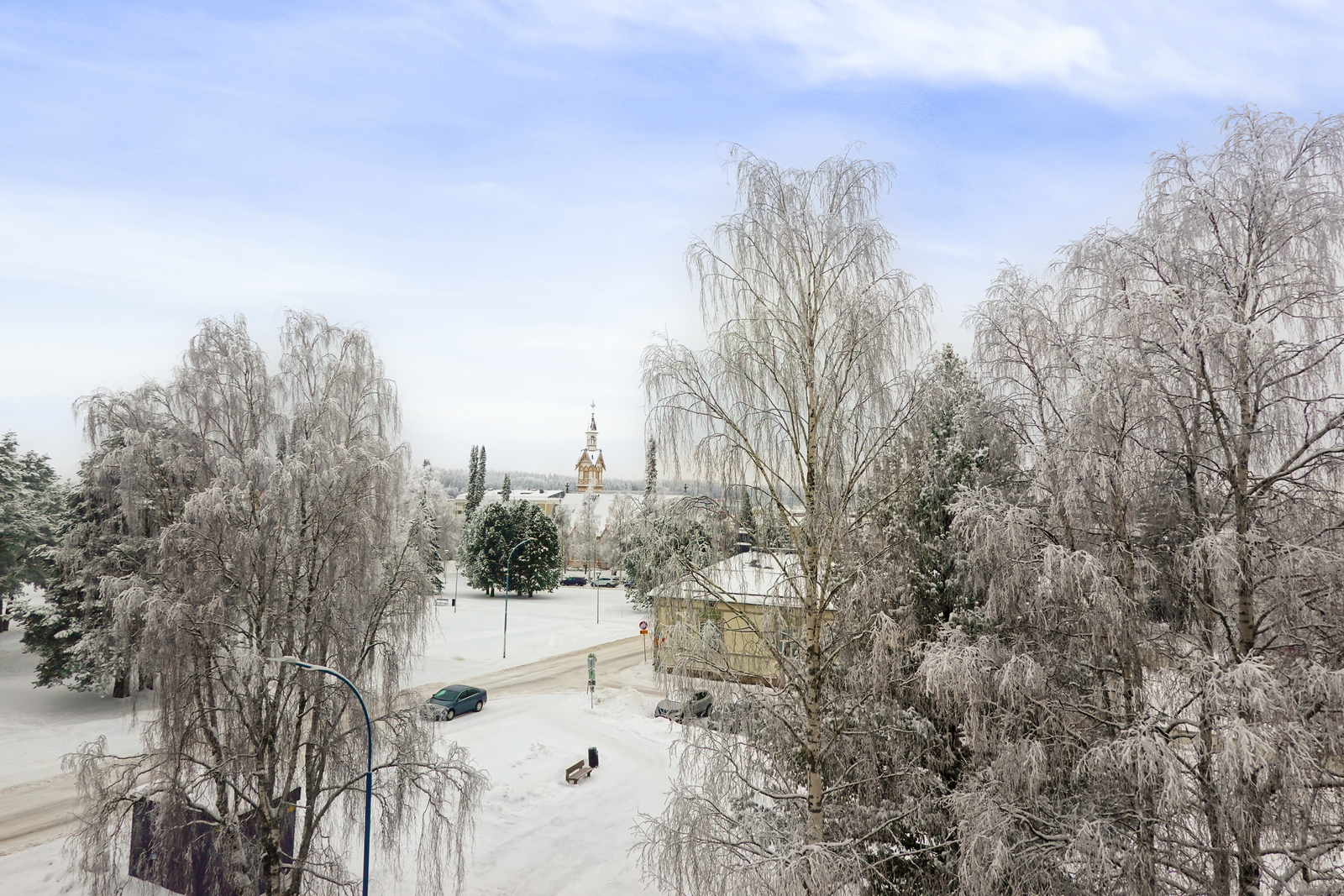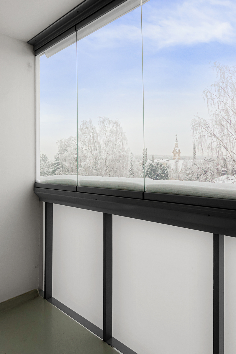 Lasitetulta parvekkeelta ja ikkunoista avautuu kauniit puistomaisemat sekä viehättävä puinen päiväkoti ja kirkko.
