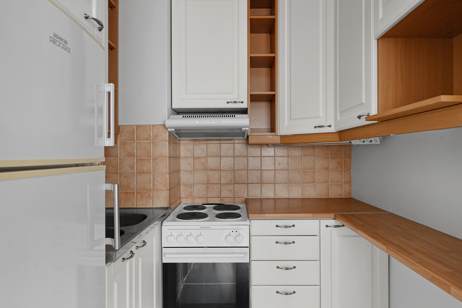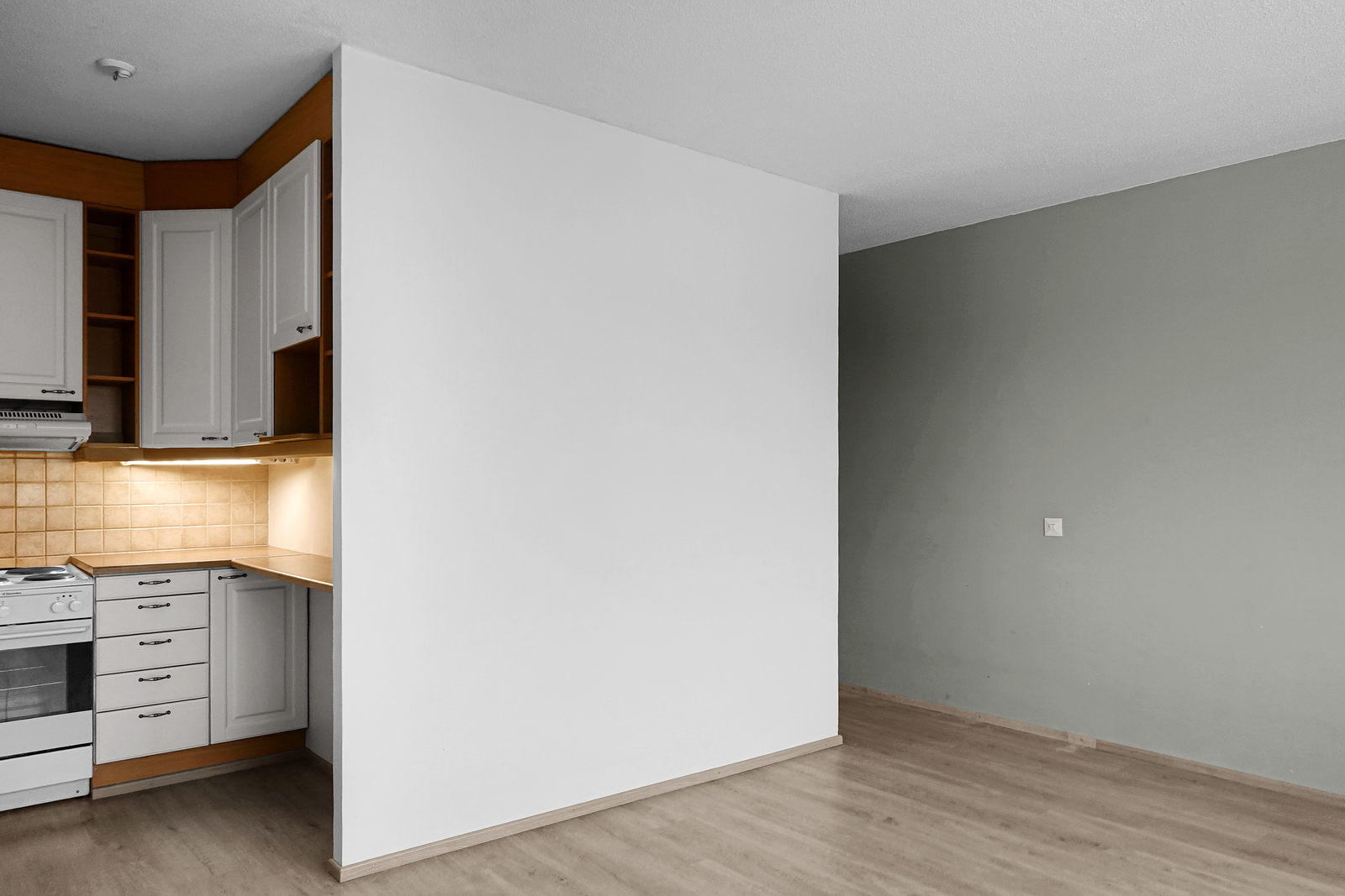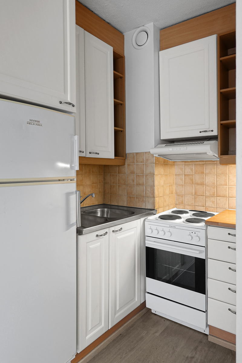 Laminaattilattia, seinät ja katto maalattu, jenkkikaappi, sähköliesi, liesituuletin. |