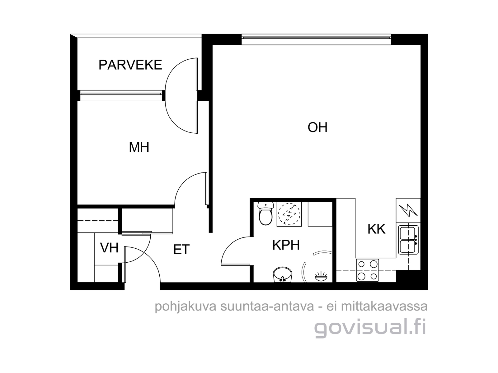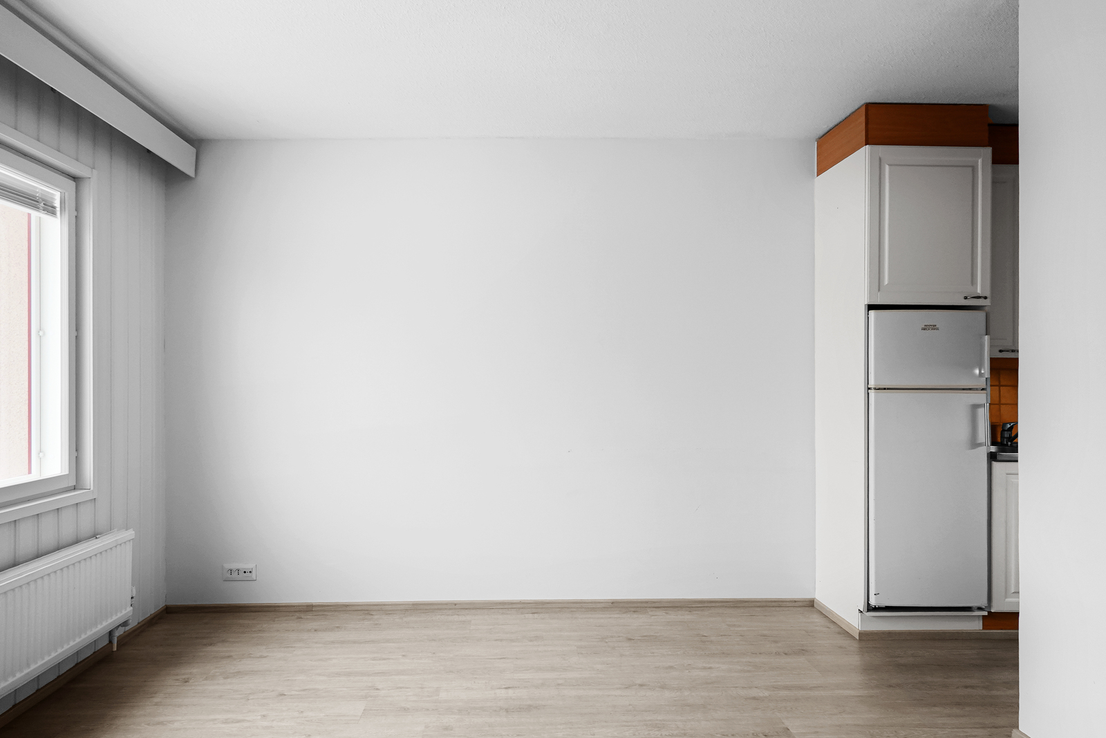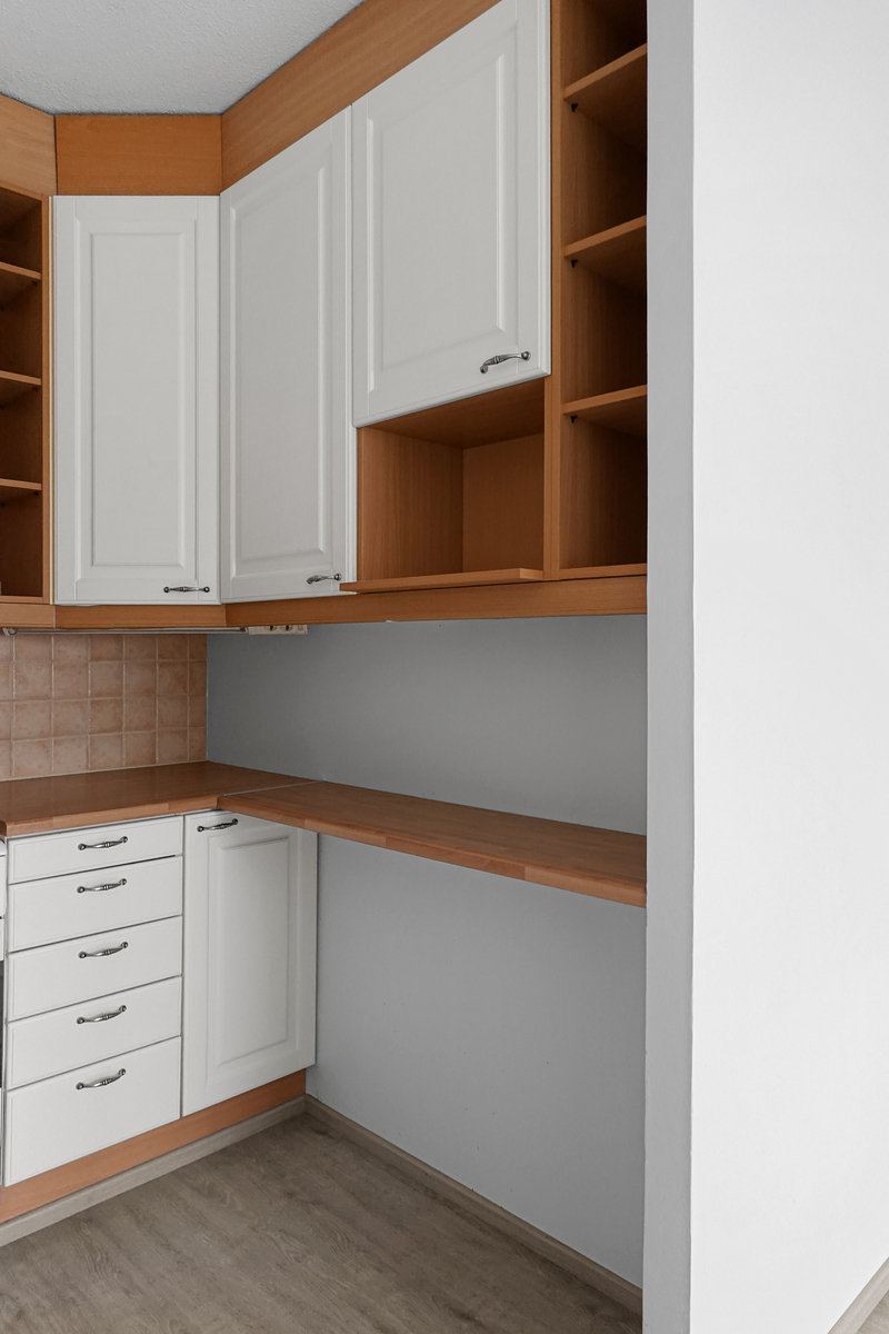 Laminaattilattia, seinät ja katto maalattu, jenkkikaappi, sähköliesi, liesituuletin. |