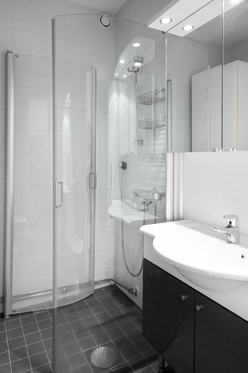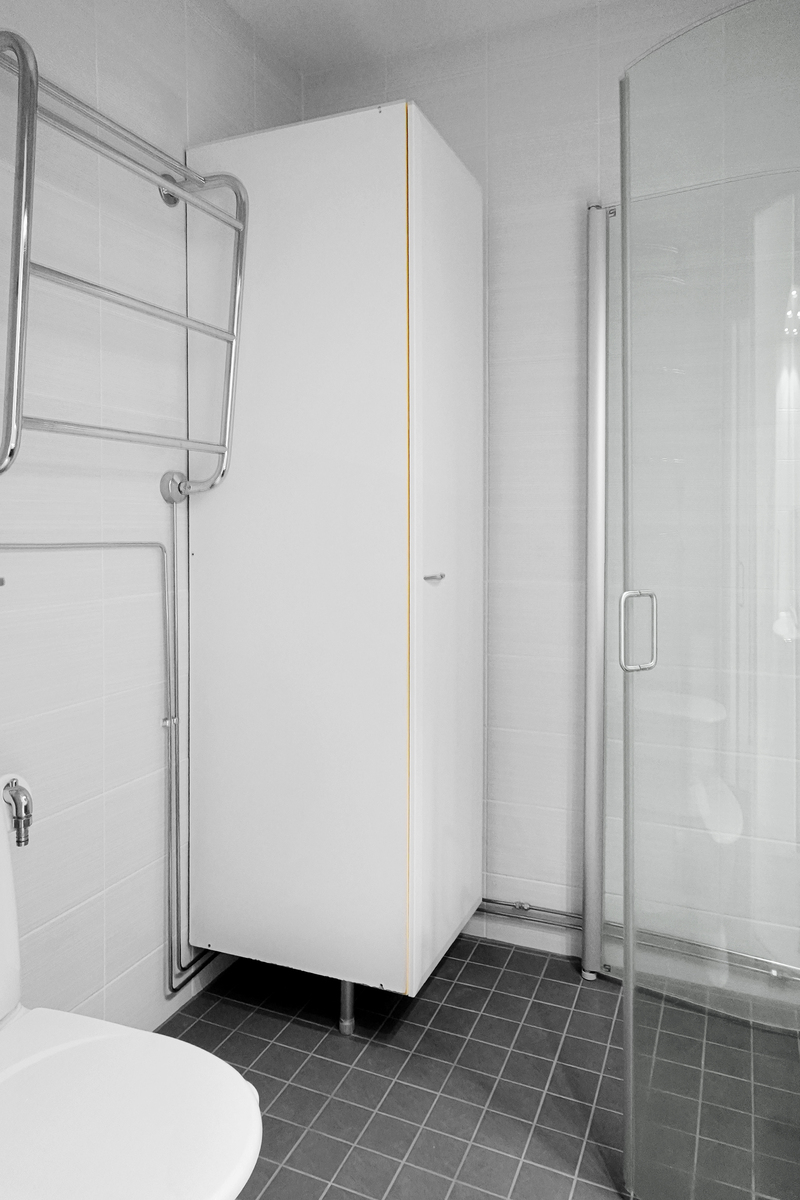Lattia ja seinät laatoitettu, suihku, suihkuovet, pesukoneliitäntä, wc-istuin, pesuallas, allaskaappi, bideesuihku, peilikaappi, kylpyhuonekaapisto, pyyhekuivain. Kylpyhuone remontoitu 2013. |