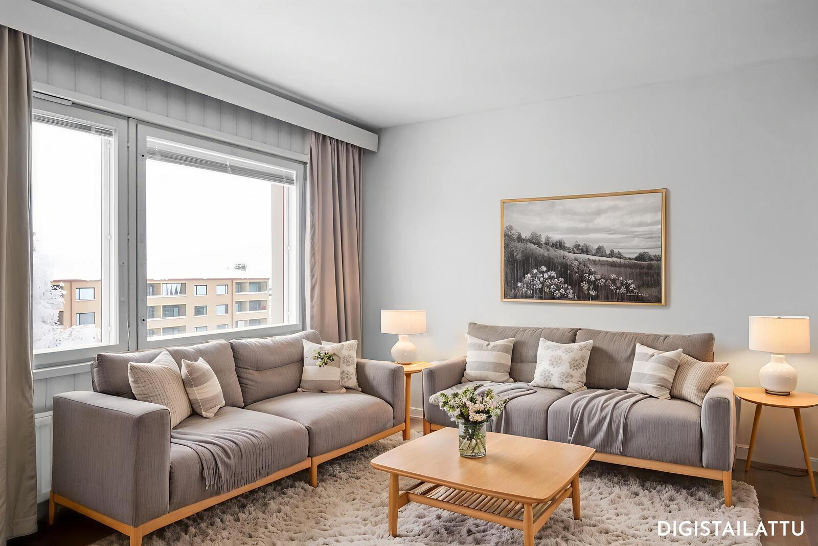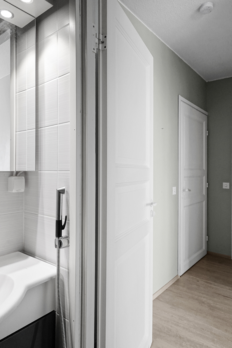 Kauniissa asuinhuoneissa on laminaattilattiat ja maalatut seinät. Asunnossa on avara olohuone, jonka yhteydessä on keittokomero. Laatoitetussa kylpyhuoneessa on suihkuovet ja pesukoneliitäntä. Eteisessä on liukovikaapisto ja käynti erilliseen vaatehuoneeseen.