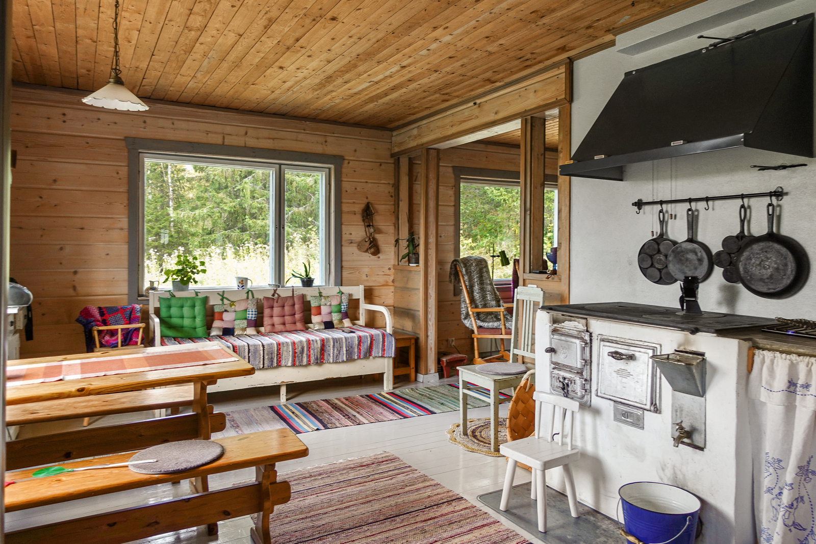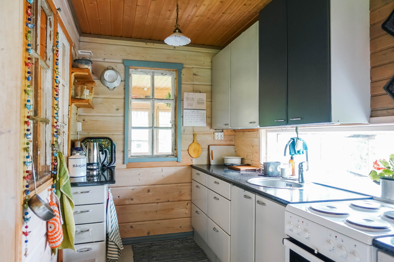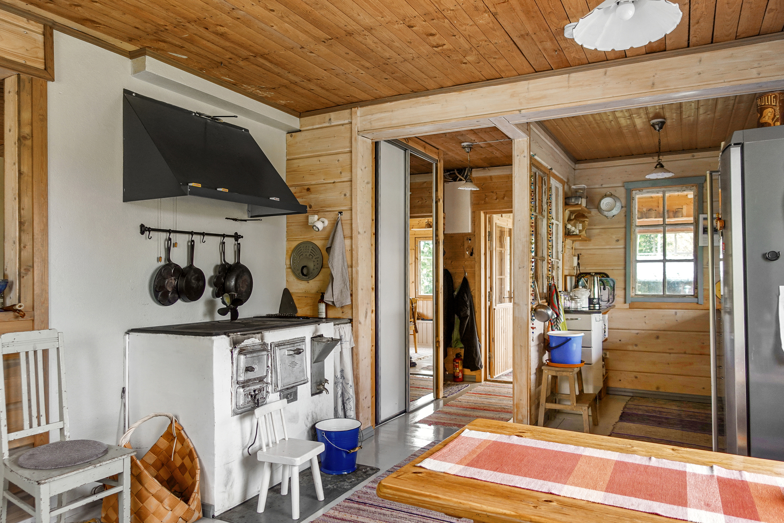 Keittiön kuvaus | Lautakatto Uusittu v. 2018: tupakeittiössä maalattu lautalattia, seinät hirsipaneelia, sähköliesi, jääkaappi, kaapistot, puuliesi |