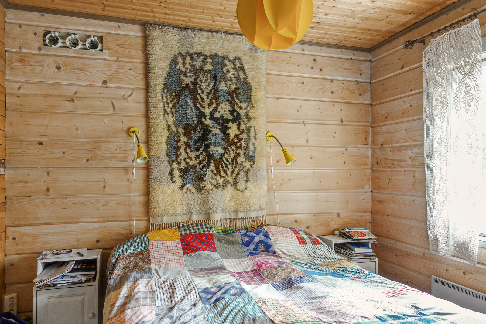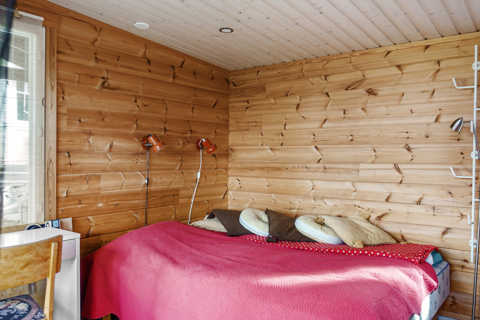 Makuuhuoneiden kuvaus | Uusittu 2016: Maalattu lautalattia, seinät hirsipaneelia,paneelikatto, kaapistot, kamina. |