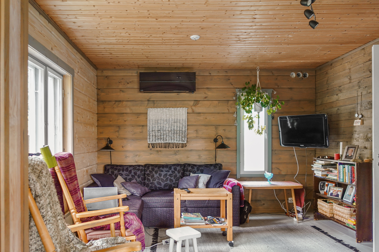 Olohuoneen kuvaus | Remontoitu 2015: Maalattu lautalattia, seinät hirsipaneeli, paneelikatto, varaava. Takka uusittu 2024 |