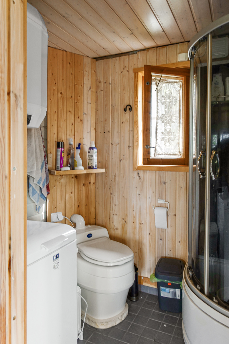 Kylpyhuoneen kuvaus | Rakennettu 2018: separett -käymälä, suihku, suihkukaappi, pyykinpesukoneliitäntä, laattalattia, seinät paneelia, lämminvesivaraaja |