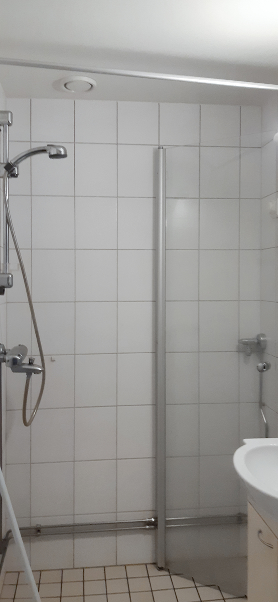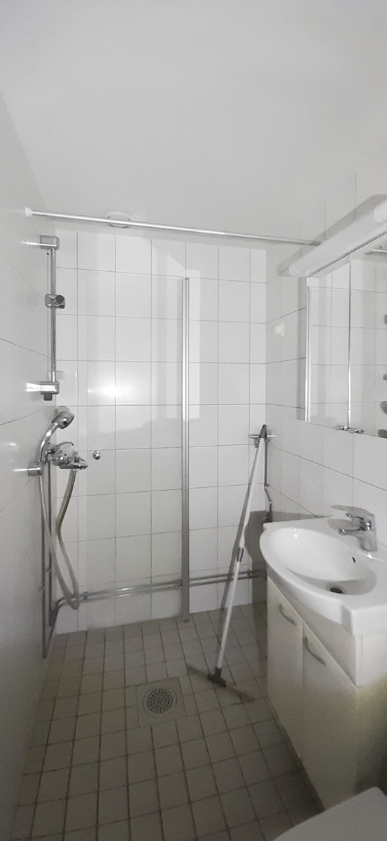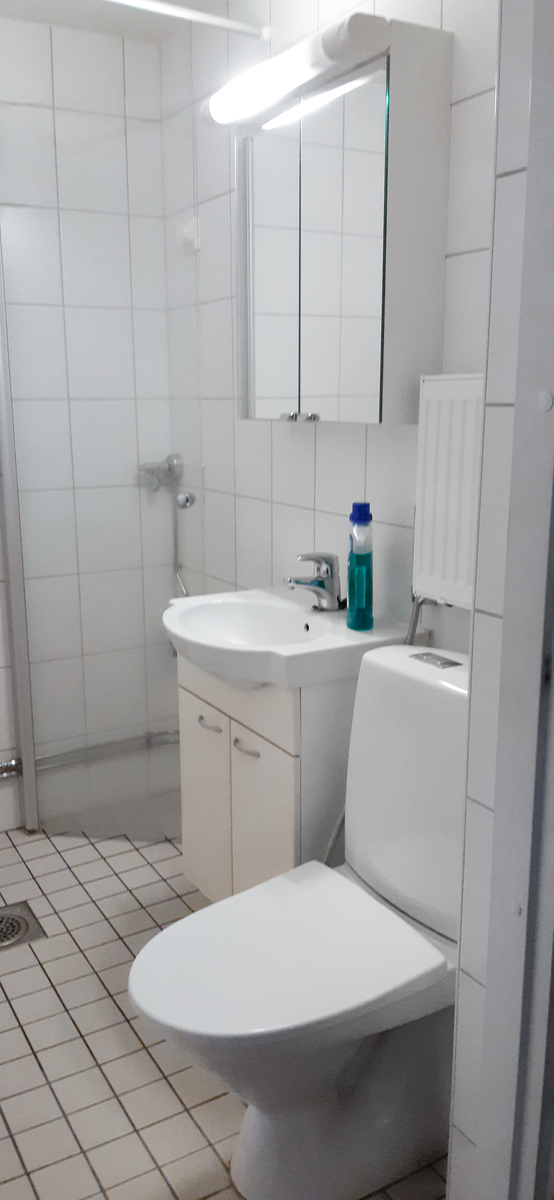 Laatoitettu lattia ja seinät, pesukoneliitäntä, allaskaappi, peilikaappi |
