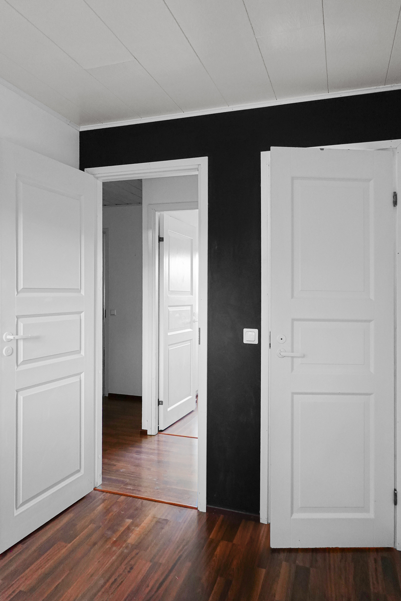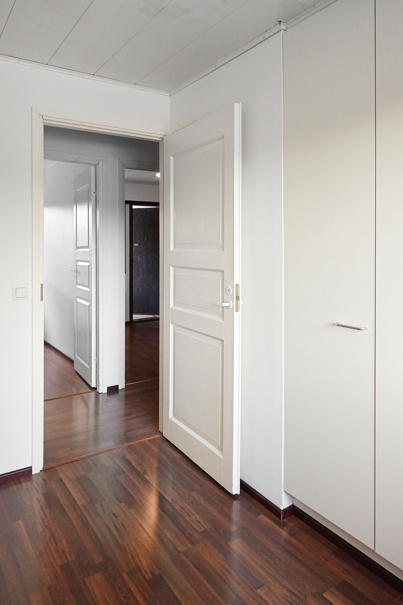 Makuuhuoneissa laminaattilattiat, maalatut seinät ja paneloidut katot. |