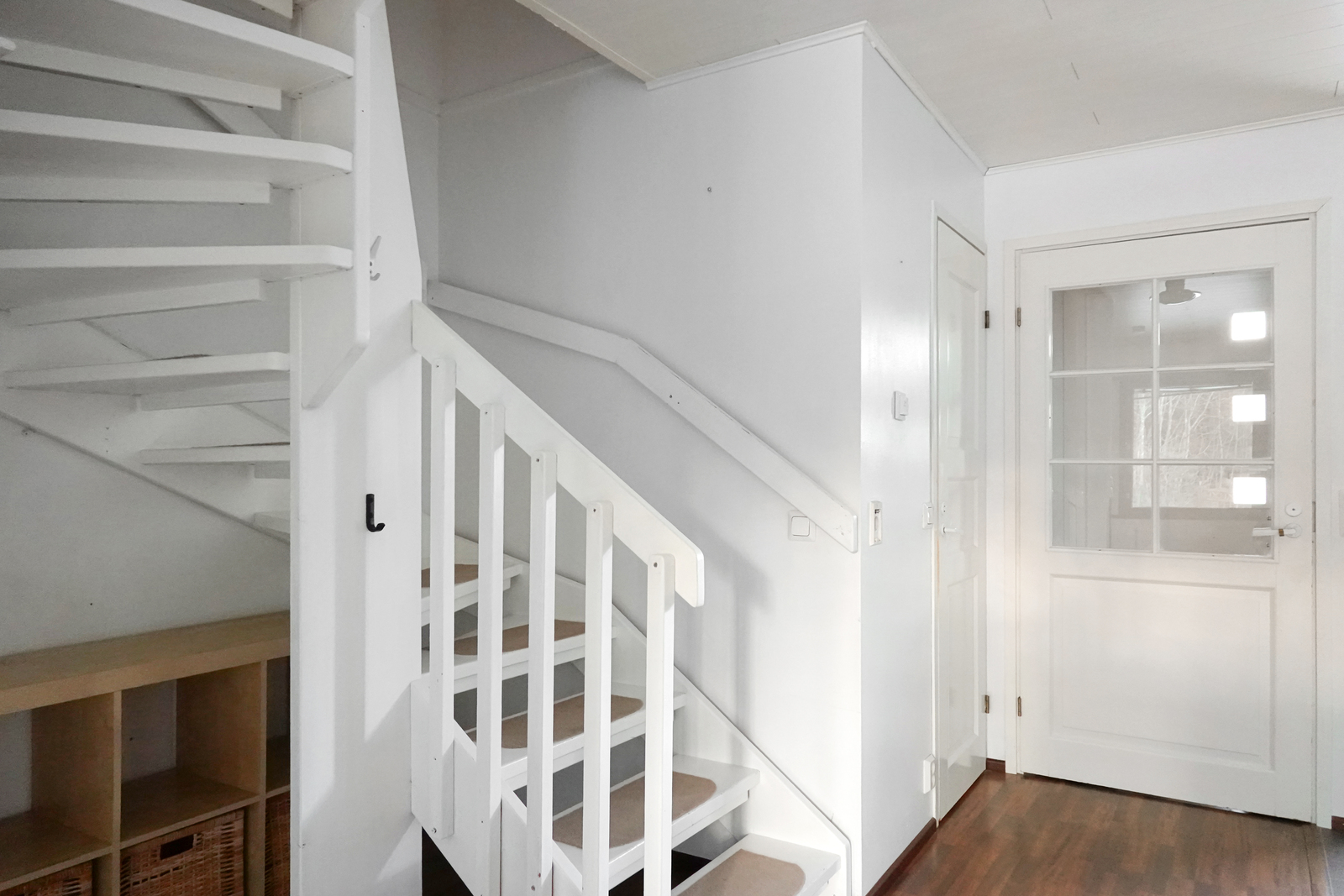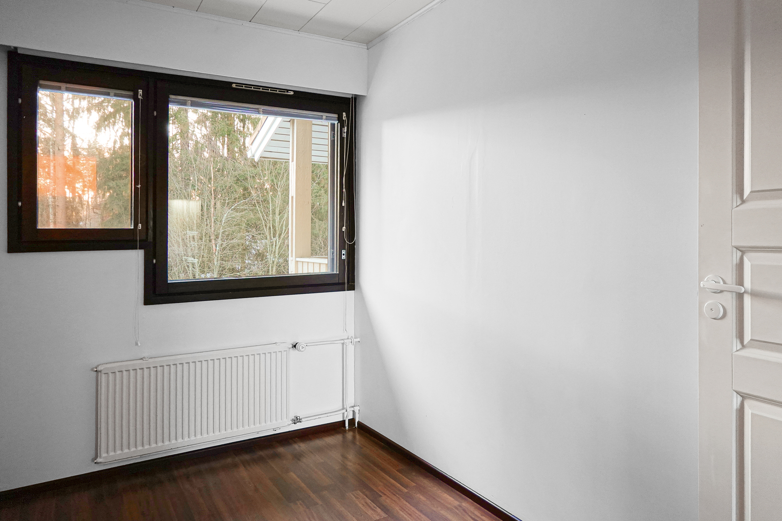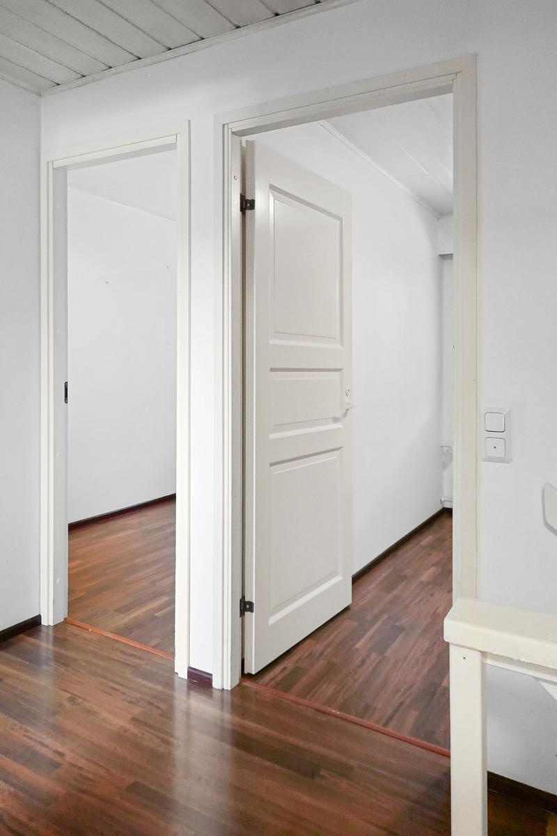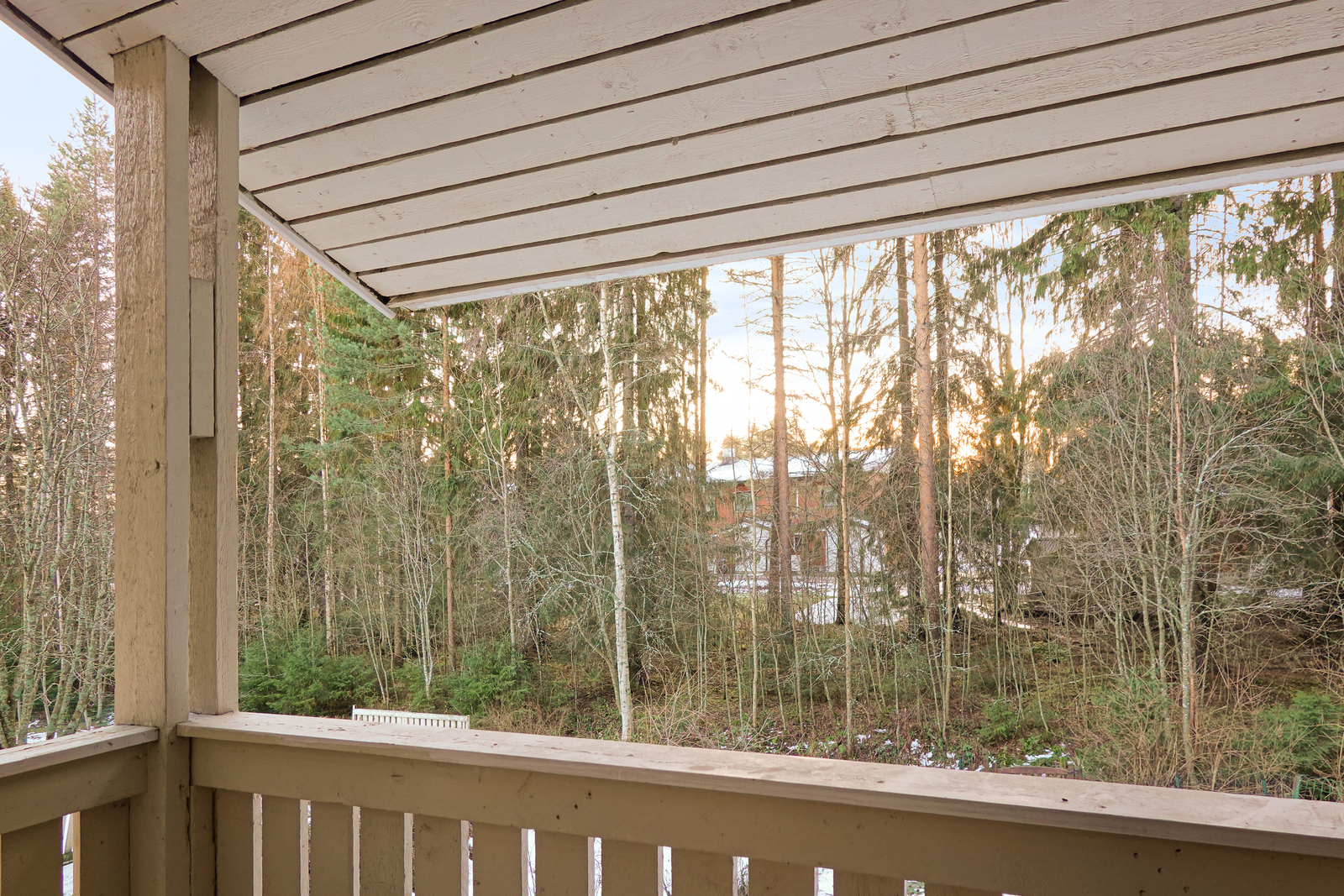 Olohuoneesta avautuu kulku omalle terassille ja takapihalle, joka avautuu rauhaisiin metsämaisemiin. Yläkerrasta löytyy toinen wc sekä parveke, joka tuo ripauksen luksusta arkeen ja mahdollisuuden vaikkapa aamukahvien nauttimiseen. Yläkerrassa on lisäksi kaksi makuuhuonetta ja erillinen monikäyttötila, joka soveltuu hyvin työhuoneeksi tai nukkumiseen.