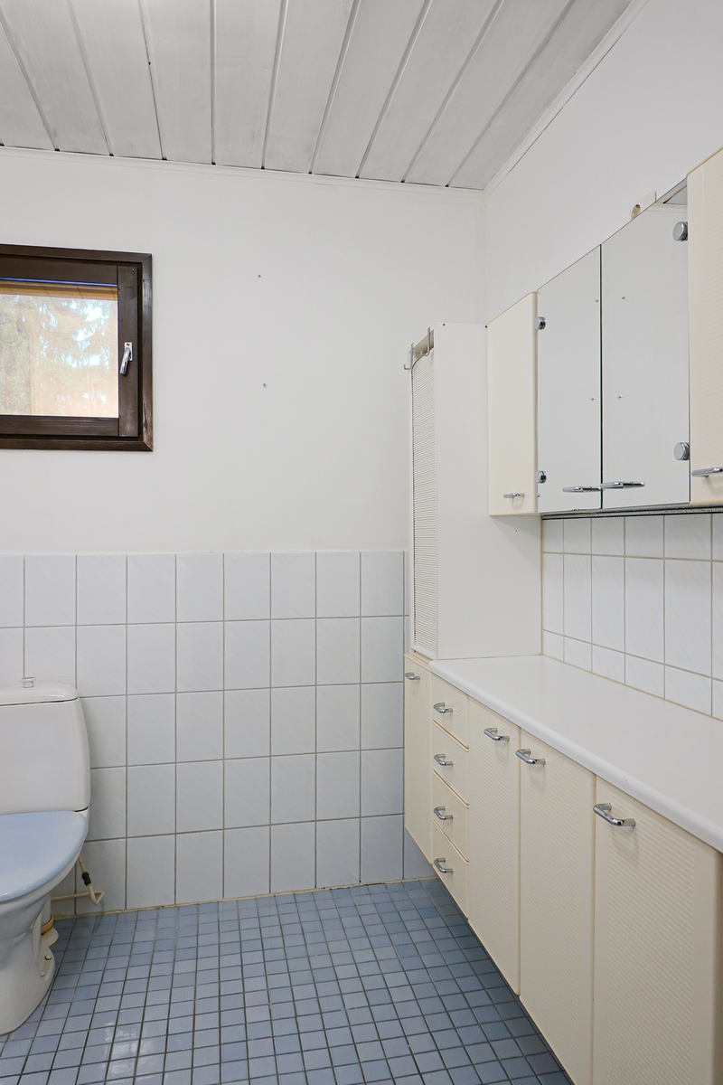 Yläkerrassa erillinen wc. Laatoitettu lattia, osaksi laatoitetut seinät, paneelikatto. |