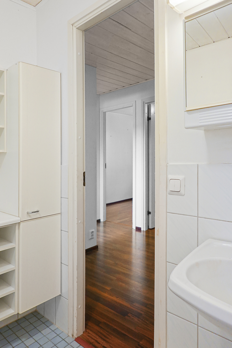 Laatoitettu lattia ja seinät, pesukoneliitäntä. |