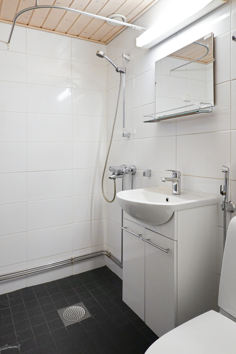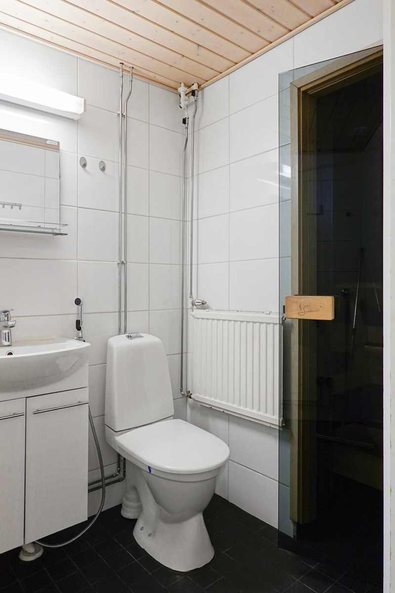 Alakerrassa sijaitsevat kodin käytännöllinen keittiö, joka on remontoitu tyylikkäästi ja laadukkain materiaalein, sekä sauna- ja pesutilat omalla wc:llä. Alakerran pesutilat ovat myös saaneet päivityksen vuonna 2016, mikä lisää asumisen huolettomuutta.