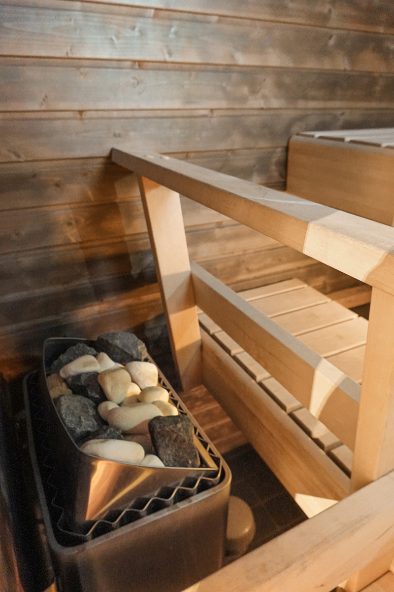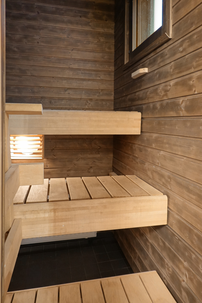 Laatoitettu lattia, paneloidut seinät ja katto, sähkökiuas. |