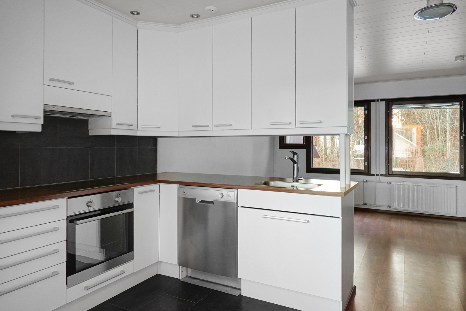 Uuni, liesi, liesituuletin, jääkaappi-pakastin, astianpesukone, laminaattilattia. |