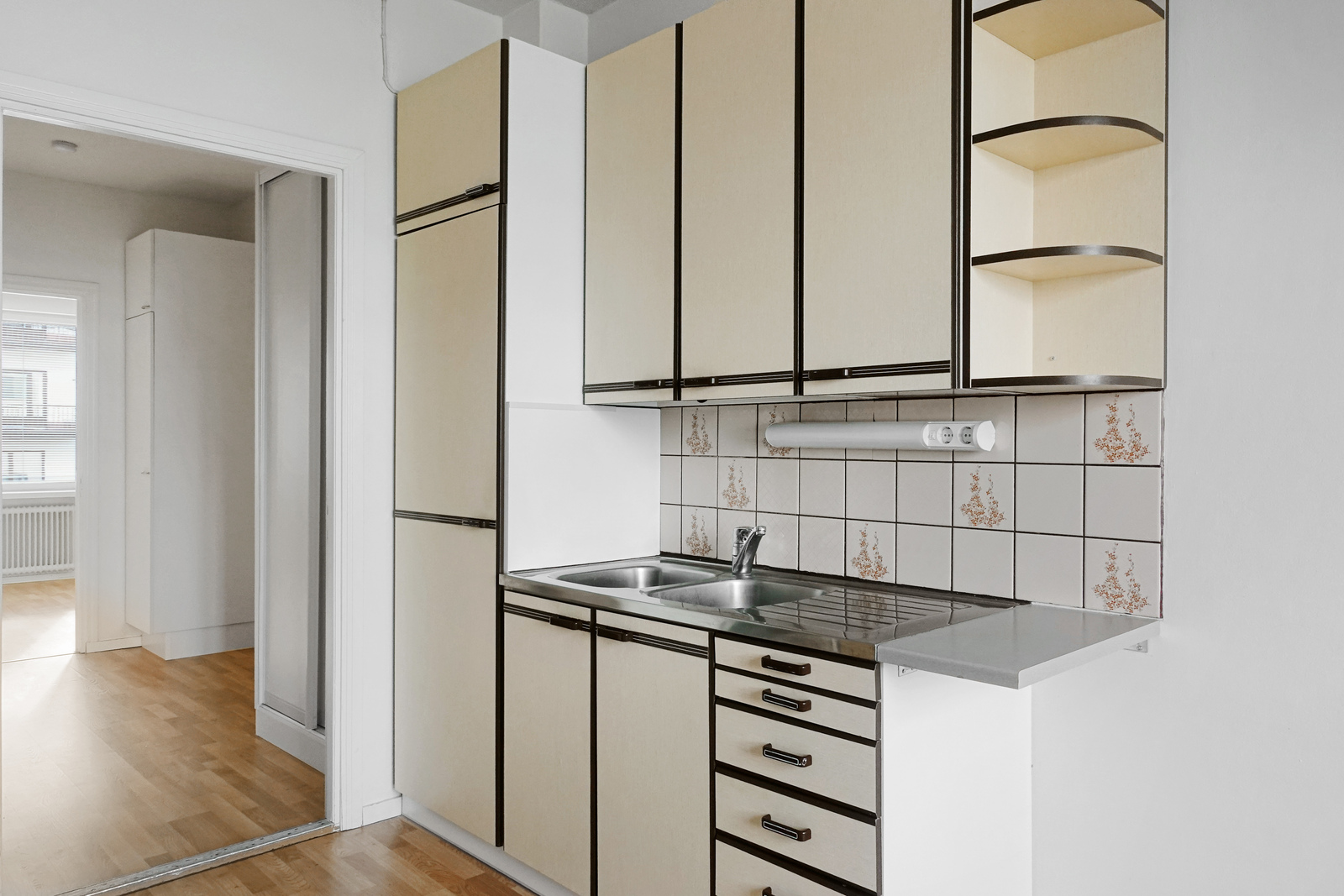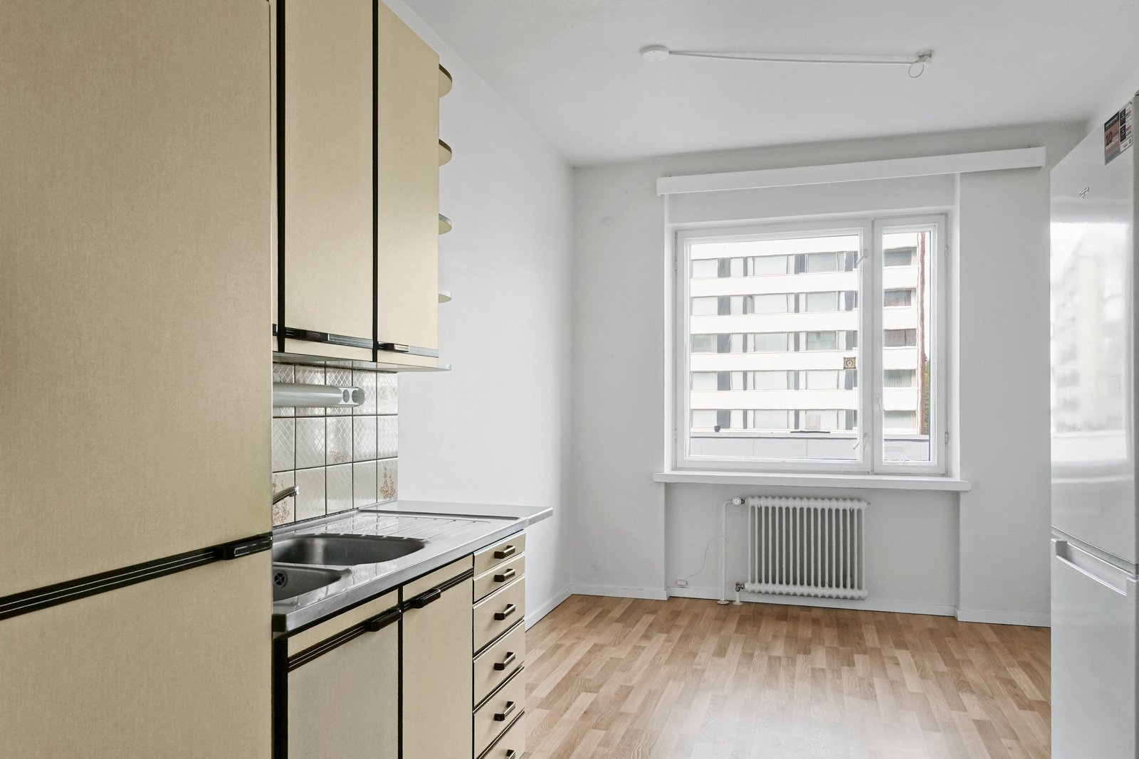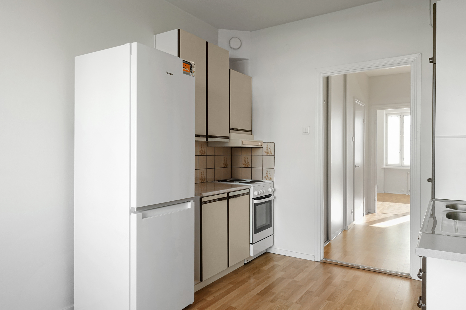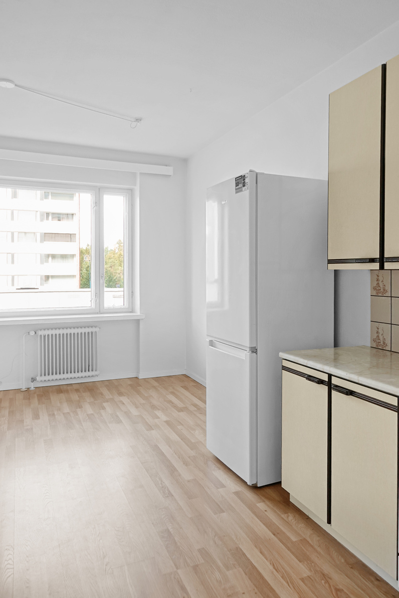 Laminaattilattia, seinät maalattu, katto maalattu, sähköliesi, liesituuletin, jääkaappi/pakastin |