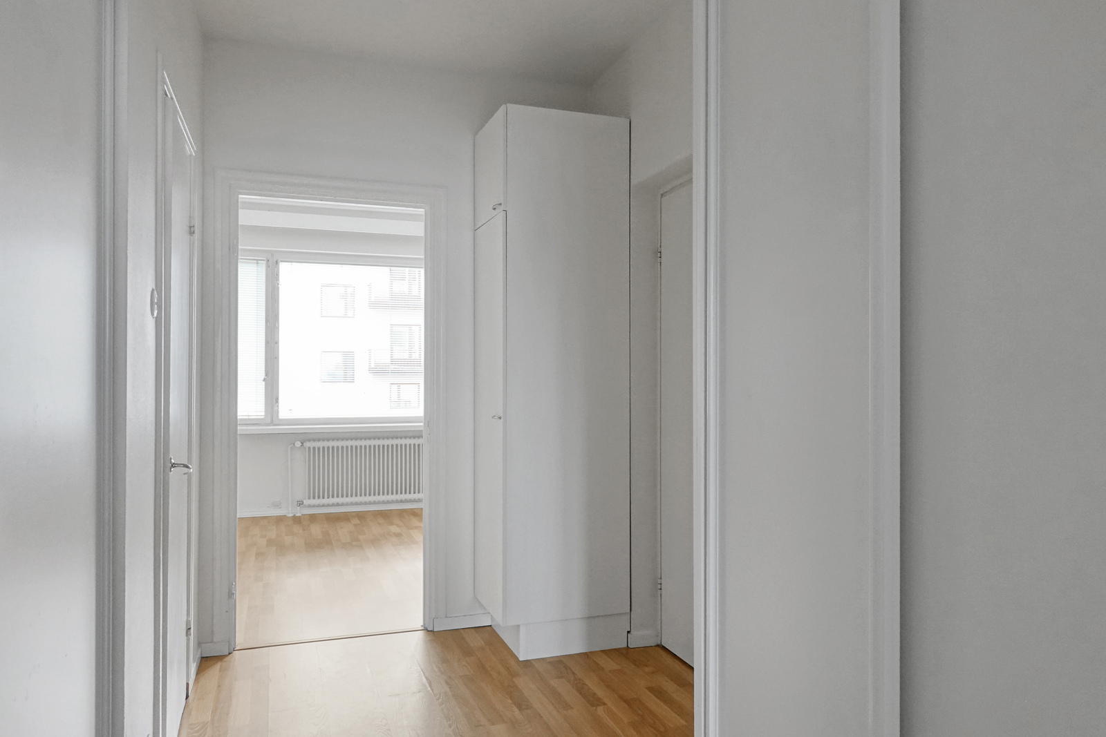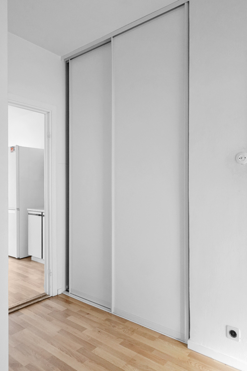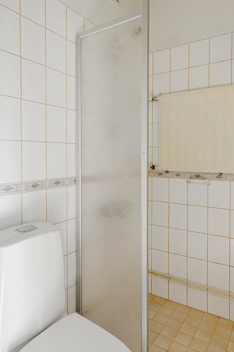Vaaleasävyisessä eteisessä on mukavasti kaappitilaa. Lisää säilytystilaa löytyy taloyhtiön häkkivarastosta. Tilava eteinen rajaa makuuhuoneen ja keittiön toisistaan sekä sieltä on käynti pesuhuoneeseen. Tässä pesuhuoneessa on arkea helpottamassa pesukoneliitäntä sekä suihkuseinä.