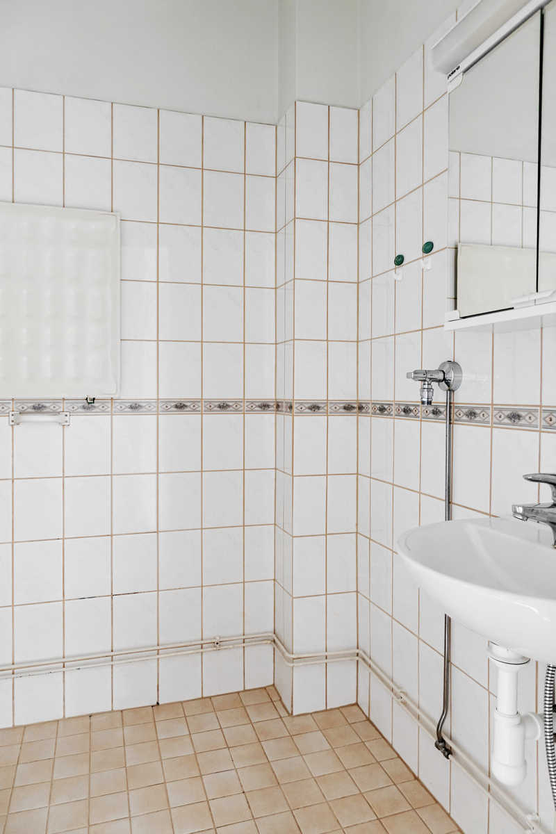 Lattia ja seinät laatoitettu, katto maalattu, pesuallas, peilikaappi, wc-istuin, suihkuseinä, suihku, pesukoneliitäntä, patteri |
