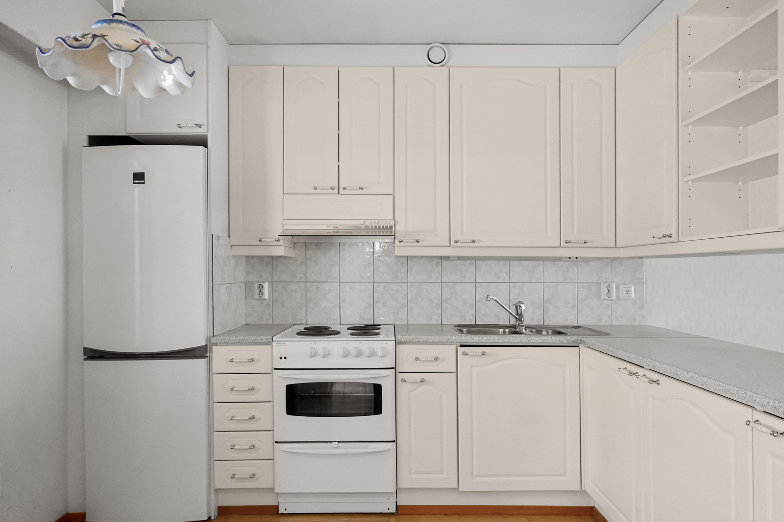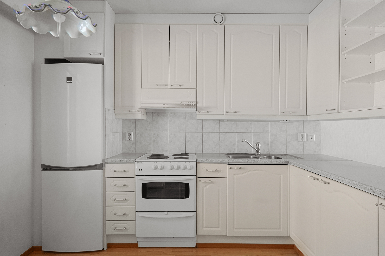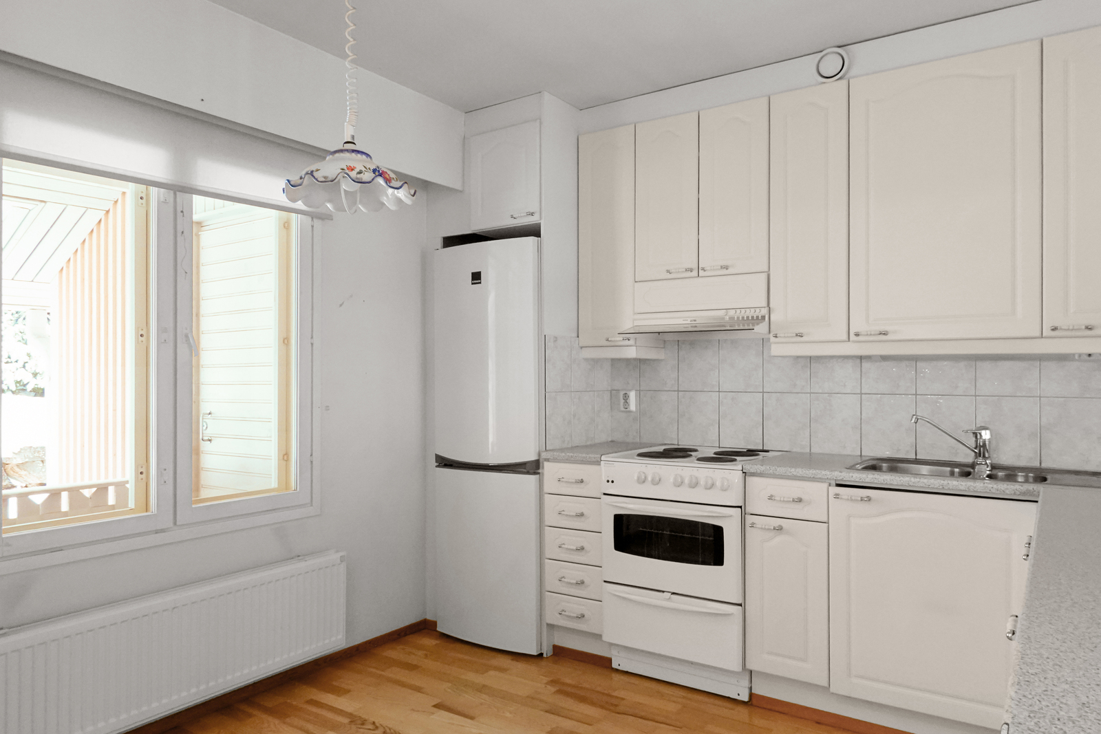 | Keittiön kuvaus | Lautaparketti, seinät maalattu, kaapistot, jääkaappi/pakastin, sähköliesi, liesituuletin |