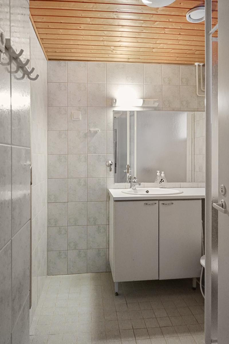 | Kylpyhuoneen kuvaus | Seinät ja lattiat laatoitettu, peili, allaskaappi, wc -istuin, pyykkikoneliitäntä |