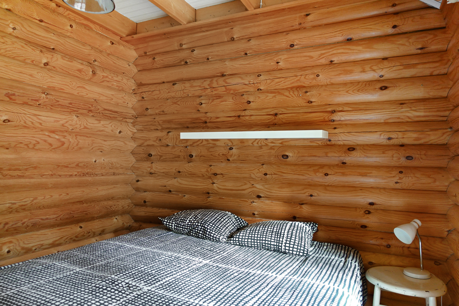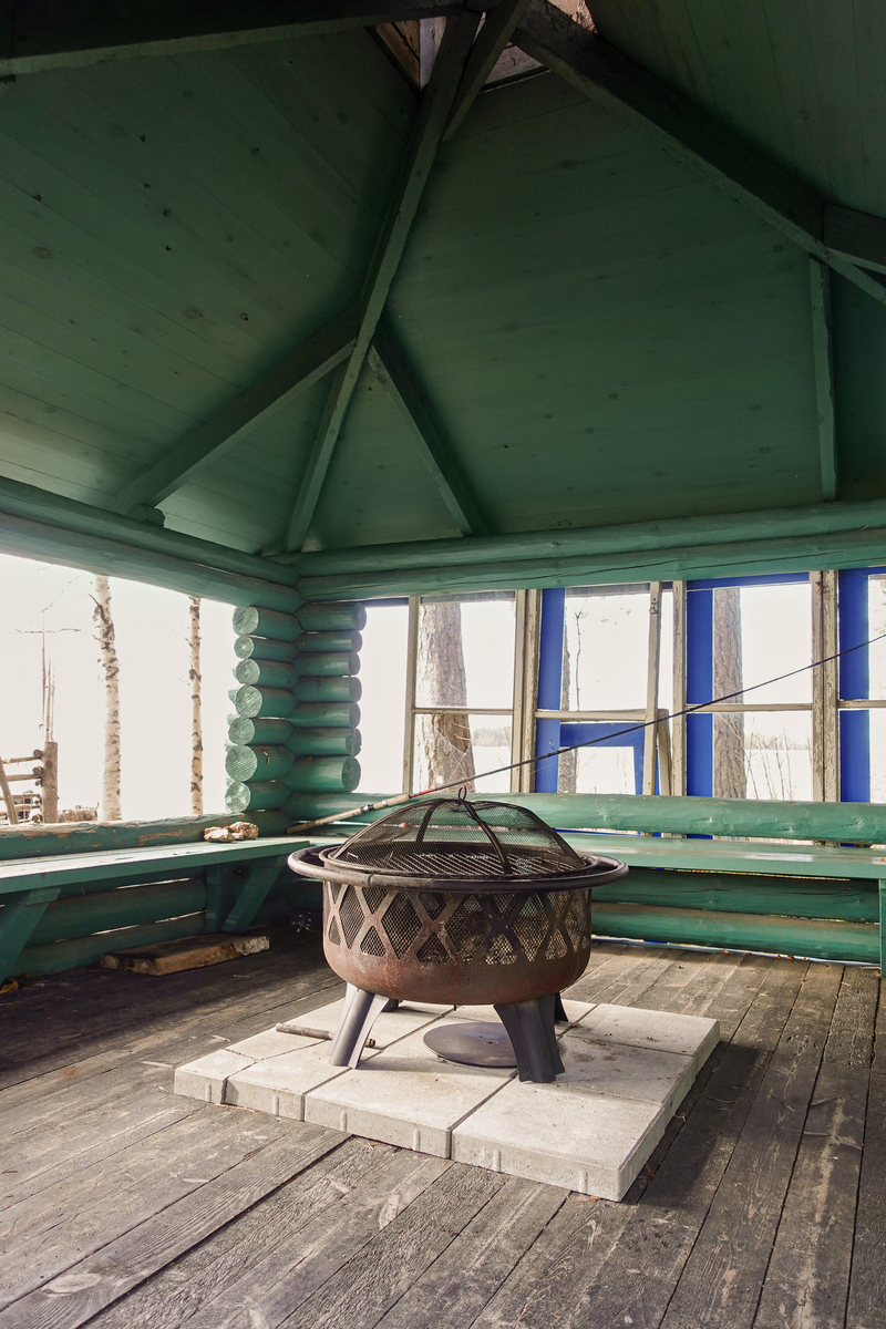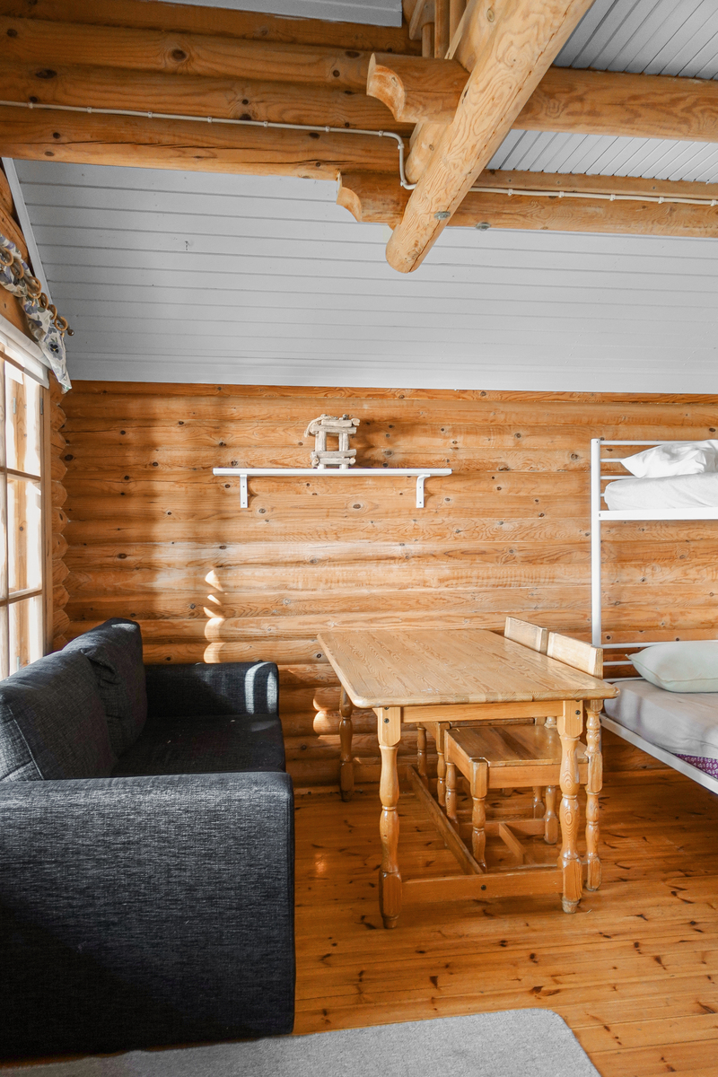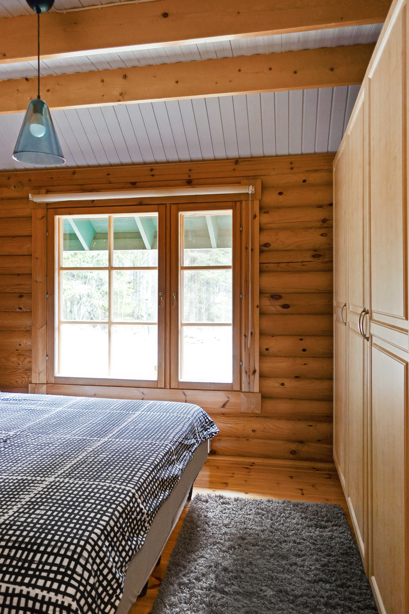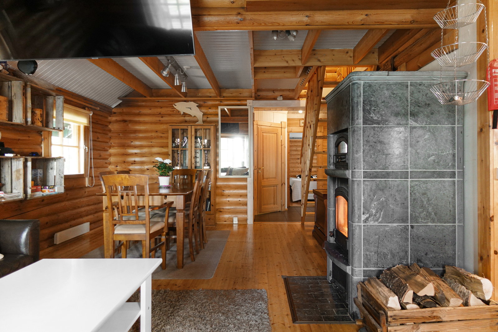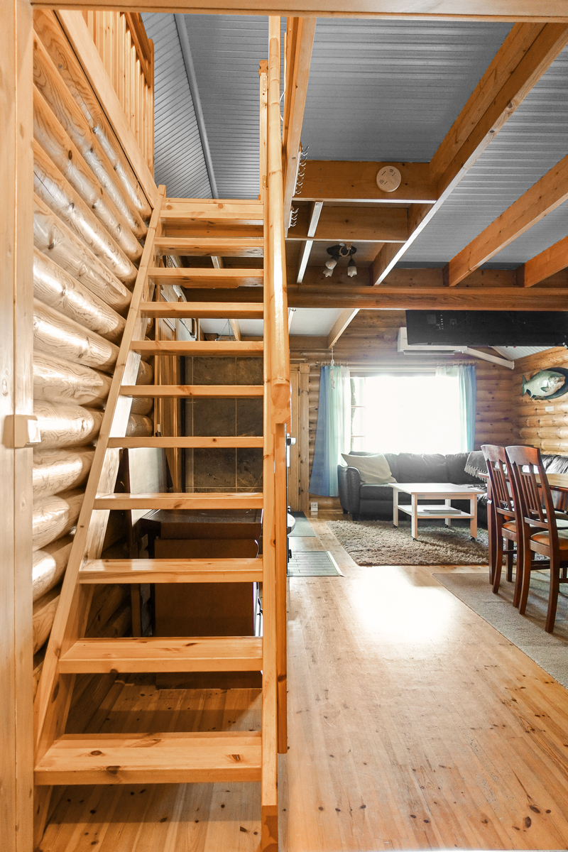 Lautalattia, hirsiseinät, paneelikatto. |