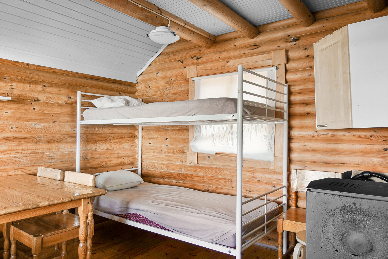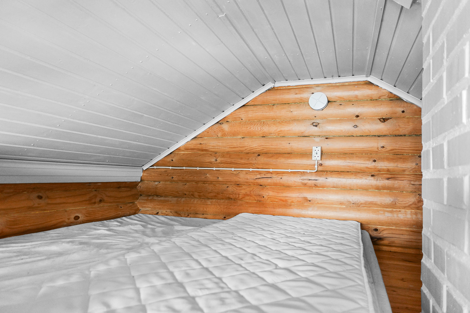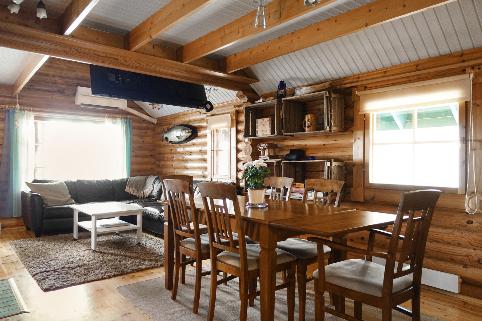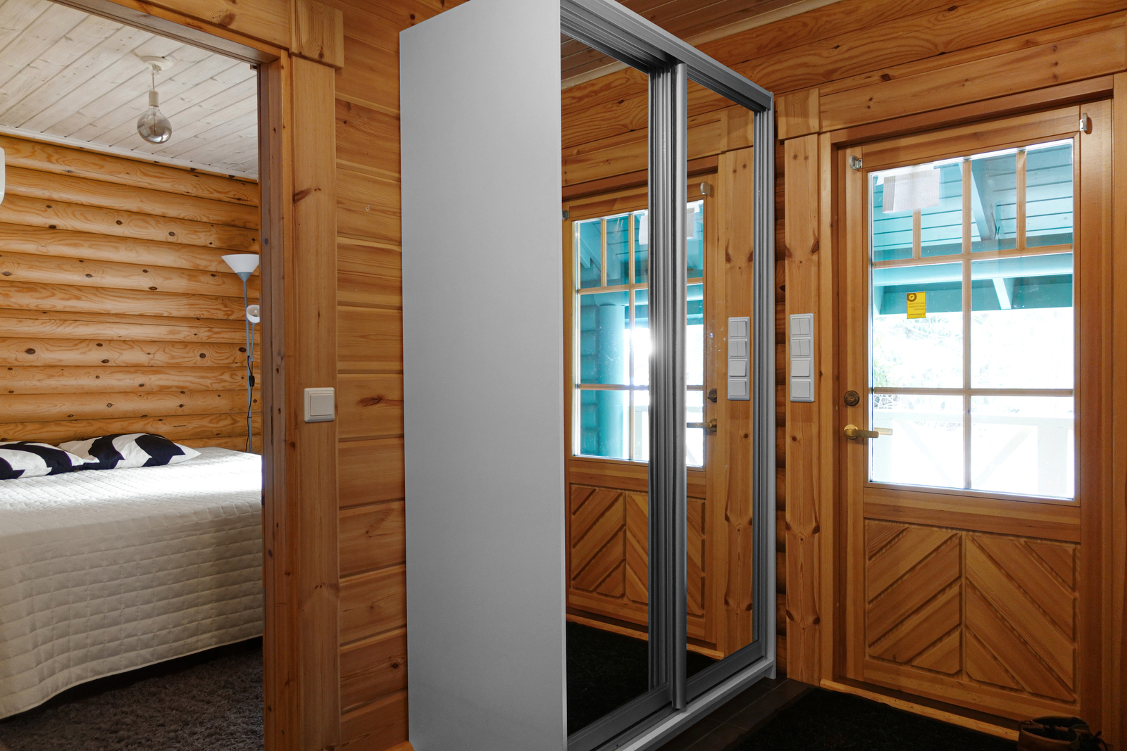 Lautalattia, hirsiseinät, paneelikatto. |