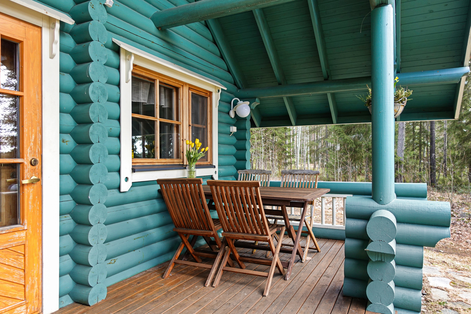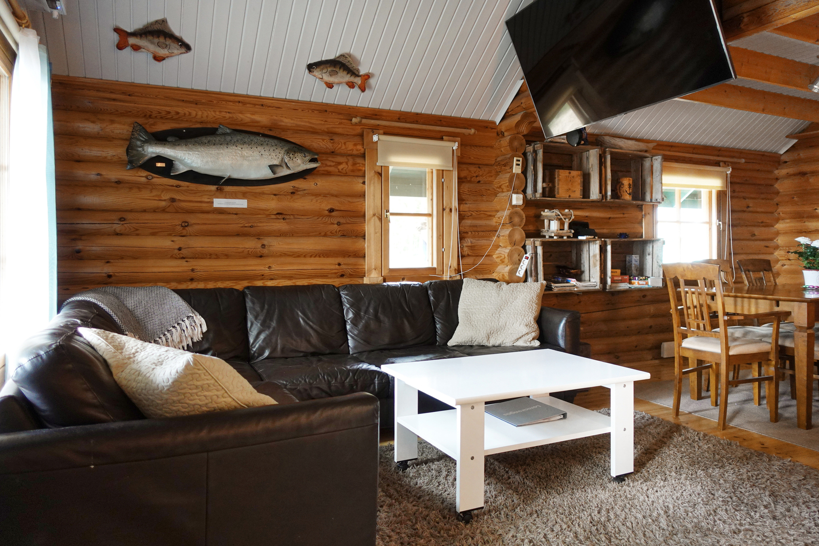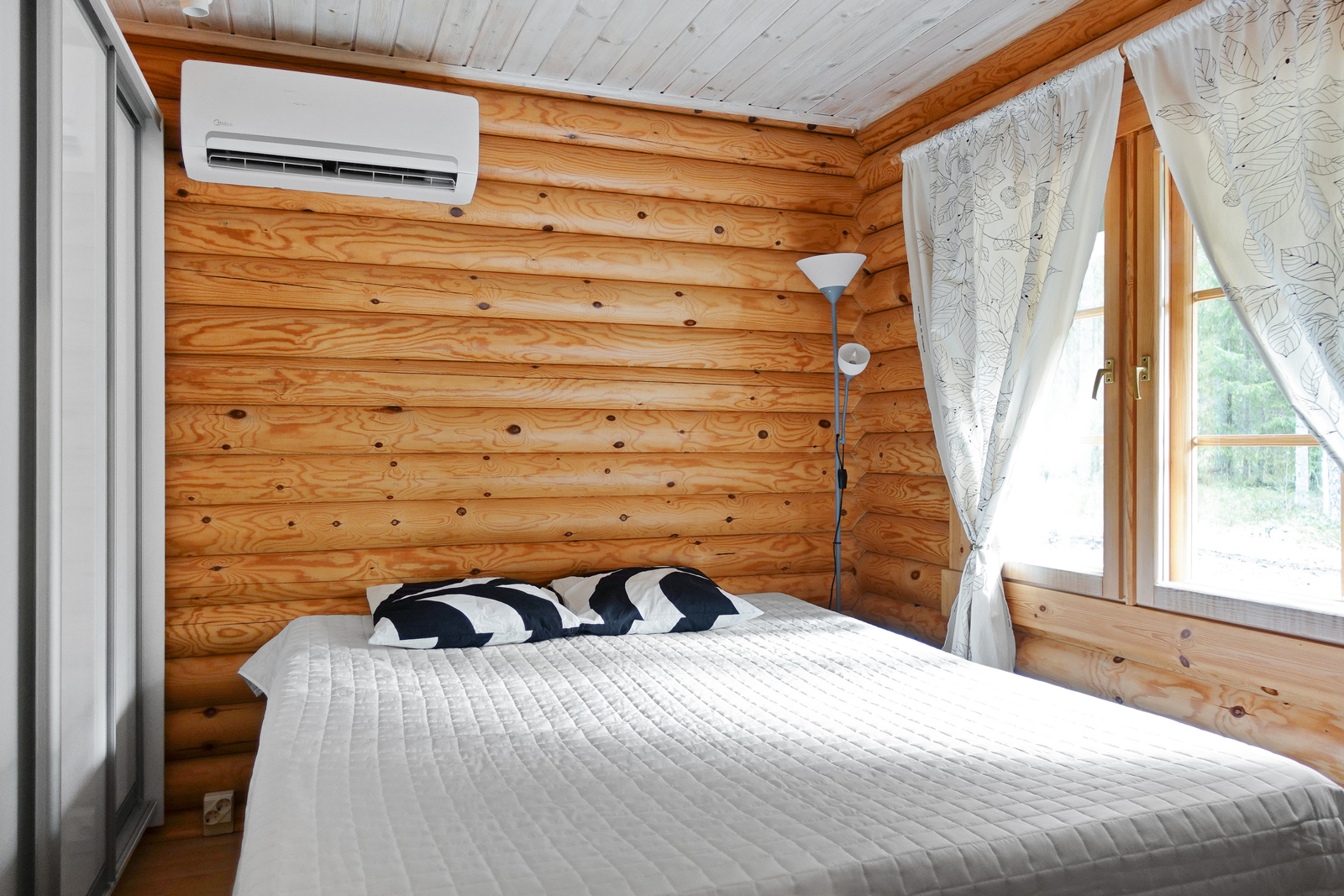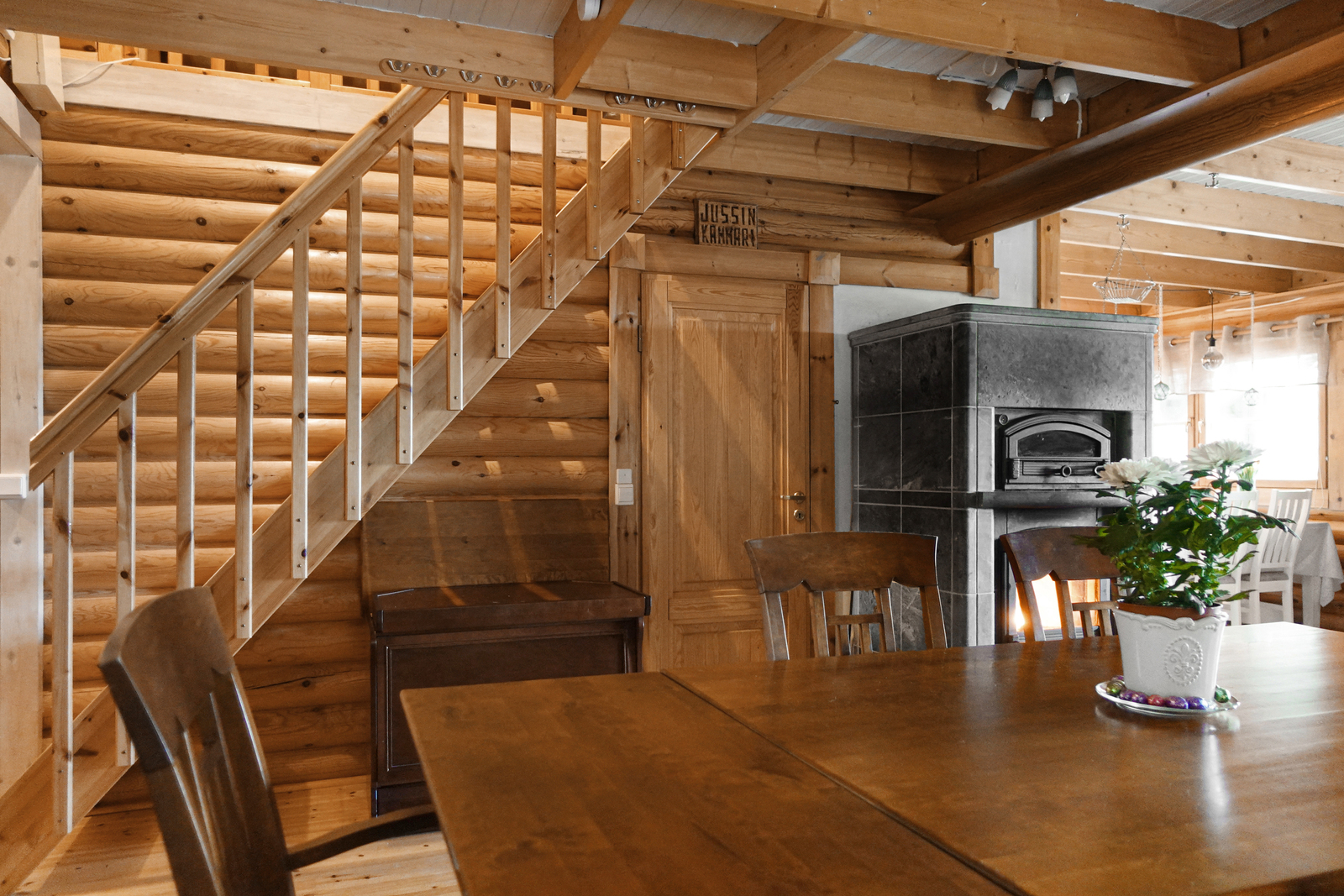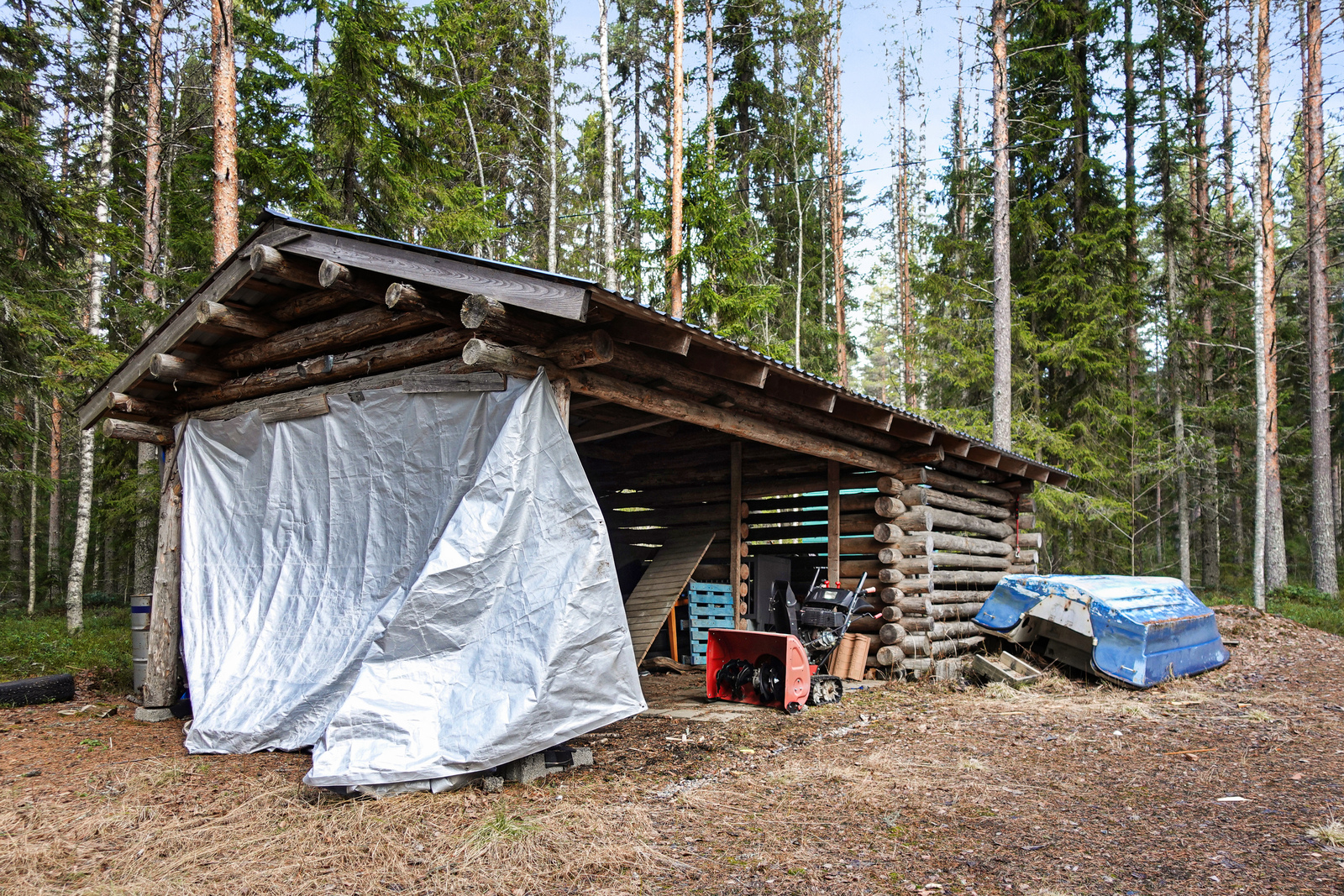 Lautalattia, hirsiseinät, paneelikatto. |