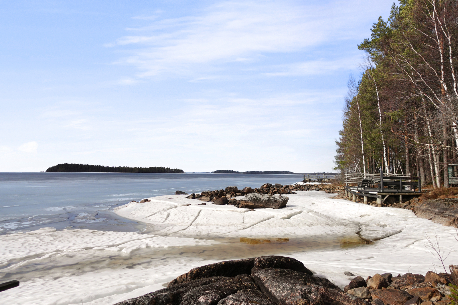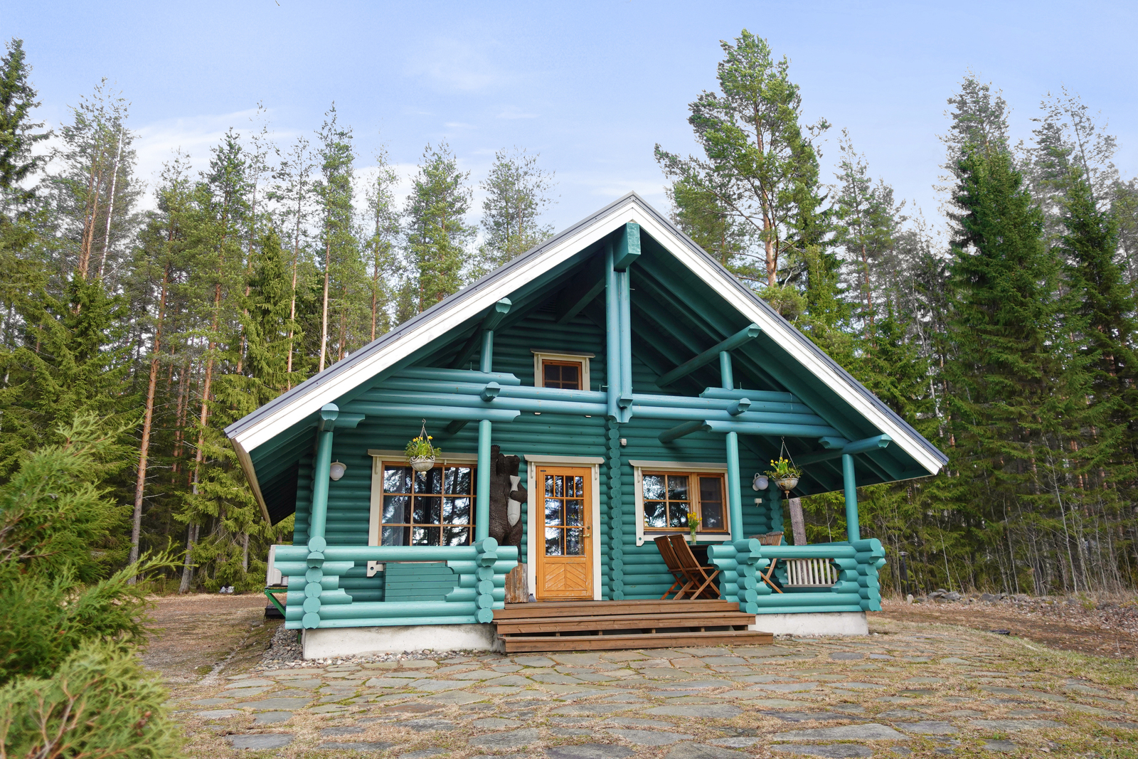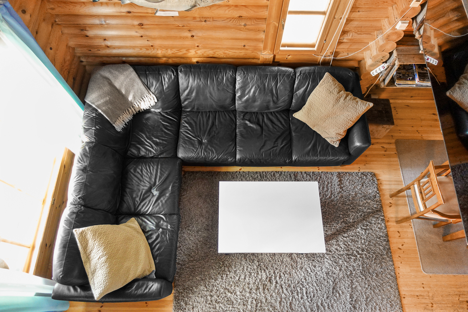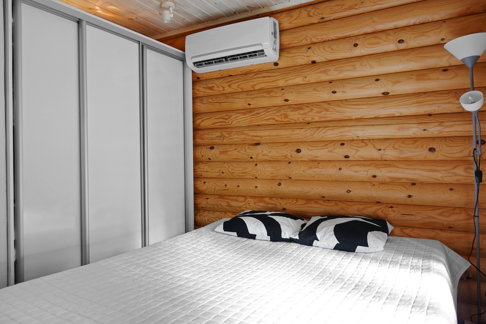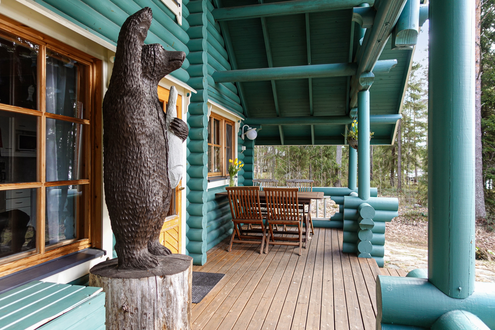 Lautalattia, hirsiseinät, paneelikatto. |