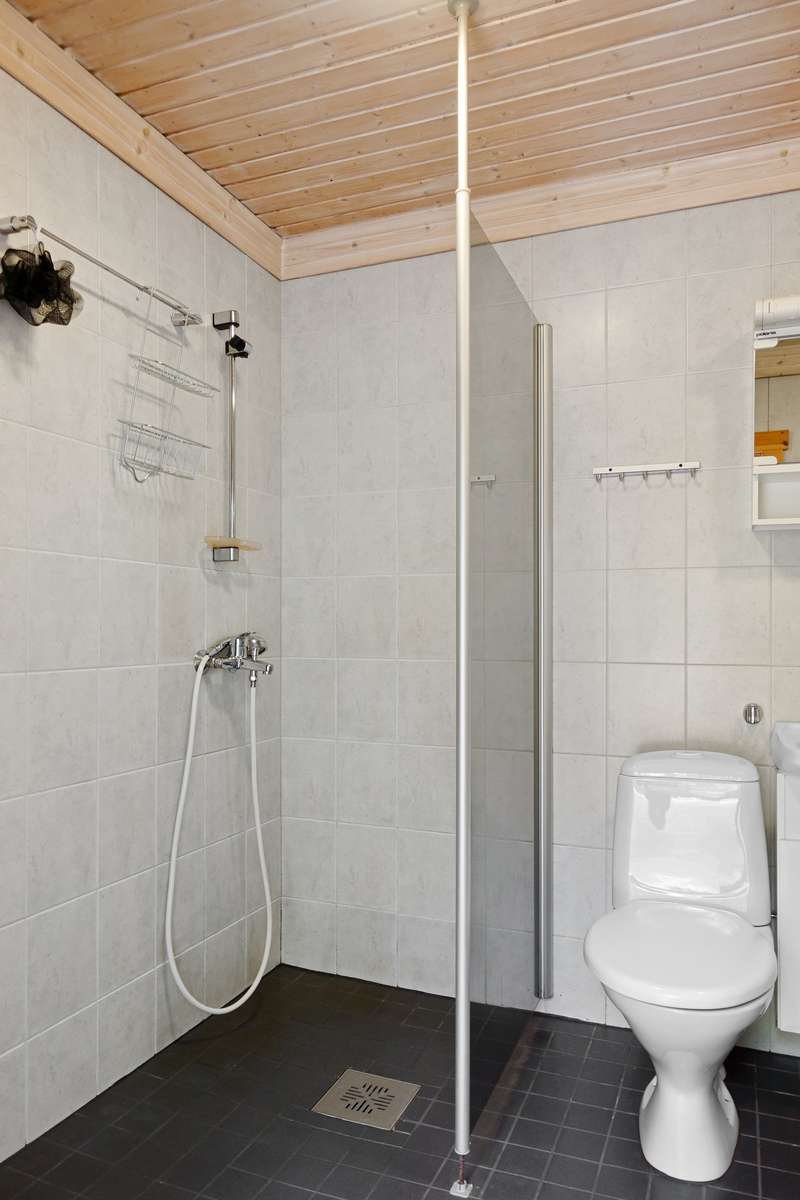 Laatoitettu lattia ja seinät, paneelikatto. Pesukoneliitäntä, allaskaappi, wc-pönttö, suihku. |