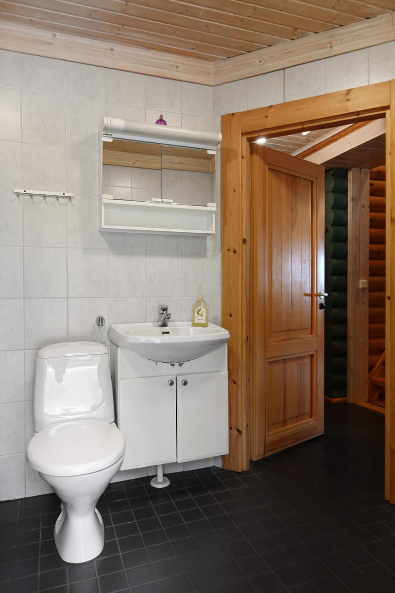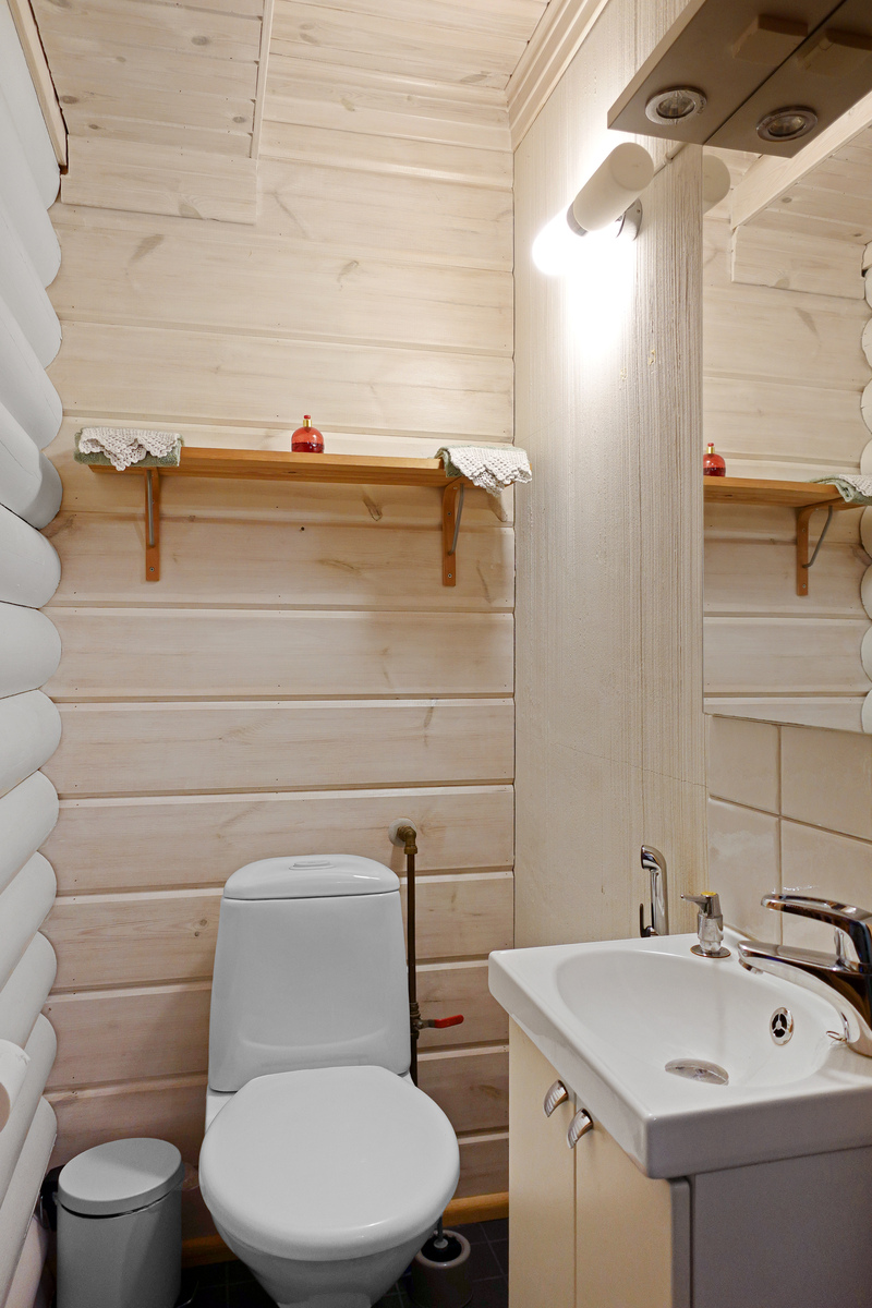 Laatoitettu lattia, hirsi/levyseinät. |